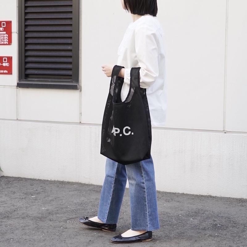 ポリエステルのメッシュキャンバス. ソフトな感触. 前にコントラストを付けたA.P.C.ロゴのプリント. ハンドキャリーまたは肩掛け可能. サイズ: 40 x 43 cm.