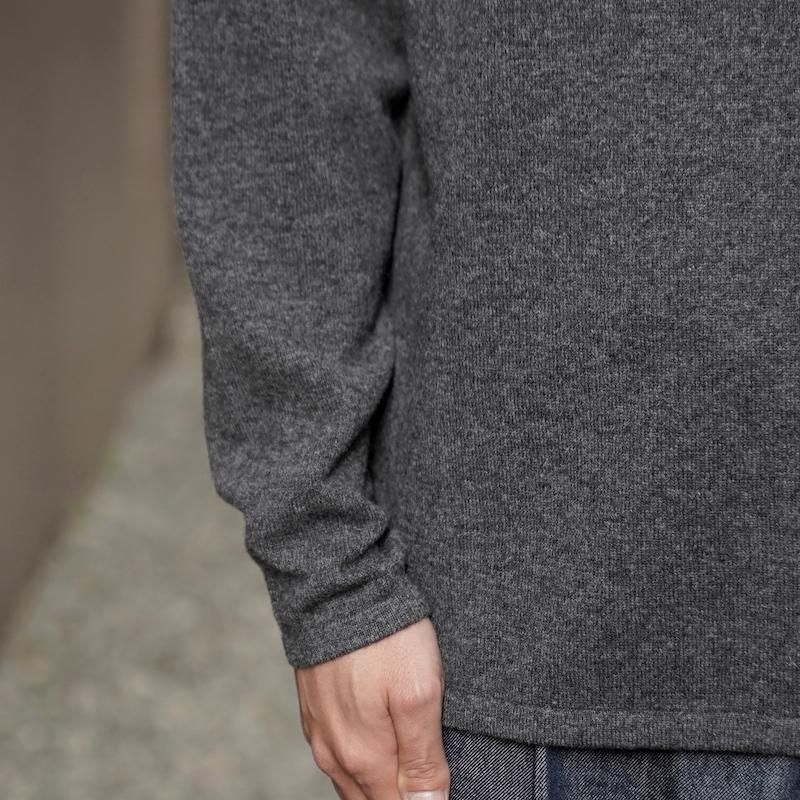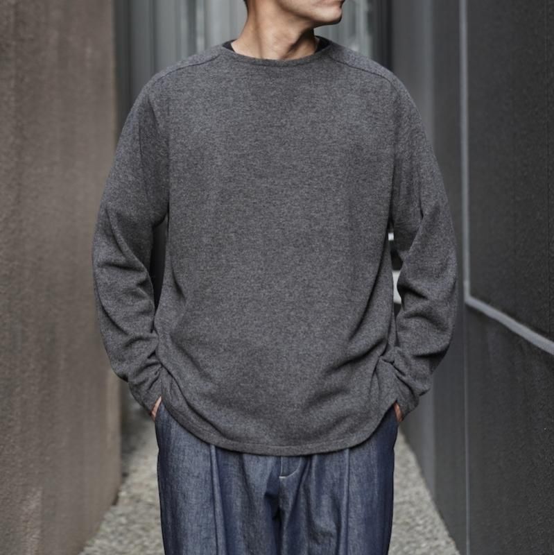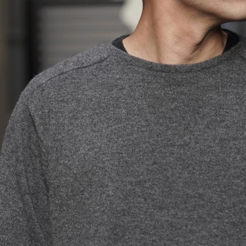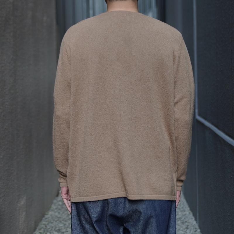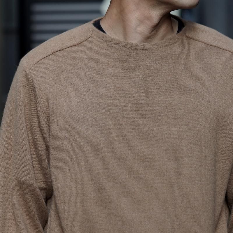 キャメル(ラクダ)の春に自然に抜け落ちた冬毛やブラシをかけてとれる毛のみを使用した糸で仕立てられた程よくボリューム感のあるニット生地を使用。キャメルは保湿性に優れ、羊毛の半分の重さで2倍温かいとさています。吸湿性は繊維の中で最も大きく、放湿力は羊毛よりすぐれているために、インナーとニットとの空間を快適にしてくれます。ややコシのある手触りと弾力、光沢のある軽さが特徴です。サドルショルダーの衿端をボートネックに合わさる構造にし、ネック端の強度と伸び、収まりの良さを作っています。しっかりとボリュームを感じますが、着用時にかなり軽さを感じると思います。キャメルの色は染色のないキャメル本来の色です。