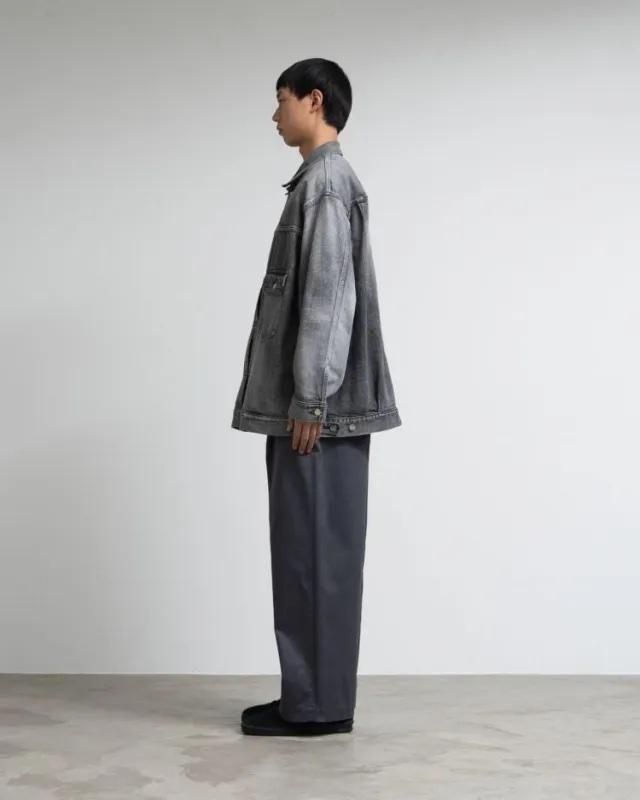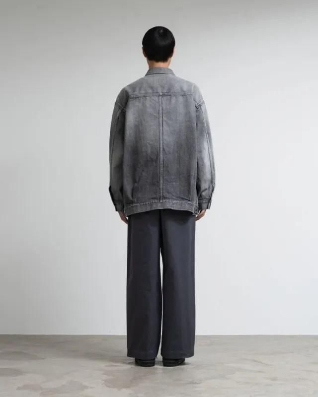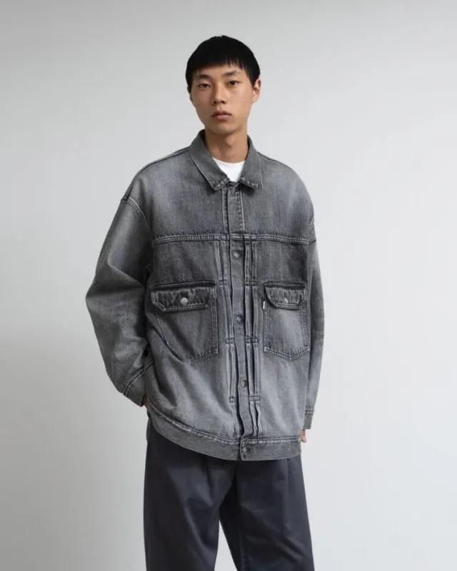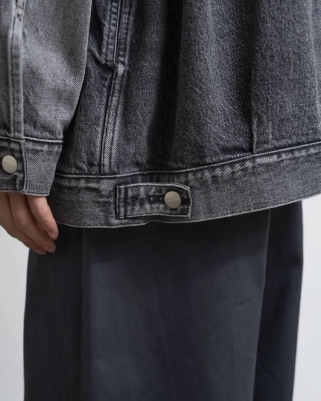 130年もの歴史を誇る米国Cone Denim社が作る13.75オンスのセルビッチデニム。今シーズンよりブラックデニムが仲間入り。旧式力織機でゆっくりと織り上げることで生まれる、生地表面のざらっとした凹凸やムラがデニム本来の風合いを感じさせる魅力的な素材。’50年代に誕生した往年のデニムジャケットのディテールを継承しながらも立体的にボリュームのあるシルエットを構築。ロゴの刻印入りのタックボタンを配し、クリーンなヌメ革のパッチが襟ぐりを飾る。長く使い込まれたような淡い色合いが特徴のライトフェイド。