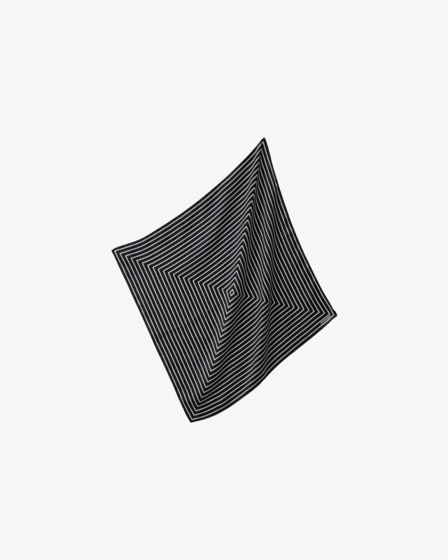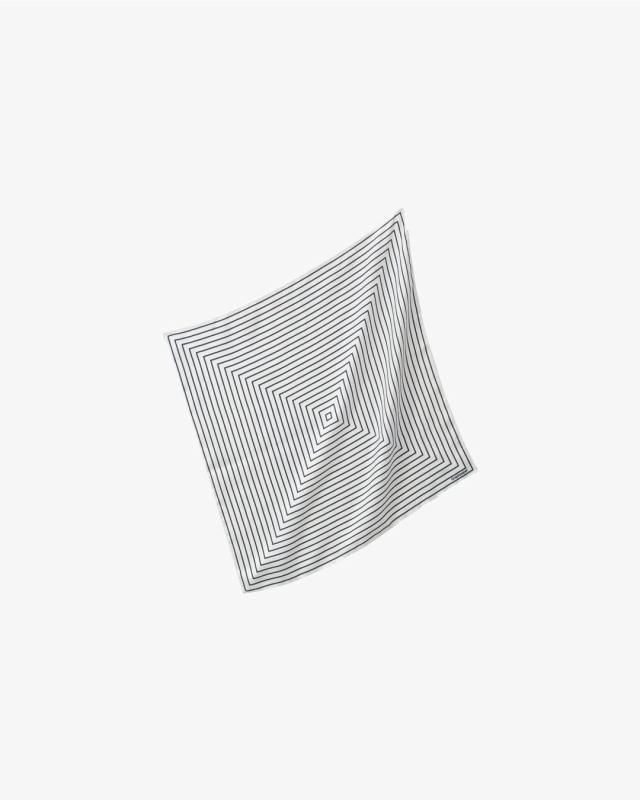 職人の手捺染で一つ一つ丁寧に仕上げた綾シルクスカーフ。幾何学的なストライプが今シーズンのコレクションを表現した一点。多方向に走るラインは、巻き方次第で様々な表情に変わりスタイリングを楽しませる。