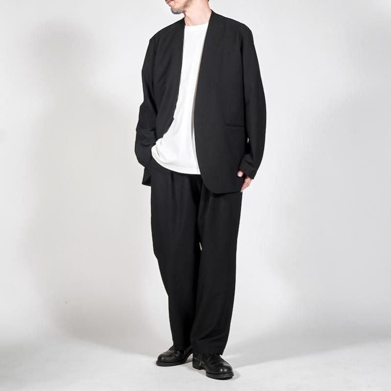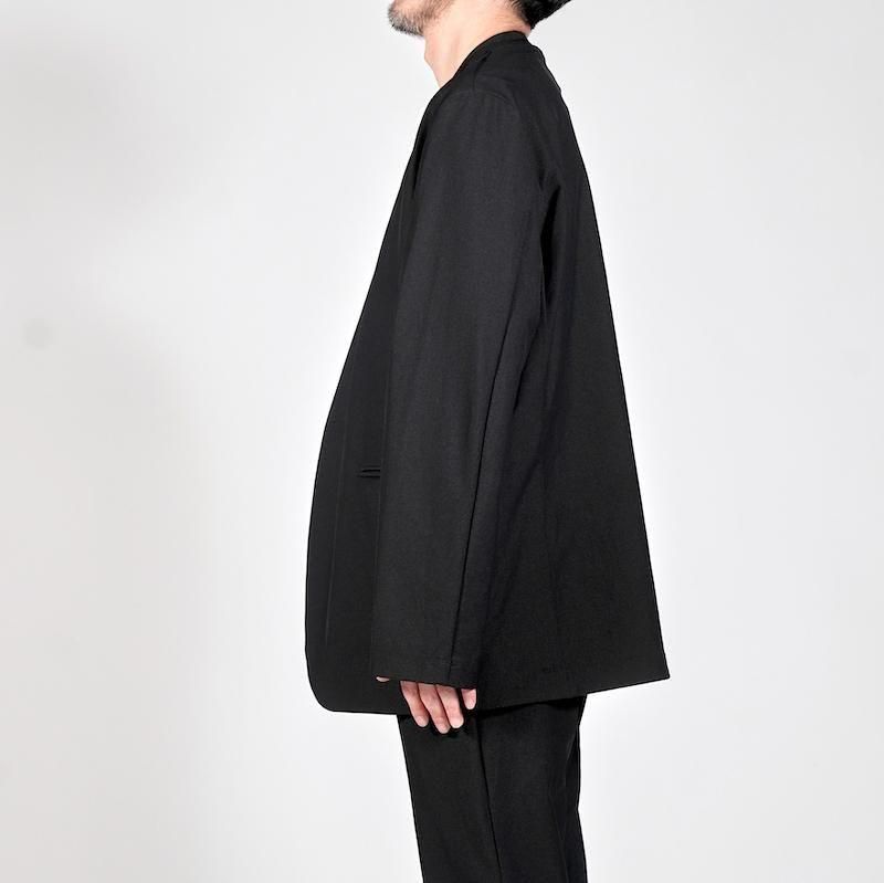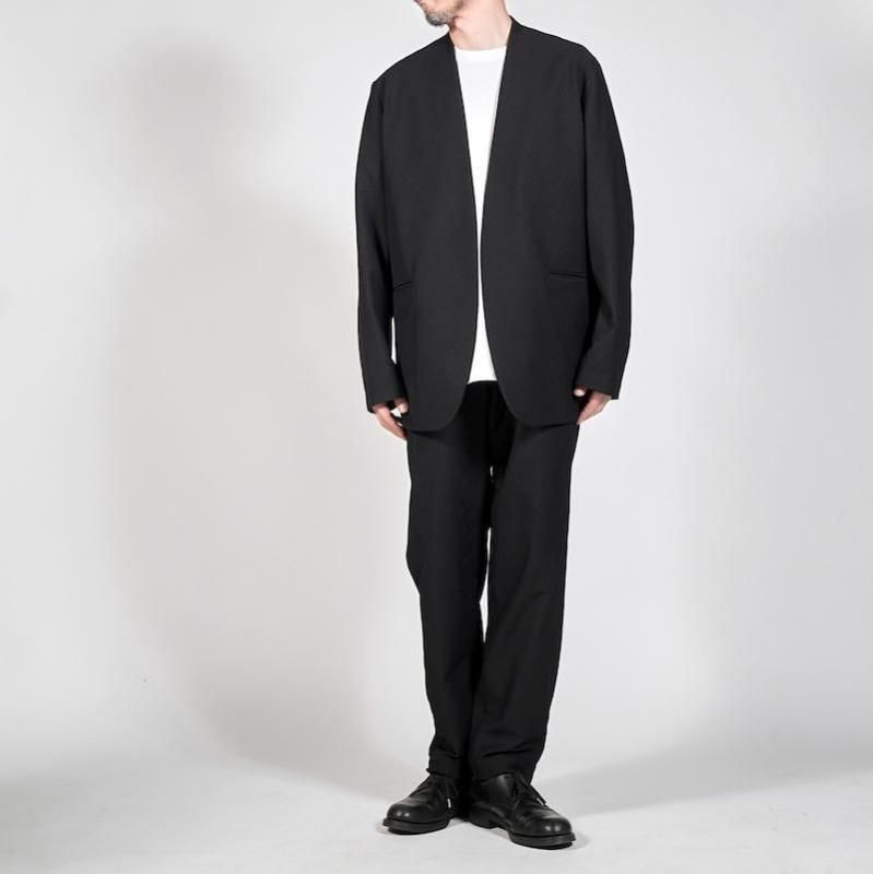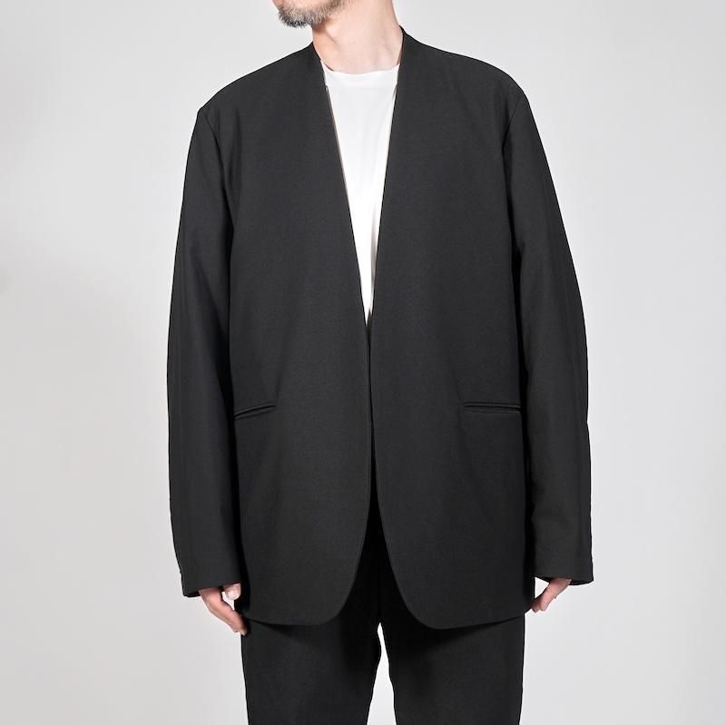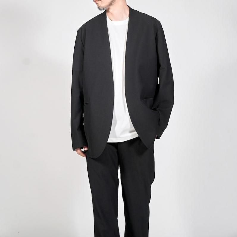 こちらからリリースされるノーカラーデザインのテーラードジャケット「Device JKT MINUS」。Device JKTと比較すると少し身幅も広く、少し着丈も長め。ボタンレスデザイン