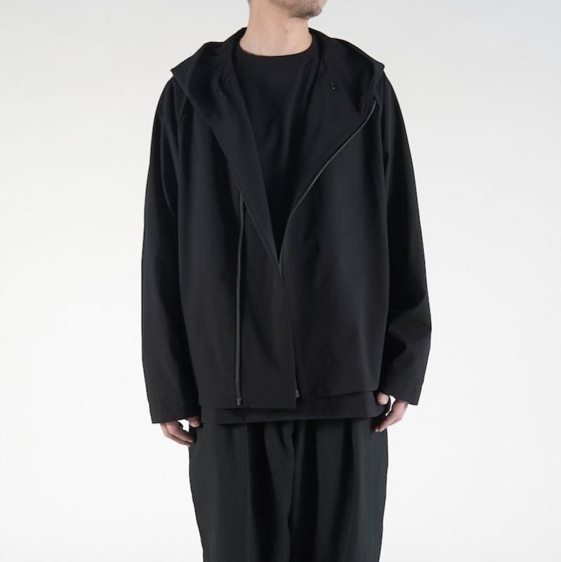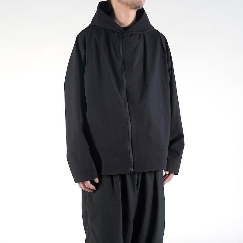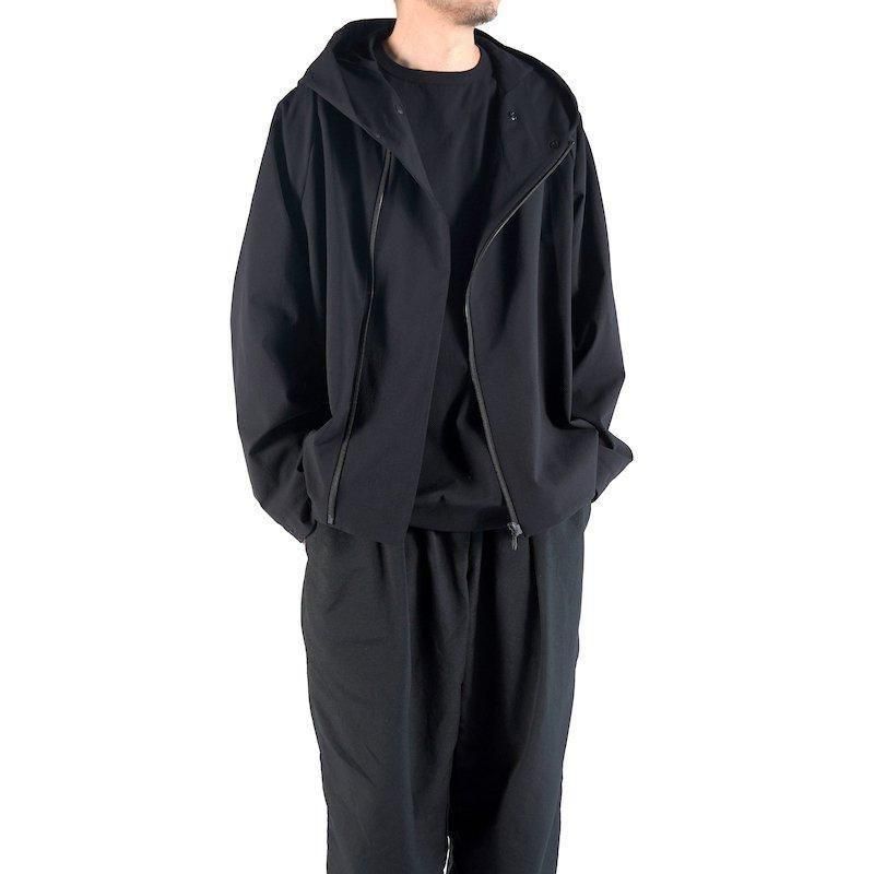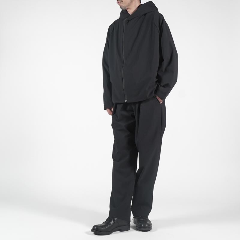 こちらは機内でのロングフライトのために開発されたSOLOMODULEシリーズからのリリースとなる"Cartridge Hoodie"。ショート気味の着丈、身幅とアームホールにたっぷりゆとりを持たせたジップパーカーです。ショルダー部分の特殊な切り替えにより肩周りの可動域を広げ快適性を高めると共に、テアトラ独自のシルエットを表現。首元に収まりを良くする為のスナップボタン、大きめのフードなど、オーセンティックなフーディーに比べ、移動やホームワーク、リラックスすることが最優先のシチュエーションのために開発されています。