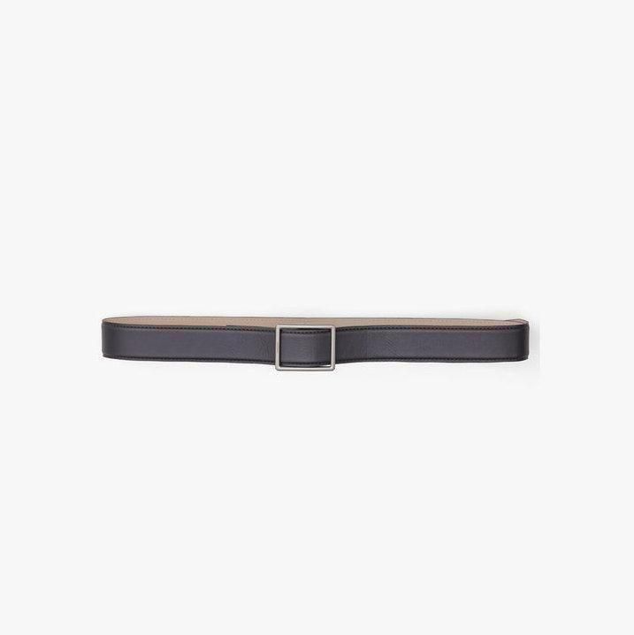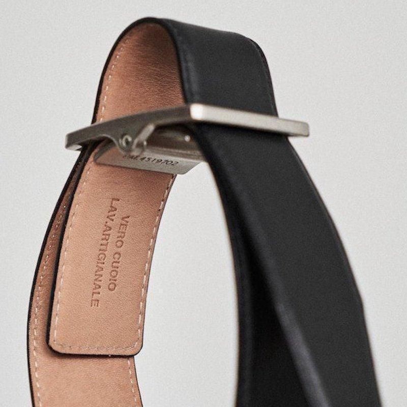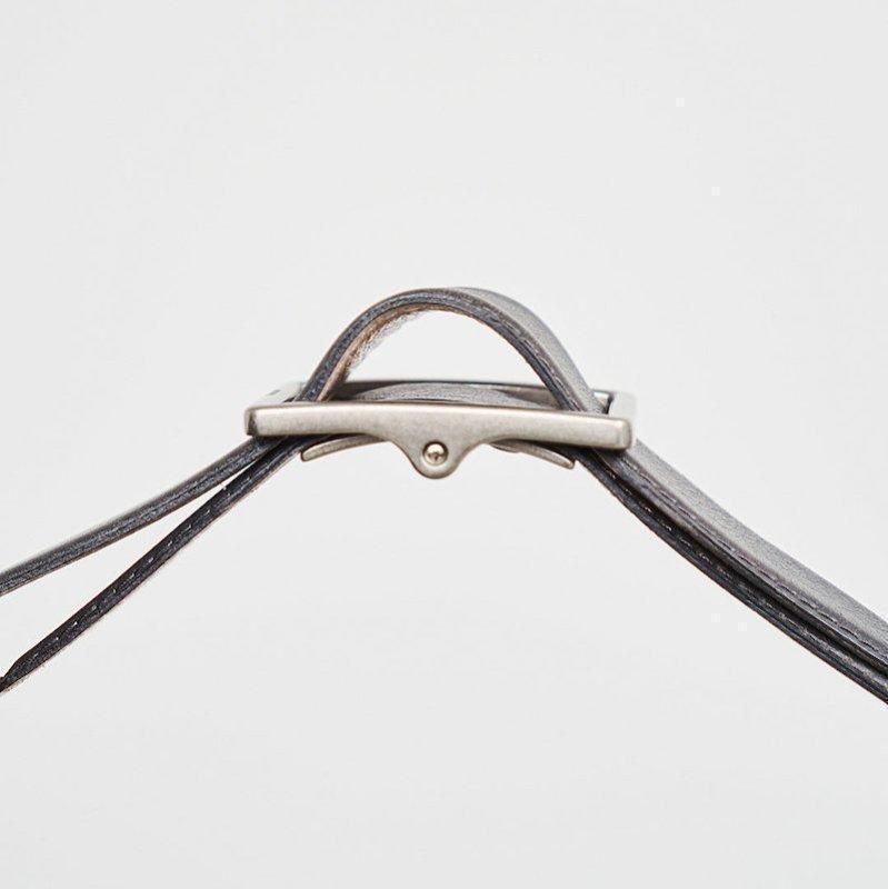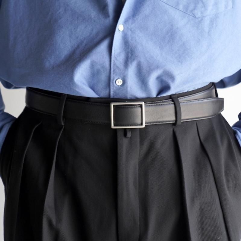 使用したレザーはオイルをたっぷりと含み、しっとりとした質感としなやかさが特徴のイタリア産の牛ショルダー。使い込むうちに艶が出て味のある経年変化を楽しめる。ブラックはベルト帯の中央を盛り、縁にステッチを飾るフェザー仕立てに。