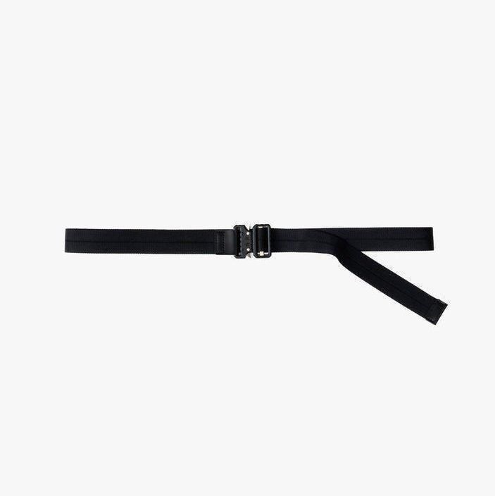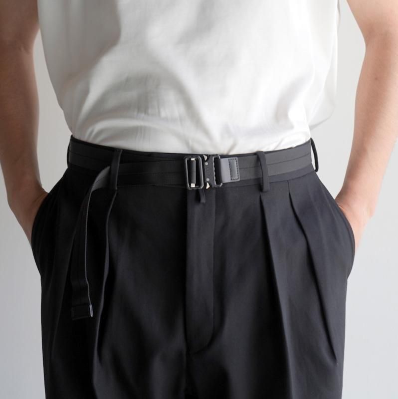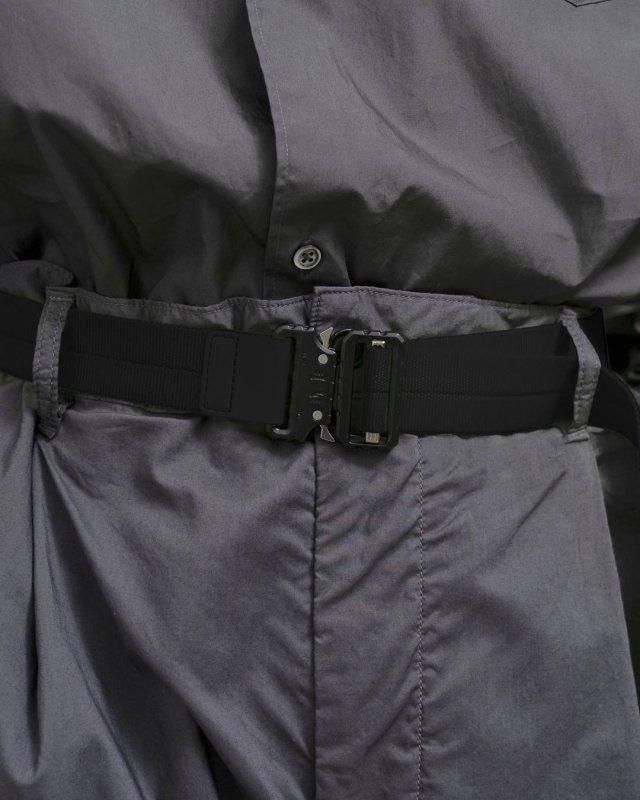 薄くしなやかでありながら強靭に織り上げたウェビングとワンタッチで脱着可能なミリタリーバックルのリガーズベルト。30mmのベルト幅にすることでボトムスを選ばずに使用できる。