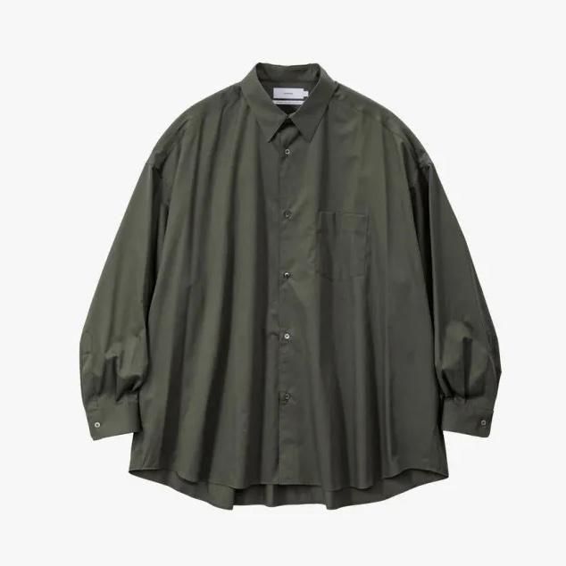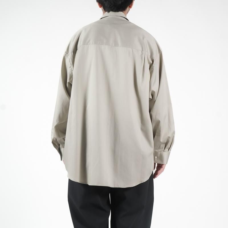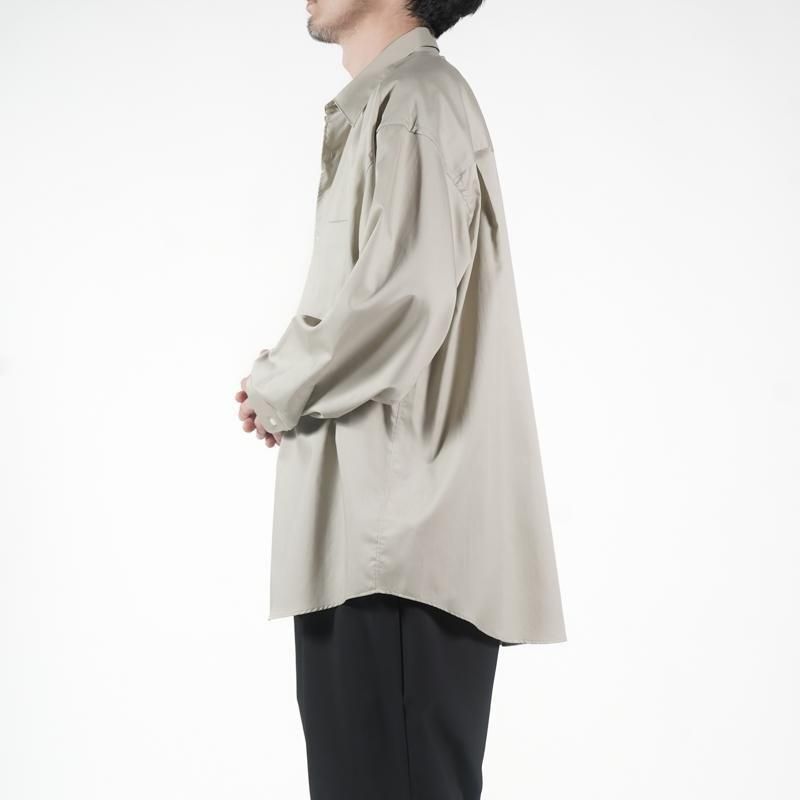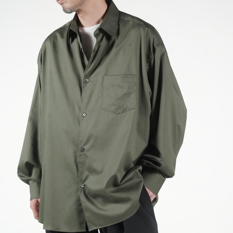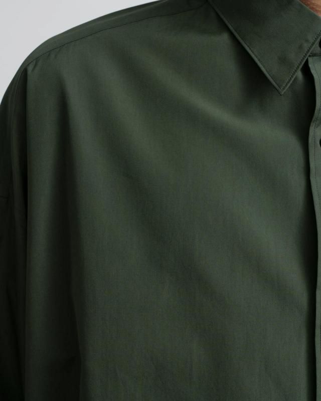 超長綿で織りあげた平織り生地にシリコンを原料にした特殊樹脂を含浸することで生地に反発感とハリ感を持たせ、さらにバイオ加工を合わせることで滑らかで柔らかい風合いを表現した素材。綿100%と思えないシルクのような質感が特徴。 ドロップショルダーでボリュームのあるボックスシルエットのレギュラーカラー。肩の傾斜や低く下げられたヨークの位置、アームホールの広さなど、細かなディテールを特異なバランスで仕上げたビッグシルエット。