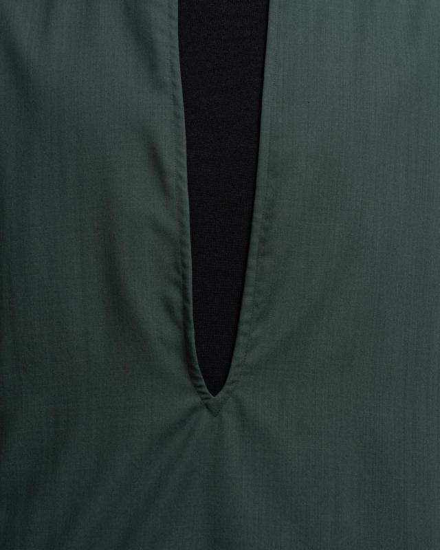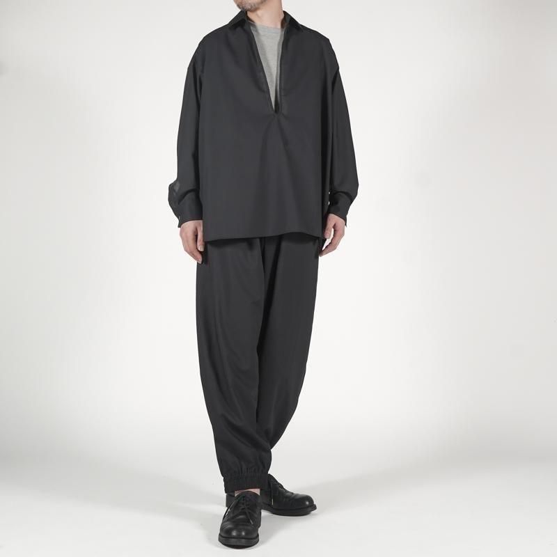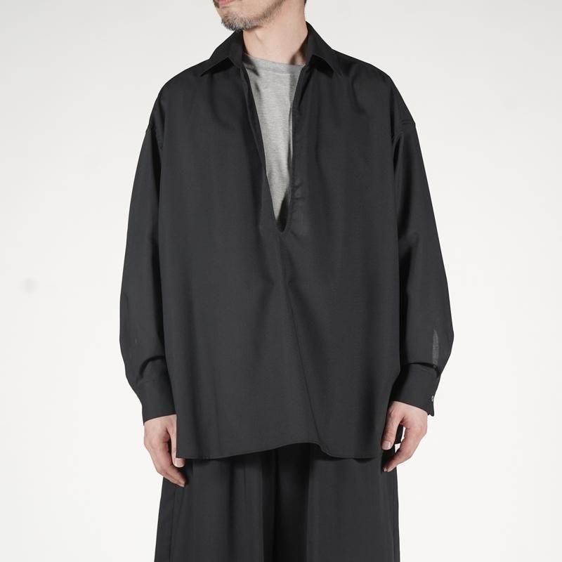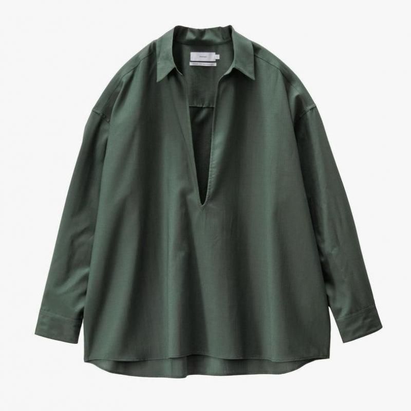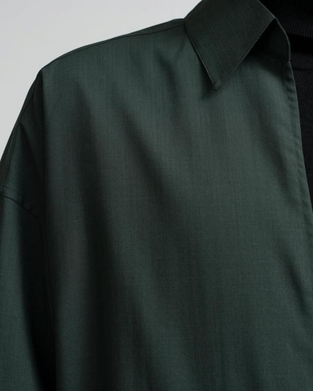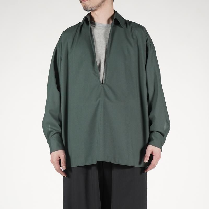 特殊な紡績技術によって、ウールの持つ自然な風合いを損なうことなく、ナイロンの優れた形態安定性および耐久性を兼ね備えた、ハイブリッドなウールトロピカル。深く空いたVネックが品の良いスタイリングを演出するスキッパーシャツ。