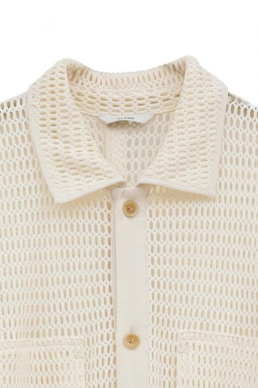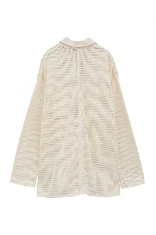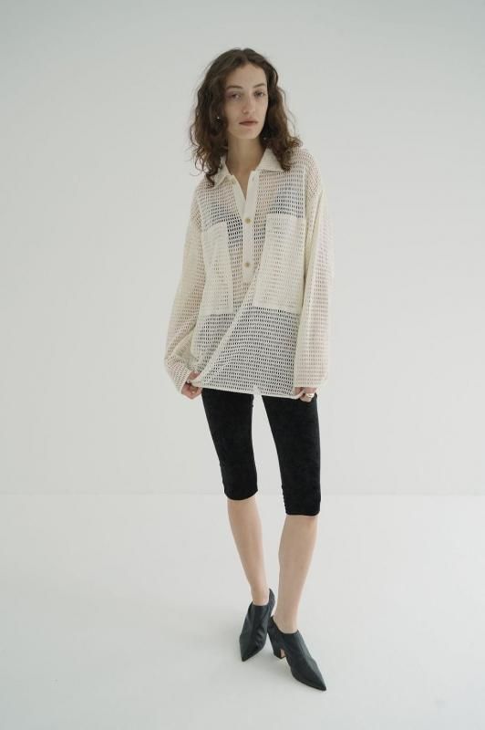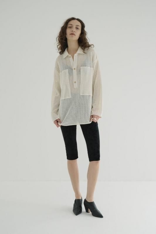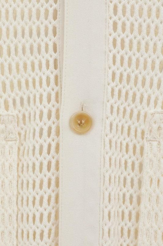 身頃にはふわっと肌あたりの良いメッシュ素材を、前立て部分にはドライタッチなジョーゼットを使用し、異素材のコントラストがさりげないアクセントに。