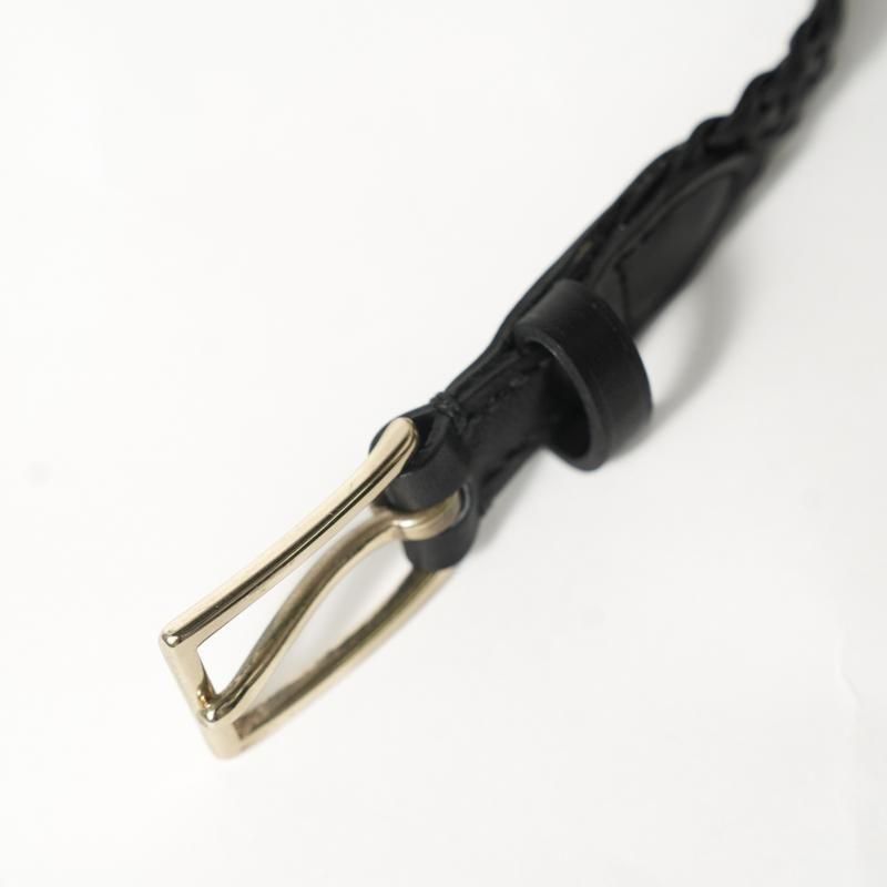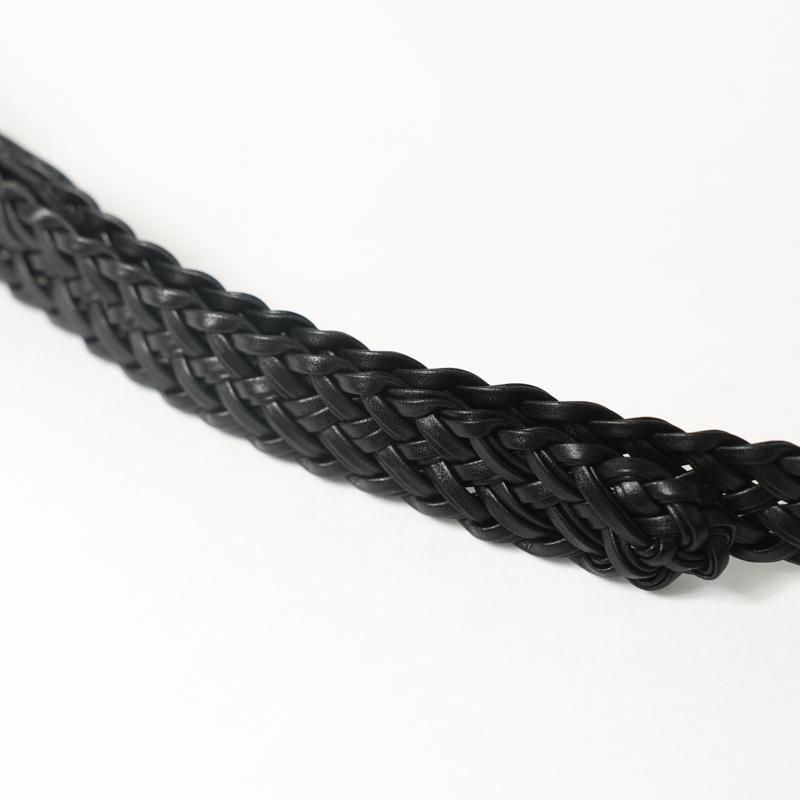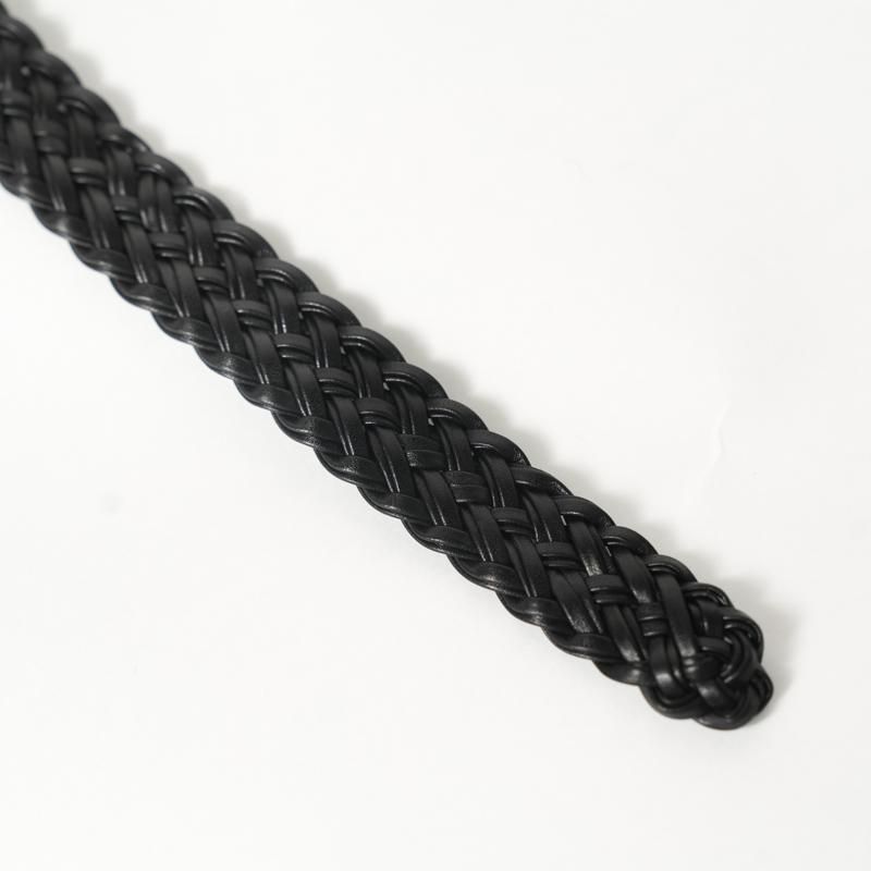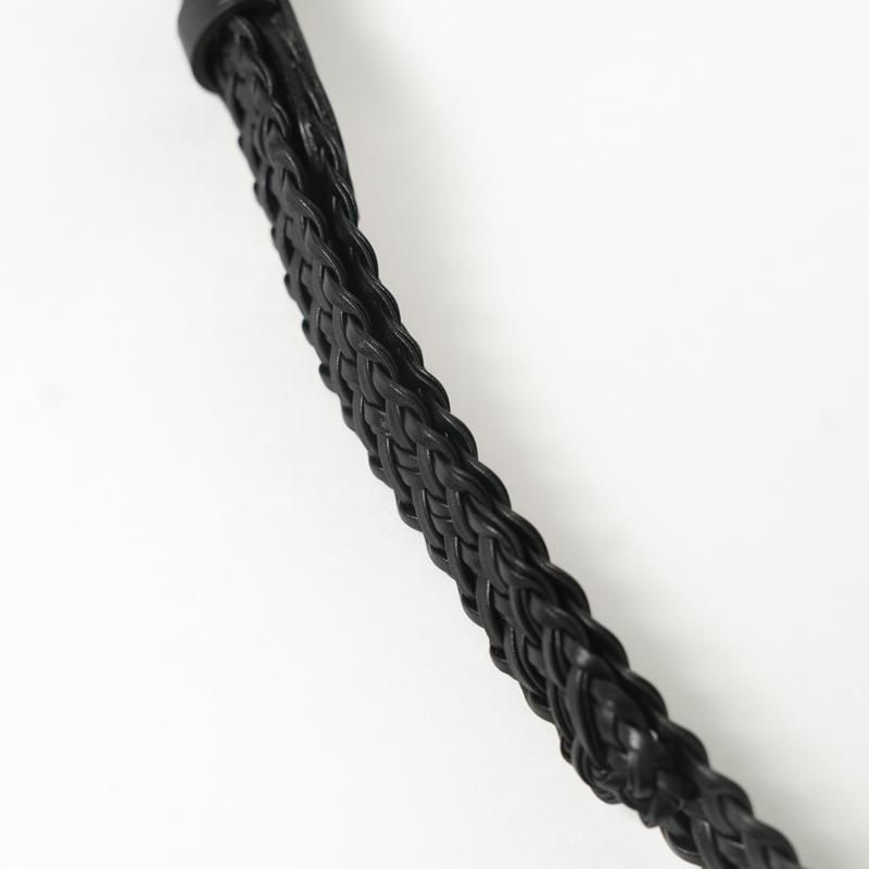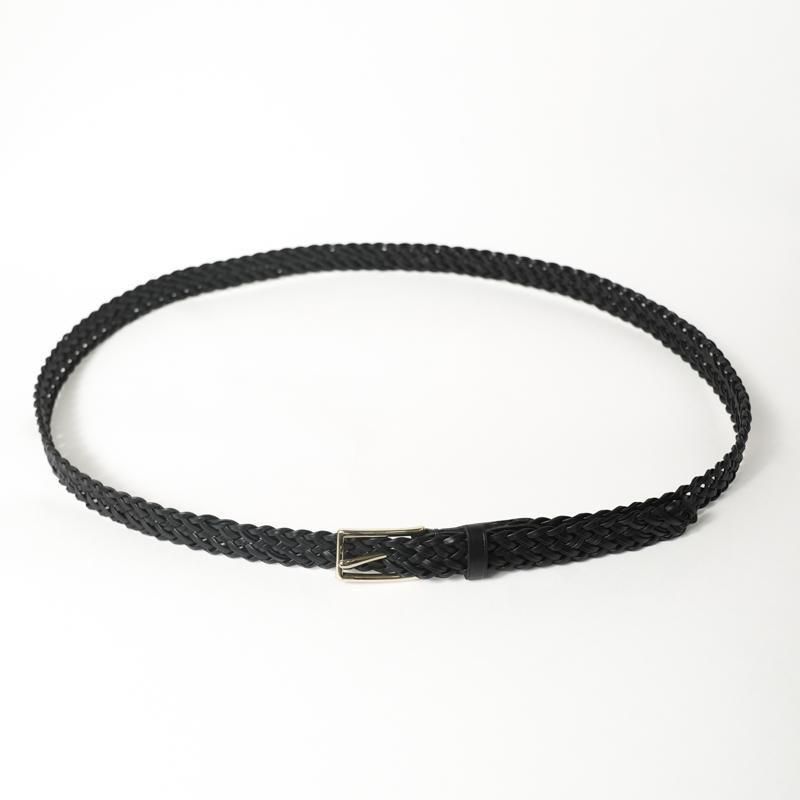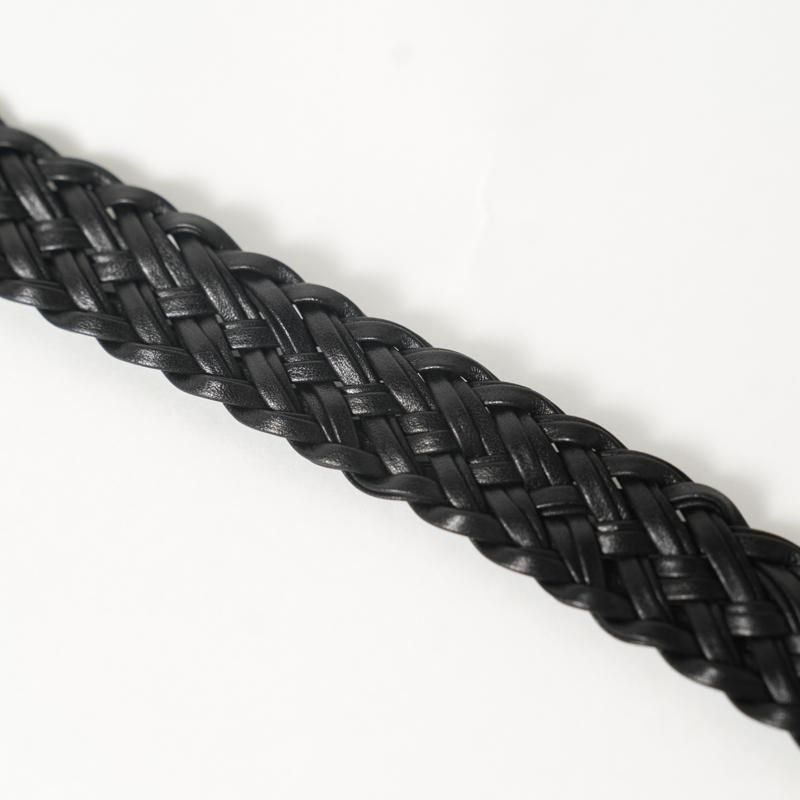 細くカットしたレザーをテープ状にし、2本ずつ束ね編み込むことで床面が出ない仕様に。幅約2cmの細いベルトながら、レザーの規則的で大変美しい編み目により存在感があります。上品なゴールドカラーのオリジナルバックルにより品のある佇まいに。ドレスからカジュアルのアイテムまで、幅広く対応可能な高い汎用性◎ 若干長めのメッシュベルトはフリーサイズのため体型の変化にとらわれず長く付き合える一本です。