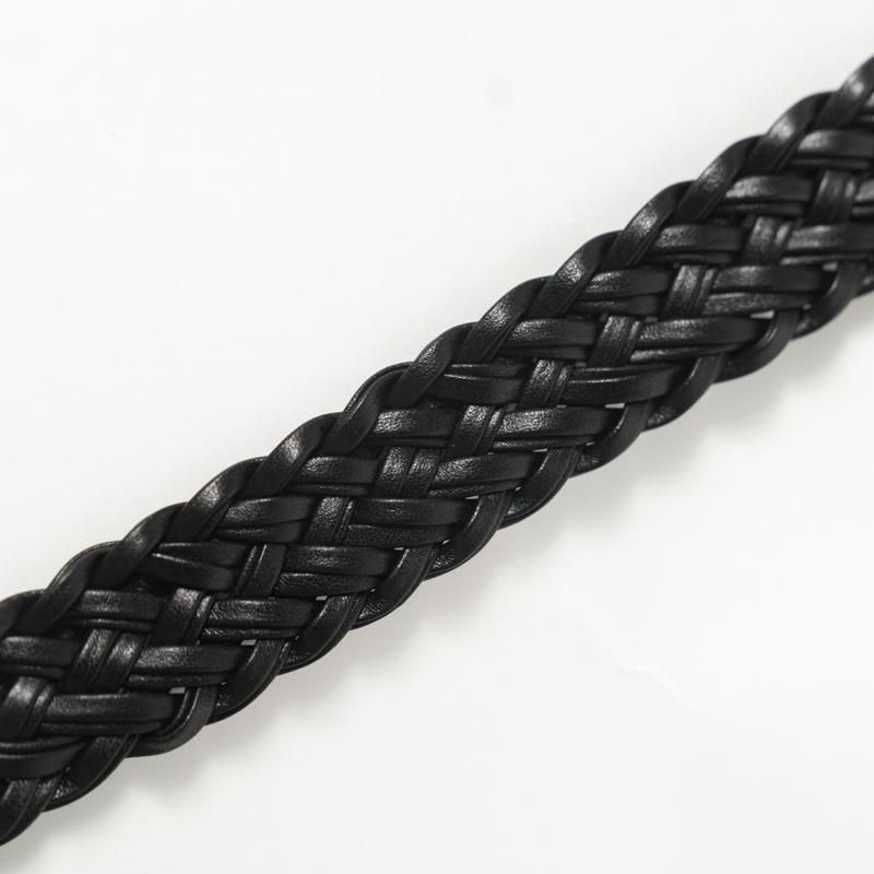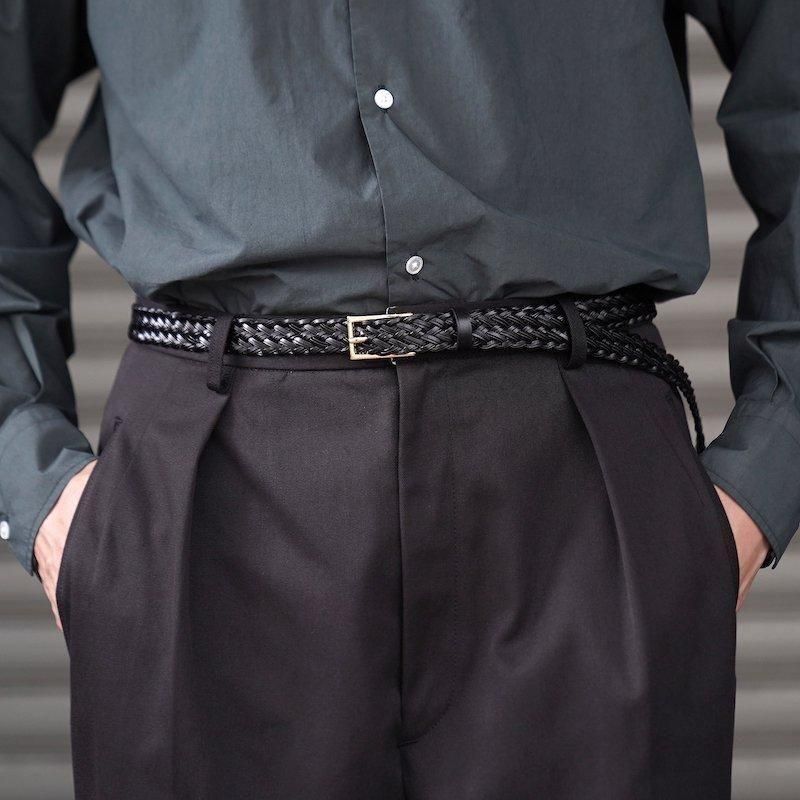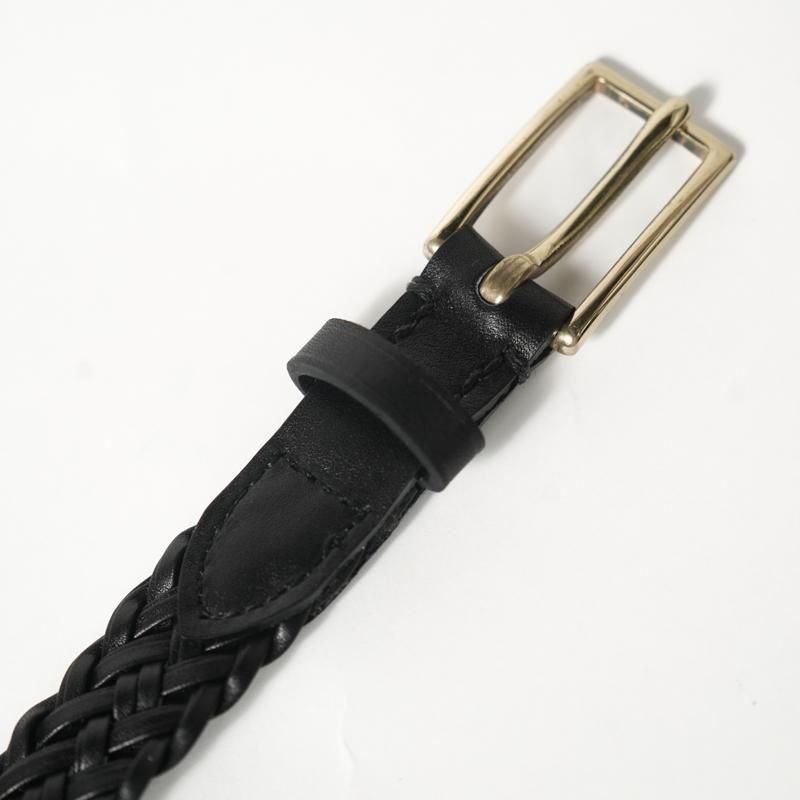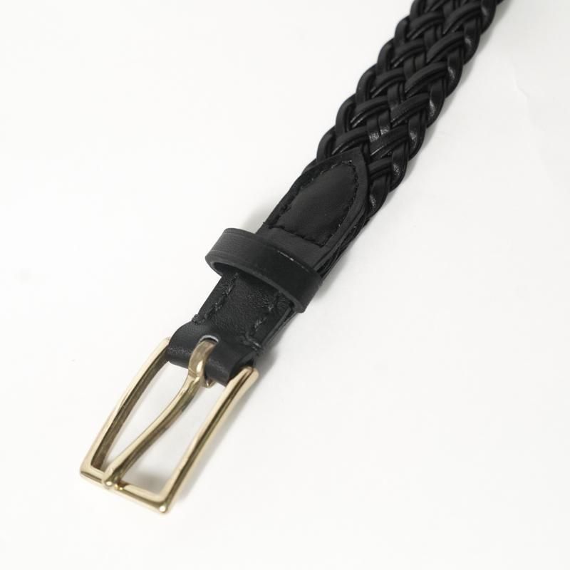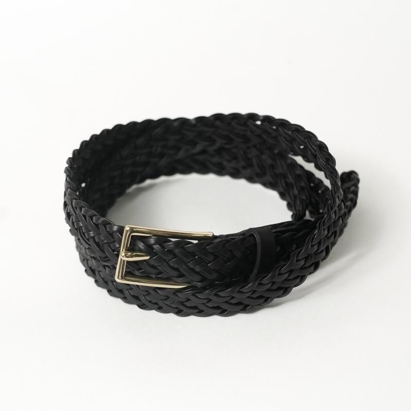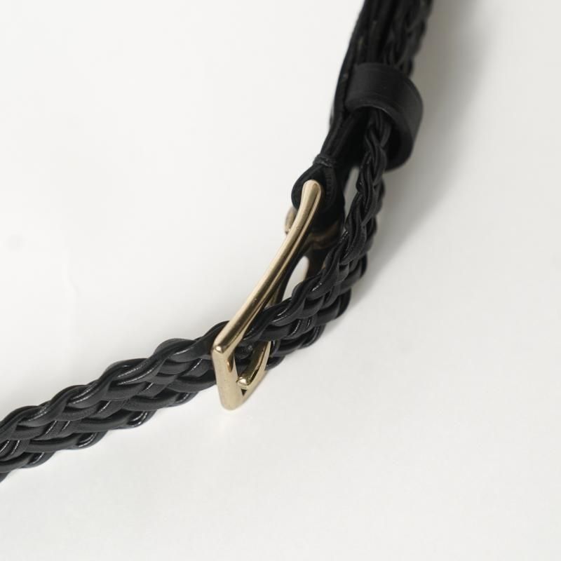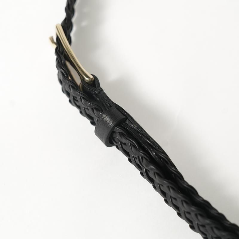 細くカットしたレザーをテープ状にし、2本ずつ束ね編み込むことで床面が出ない仕様に。幅約2cmの細いベルトながら、レザーの規則的で大変美しい編み目により存在感があります。上品なゴールドカラーのオリジナルバックルにより品のある佇まいに。ドレスからカジュアルのアイテムまで、幅広く対応可能な高い汎用性◎ 若干長めのメッシュベルトはフリーサイズのため体型の変化にとらわれず長く付き合える一本です。