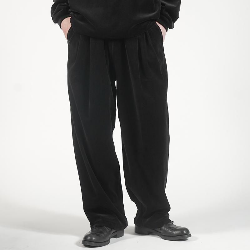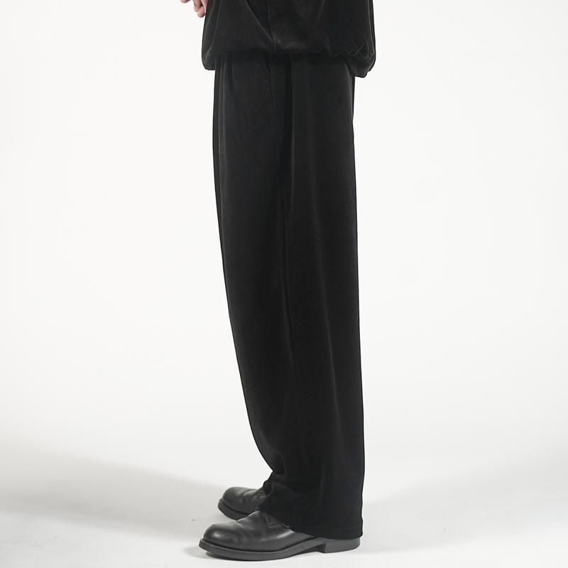 ウエストはゴムとドローコード仕様で快適な穿き心地。2タック入りの立体感あるワイドシルエットが、リラックス感と端正さを併せ持つワイドトラウザーのようなボトムス。カジュアルに見えがちなベロアを、高密度ハイゲージで編み立てることで度目を詰め、ナチュラルかつ上品な光沢とダレにくさを両立。オーガニックコットンをコンパクト紡績することで毛羽を抑え、シャープな表情に。