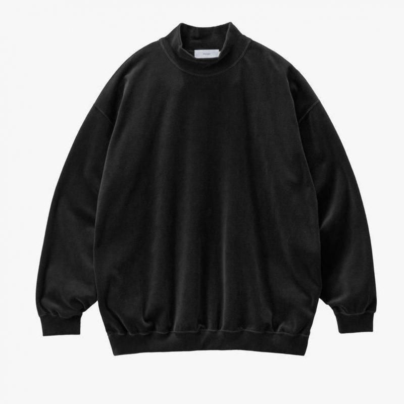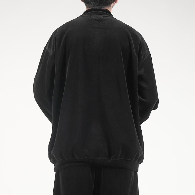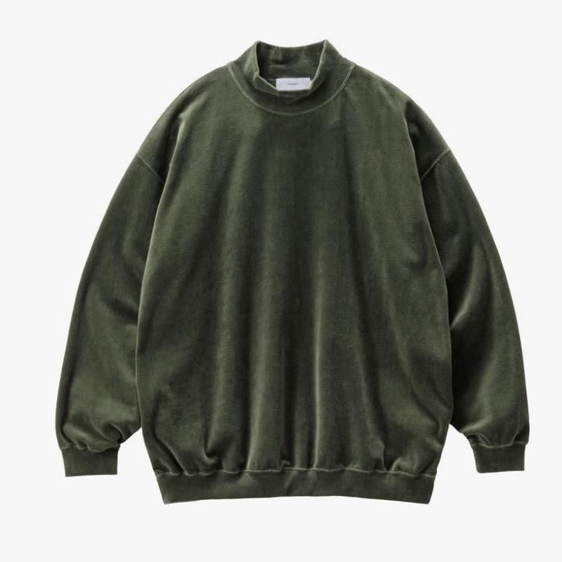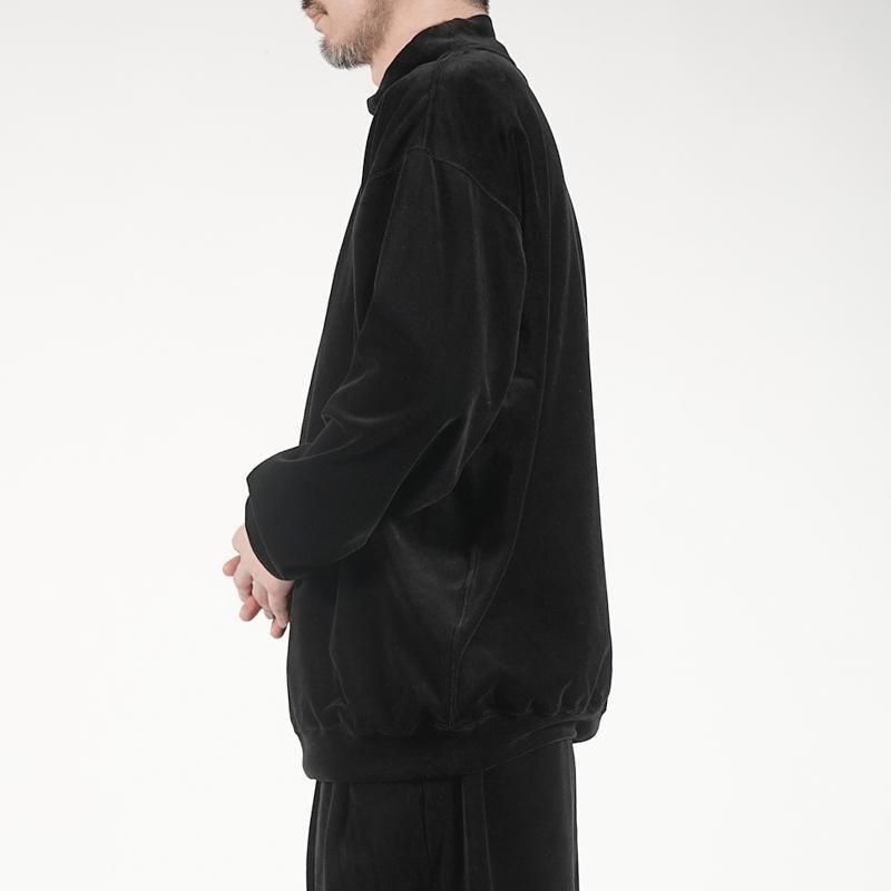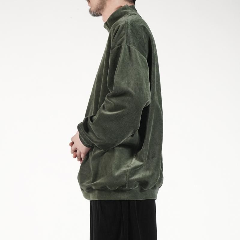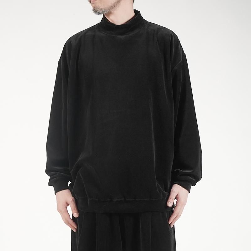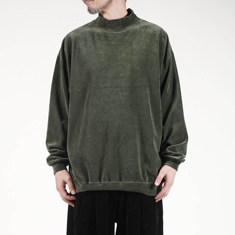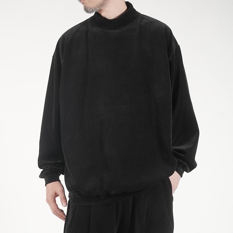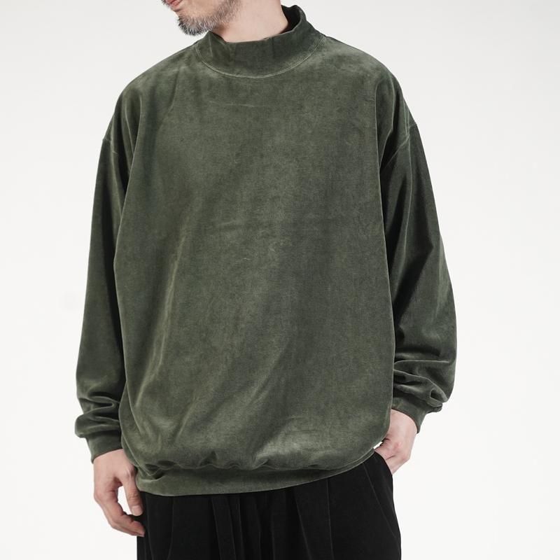 程よくゆとりのあるシルエットのモックネックのプルオーバー。カジュアルに見えがちなベロアを、高密度ハイゲージで編み立てることで度目を詰め、ナチュラルで上品な光沢感とダレにくさを両立。オーガニックコットンを使用し、コンパクト糸によって毛羽を抑えたシャープな表情に。