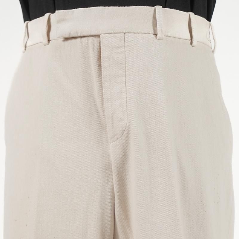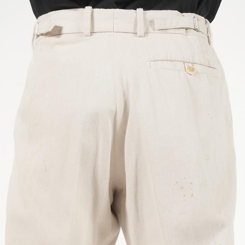 甘撚太番手の糸で作製したコットンツイル素材を使用し、柔らかな質感ながら、しっかりと綾目が立った独特な風合いの生地。脂染みの加工を所々に入れ、古着のような雰囲気。サイドポケットや前立てには、本来テーラードジャケットの襟周りなどに使うAMFステッチが入ります。
