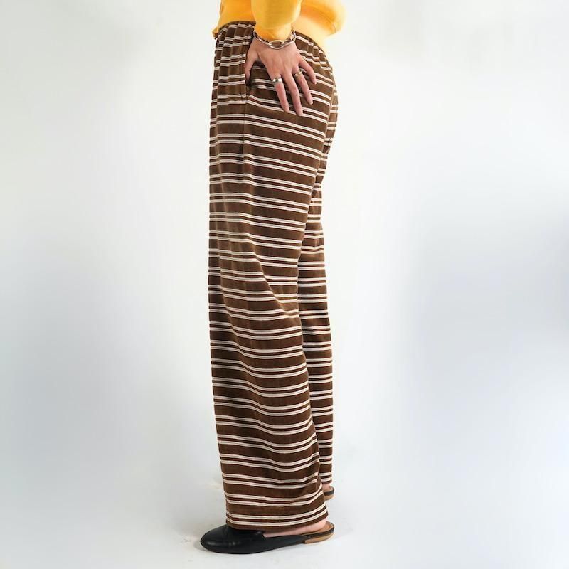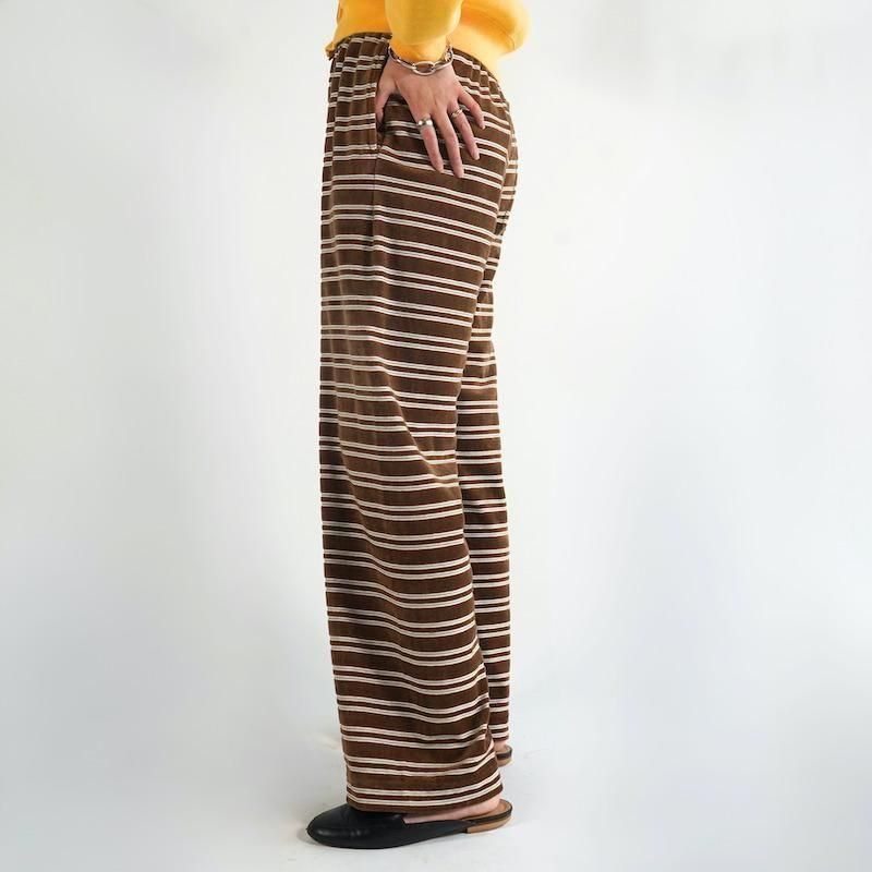 ワイドストレートシルエットのパンツ。 ウエストはゴム仕様で、内側にドローストリングを 配置し、リラックスした履き心地。 脇にはシームポケット、右後ろにポケット付き。 シンプルなトップスを合わせるだけで、一枚で コーディネートの主役になるアイテム。
