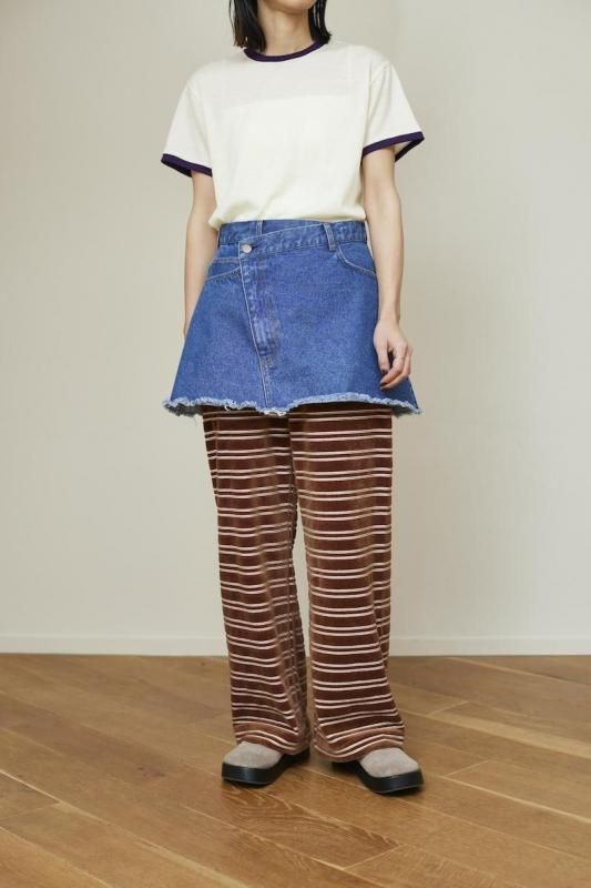希少な切替機を使用し、天竺目とパイル目で 編み分けたテクニカルな段差ベロアボーダー。 パイル部分にはコットンを使用し膨らみ感があり、 裏面はポリエステルを使用して洗濯後の型崩れを 防ぎ、速乾性も兼ね備えた素材。