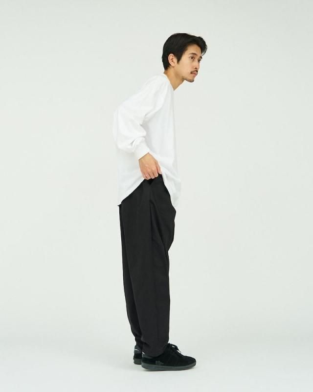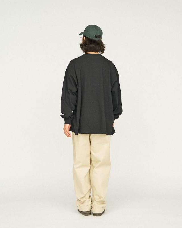 1枚でもインナー使いにも活用出来る6.2ozのボディは16/1コーマ糸によって生み出されたふっくらとボリュームがありながらもドライでザックリとした風合いのタフな仕上がり。吸湿性が高く、速乾性に優れている点も特徴。脇に縫い目の無い丸胴仕様も健在で、肩が落ちていてリラックス感のあるオーバーサイズフィット。左裾のスペックプリントがさりげない主張を。