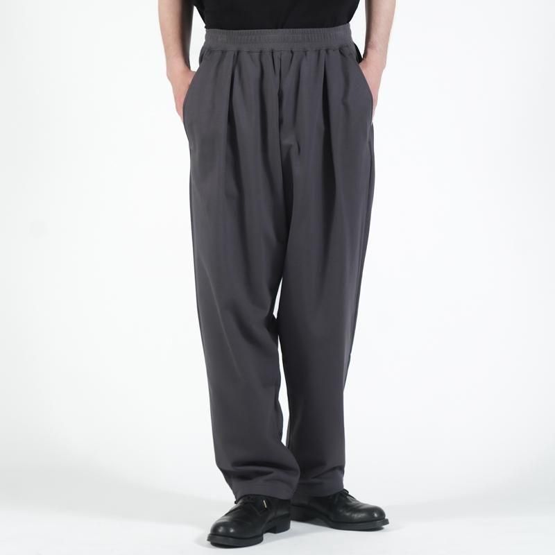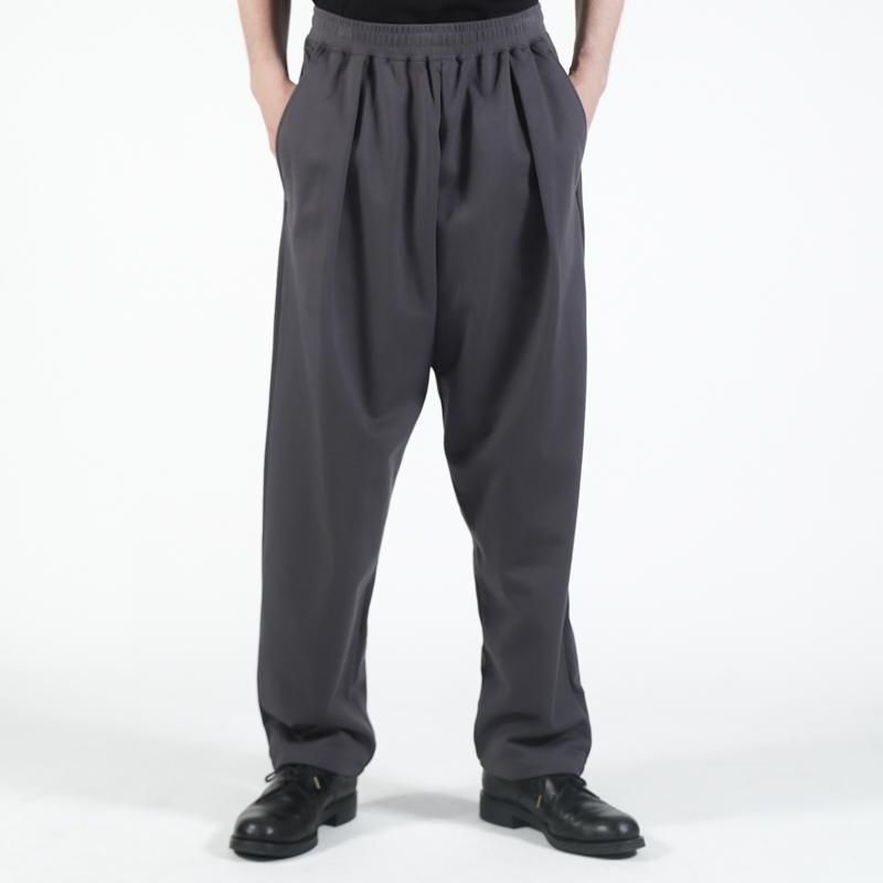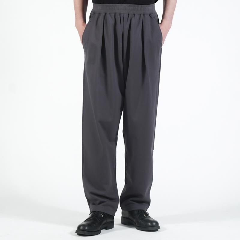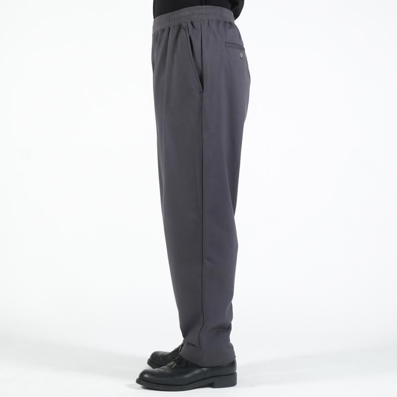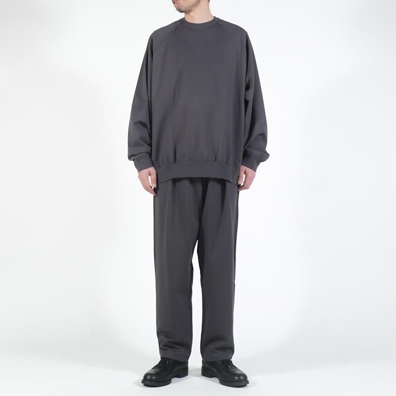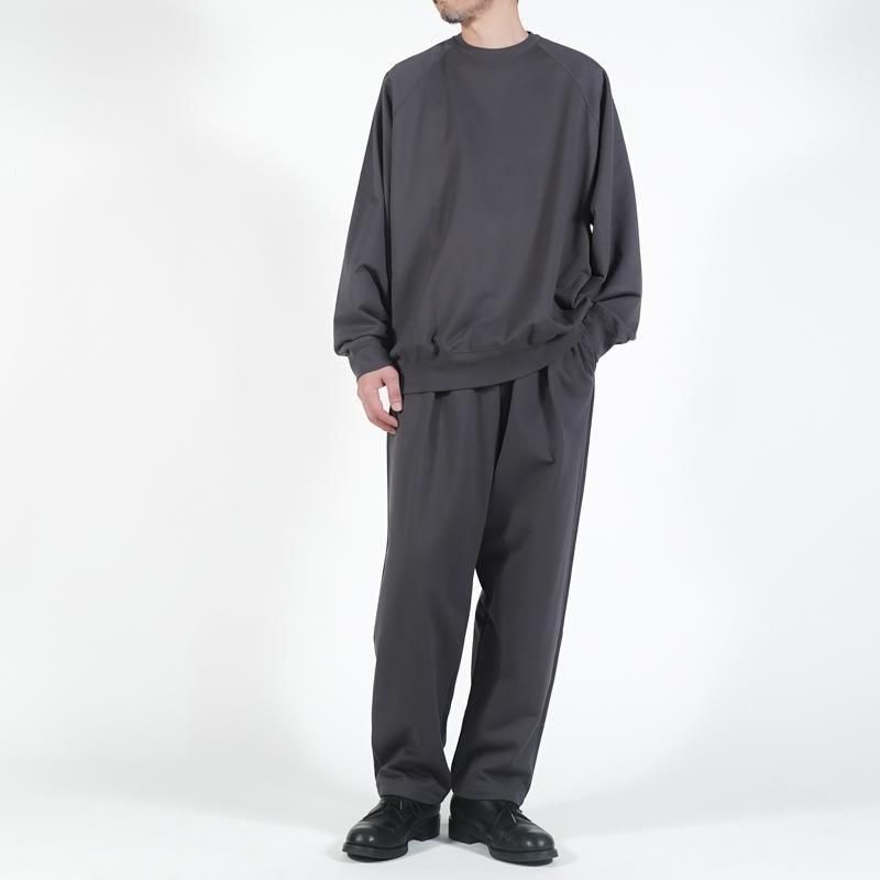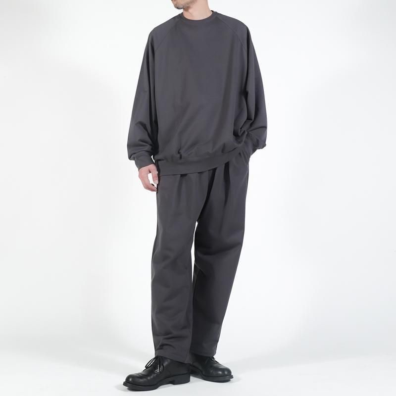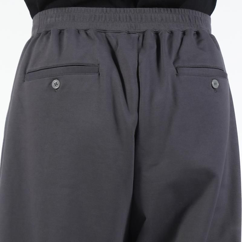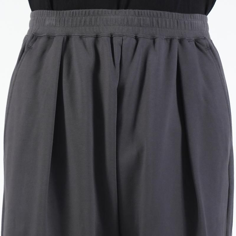 極限までゲージを上げて編地を詰めることで、独自のハリ感にループの肌ざわりを追求したコンパクトテリー。編み機の良さを活かしながら、今シーズンではよりハリ感を出す仕上げに変更した。ウエストはゆったりとしたゴムとドローコード仕様のスウェットパンツでありながらフロントにタックを設け、緩やかにテーパードさせたスラックスのパターンニングを応用。