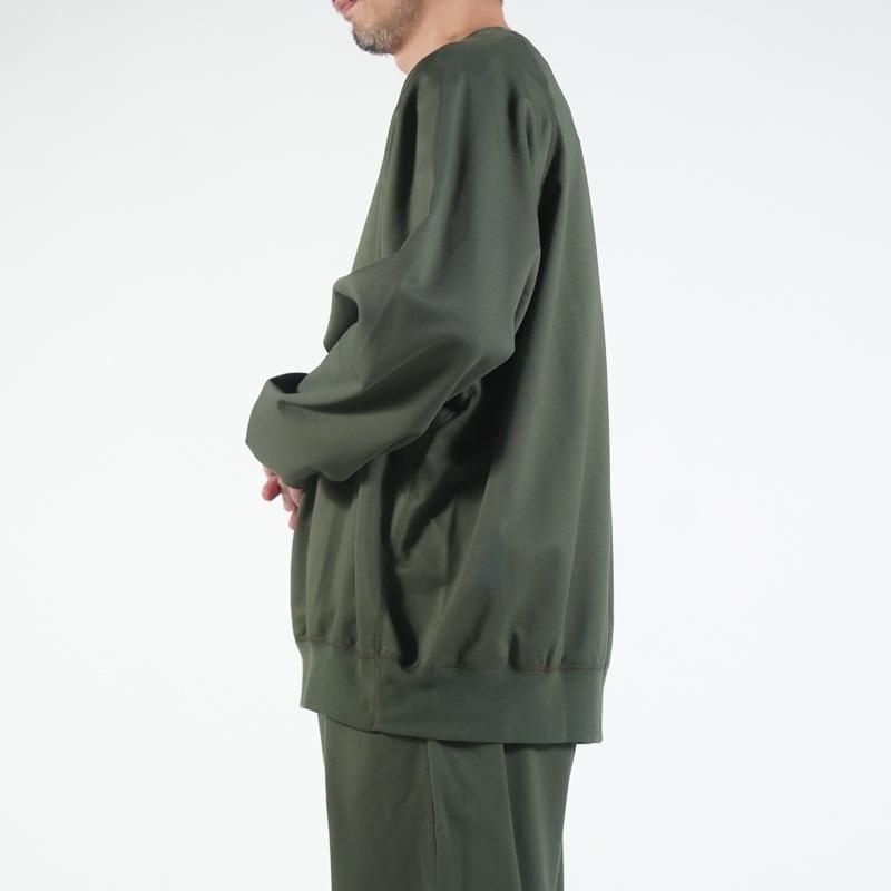 極限までゲージを上げて編地を詰めることで、独自のハリ感にループの肌ざわりを追求したコンパクトテリー。編み機の良さを活かしながら、今シーズンではよりハリ感を出す仕上げに変更した。オーバーサイズに設計した身幅とアームが生地のハリ感と相まって膨らみのあるシルエットを形成する。縫い目が平らな状態に仕上がるフラットシーマ縫製。