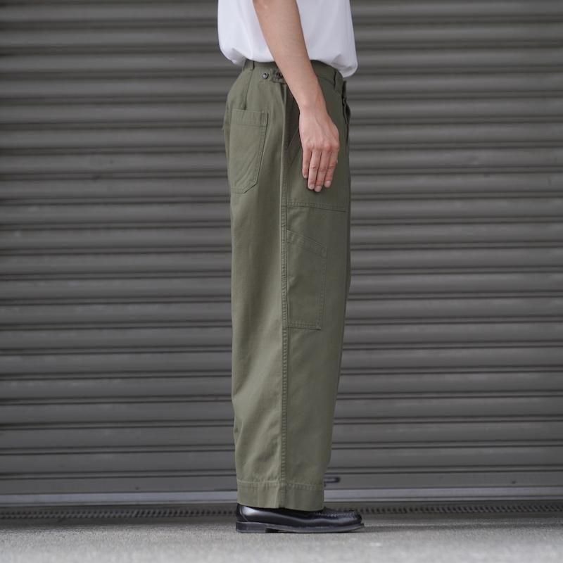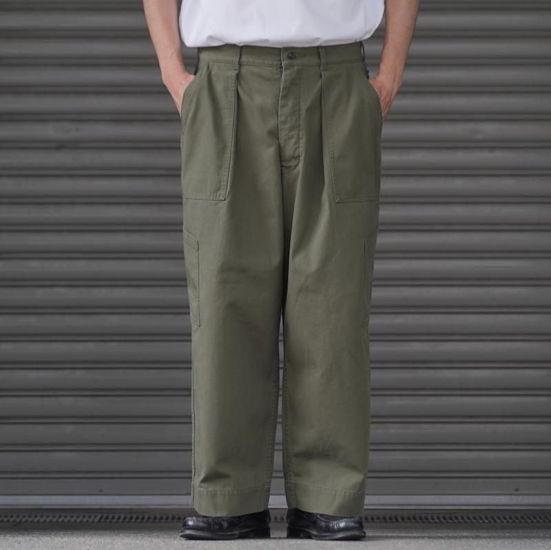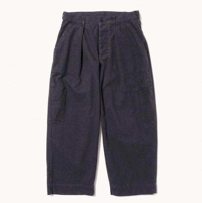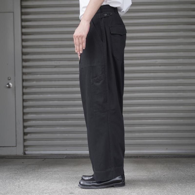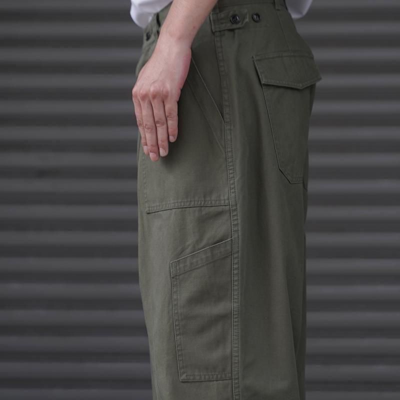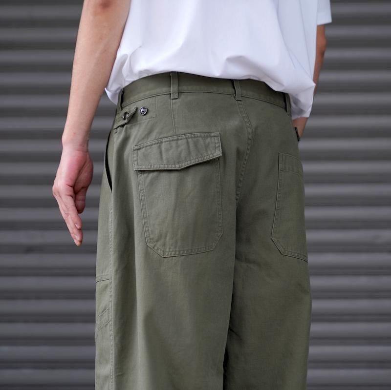 ベイカータイプがベースとなるデザインだが、U.S.ミリタリーの定番ベイカーパンツに比べるとポケット数が多く、ワークパンツ仕様となるデザインが特徴的。メカニックパンツとも言われるタイプ。 原型よりタックの調整により渡りを膨らまし、裾を絞りややキュロット型に変更したシルエットが大きな特徴。 ワイドシルエットでアタリの出方も強くしています。