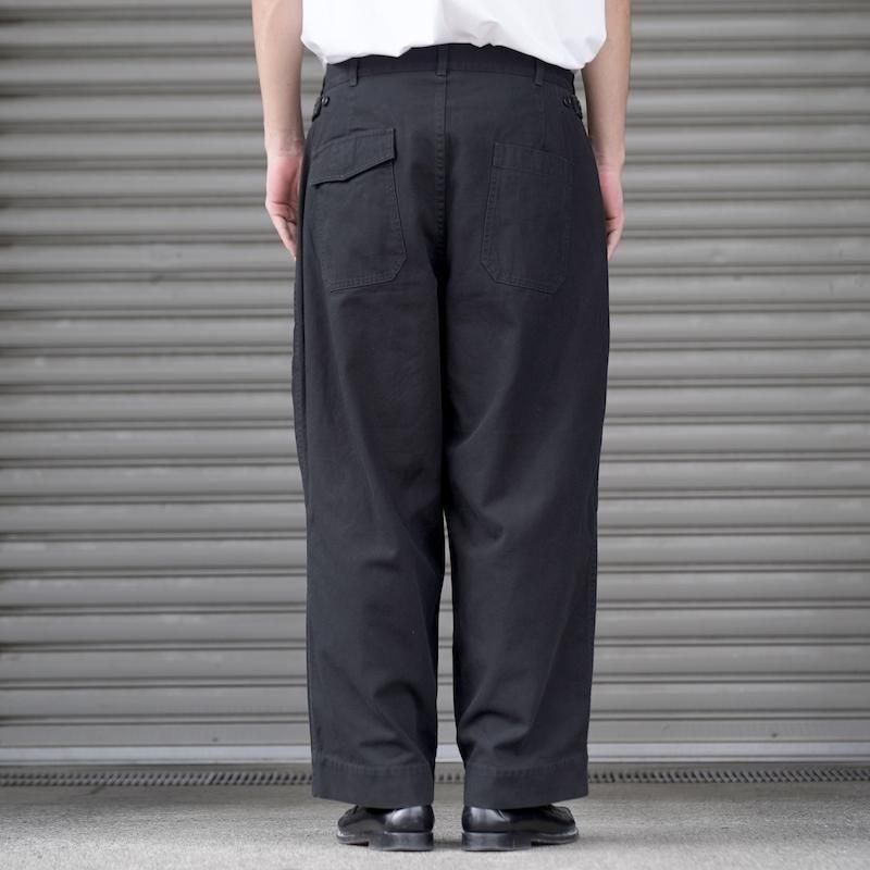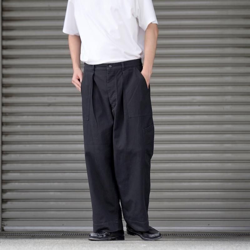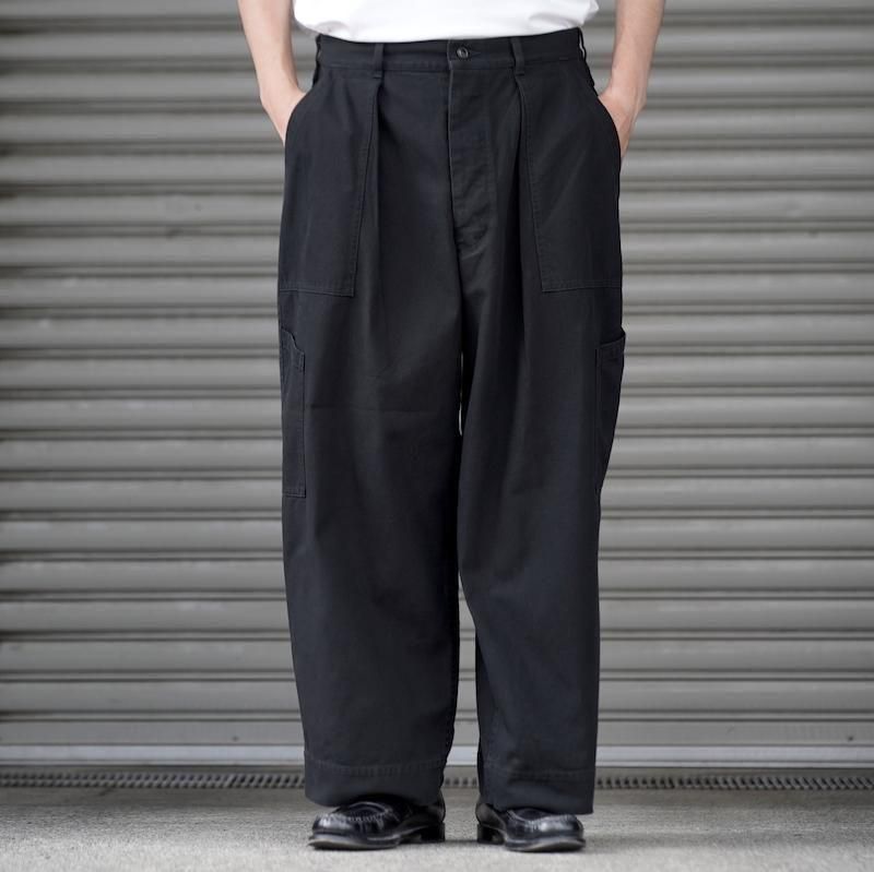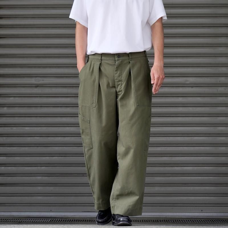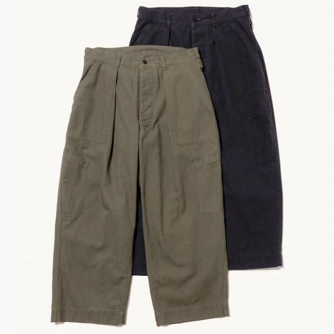 ベイカータイプがベースとなるデザインだが、U.S.ミリタリーの定番ベイカーパンツに比べるとポケット数が多く、ワークパンツ仕様となるデザインが特徴的。メカニックパンツとも言われるタイプ。 原型よりタックの調整により渡りを膨らまし、裾を絞りややキュロット型に変更したシルエットが大きな特徴。 ワイドシルエットでアタリの出方も強くしています。