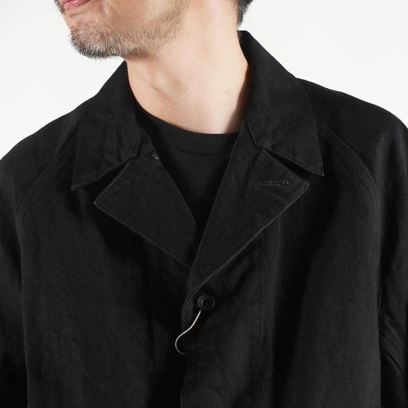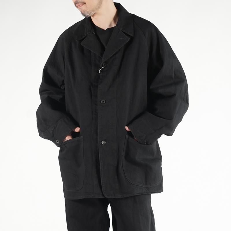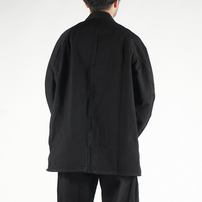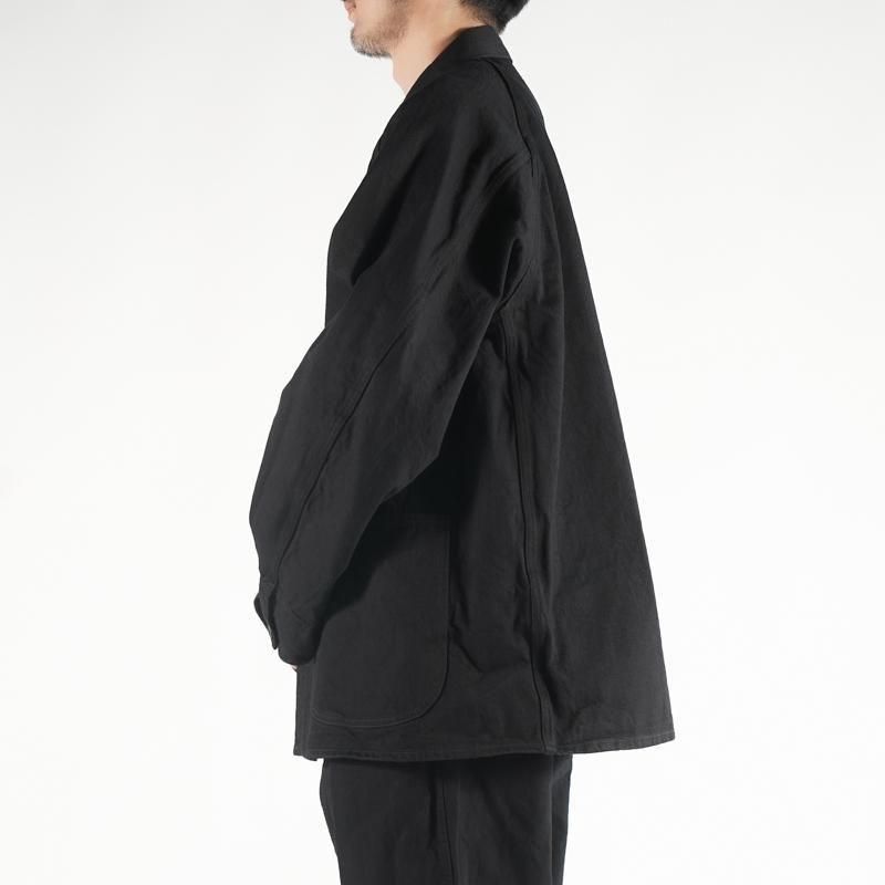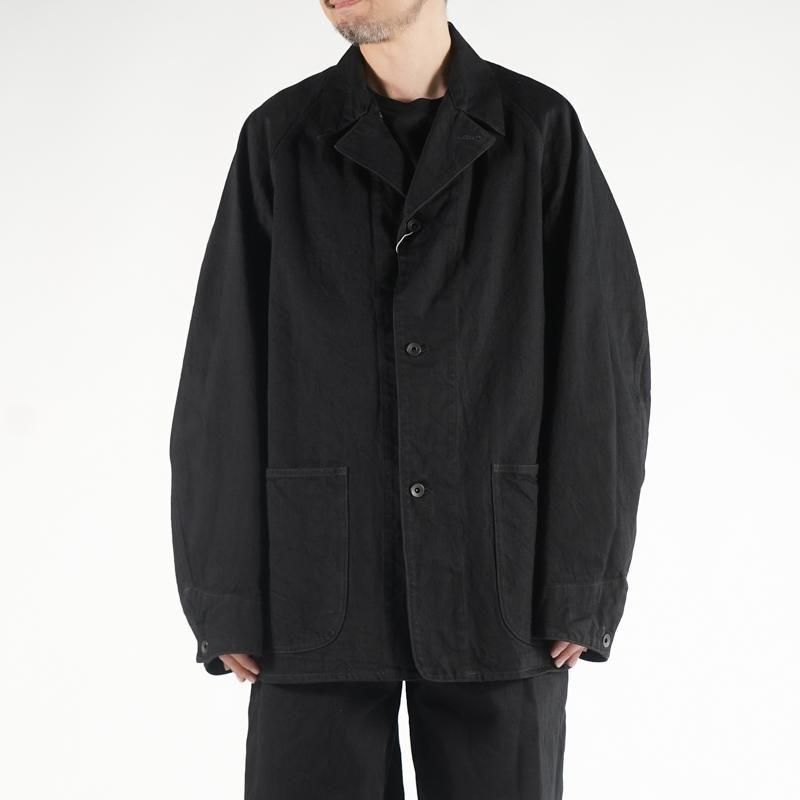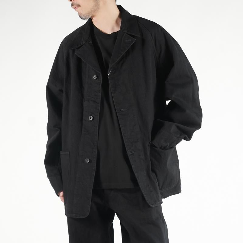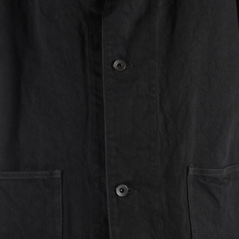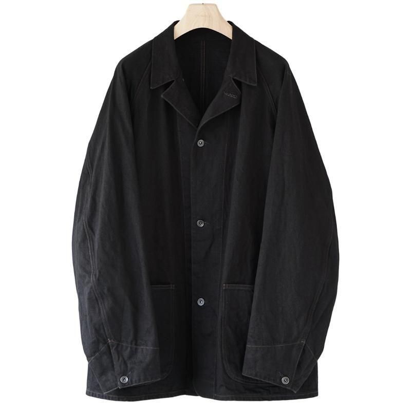 13.5ozの中白のブラックデニムで作った一重仕立ての ワークジャケットです。ワンウォッシュ、タンブラー仕上 げです。 ステッチカラーを少し赤みのある焦げ茶にしています。 サイズ感は今までよりも大きめにしました。