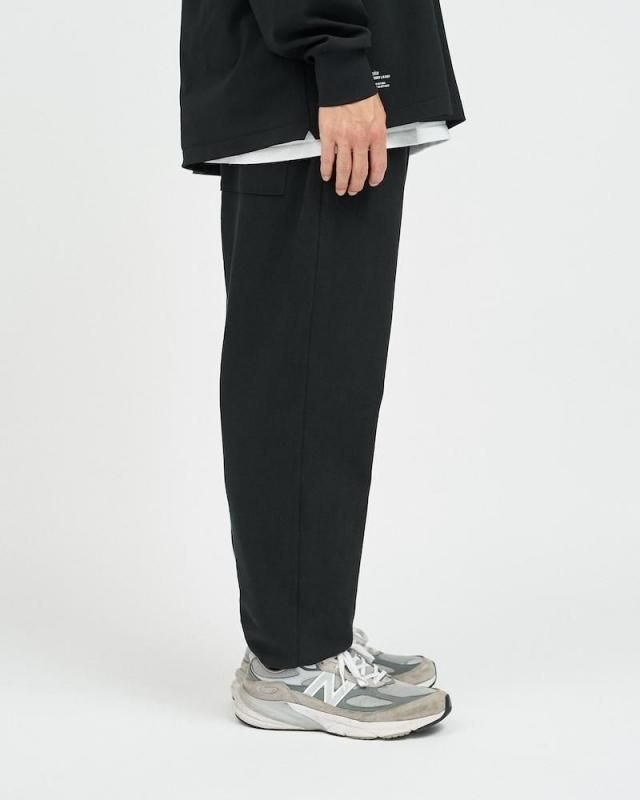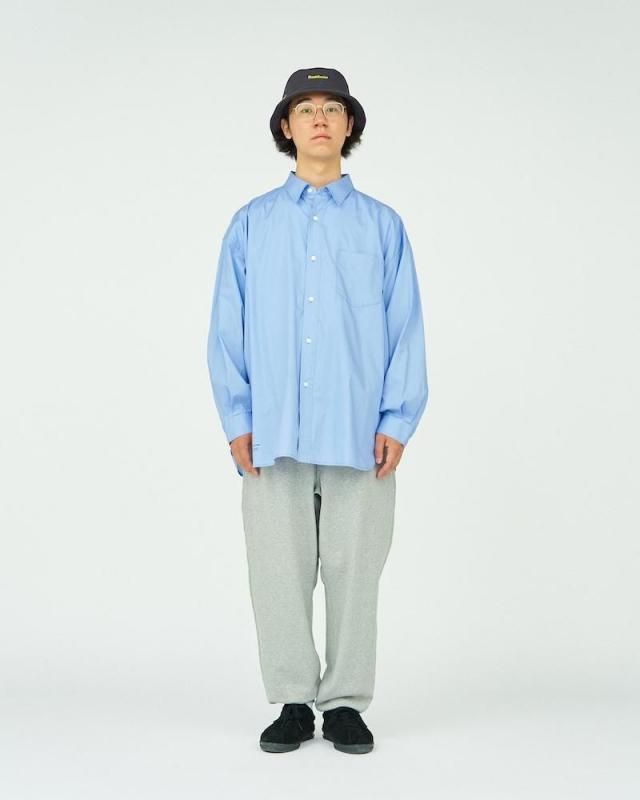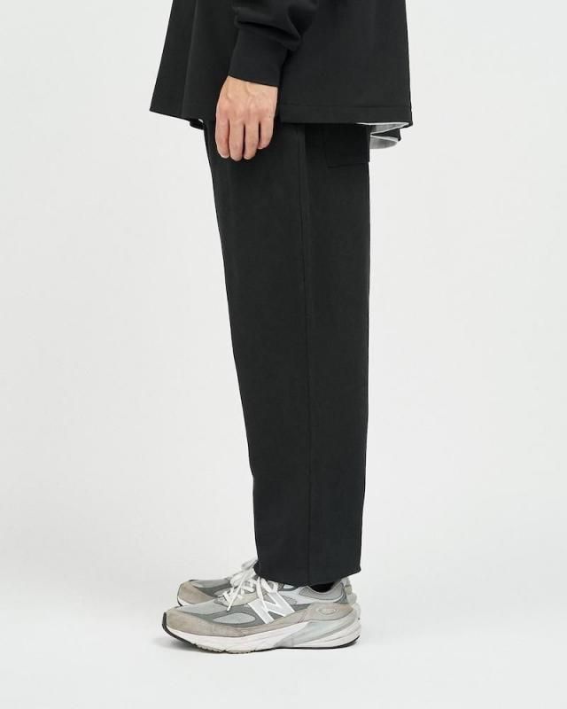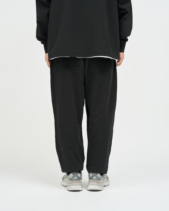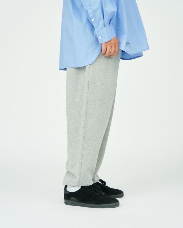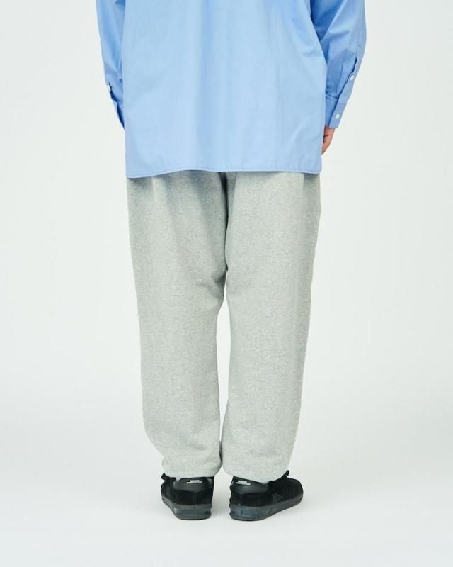 空紡糸ならではのドライなタッチが特徴の表面に対して、甘撚りのループ面が柔らかな肌触りを。股に開脚性を高めるガゼットを設けてあり、裾にリブの付いたジョガー仕様でスポーティーな1枚。