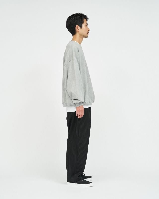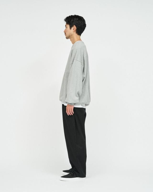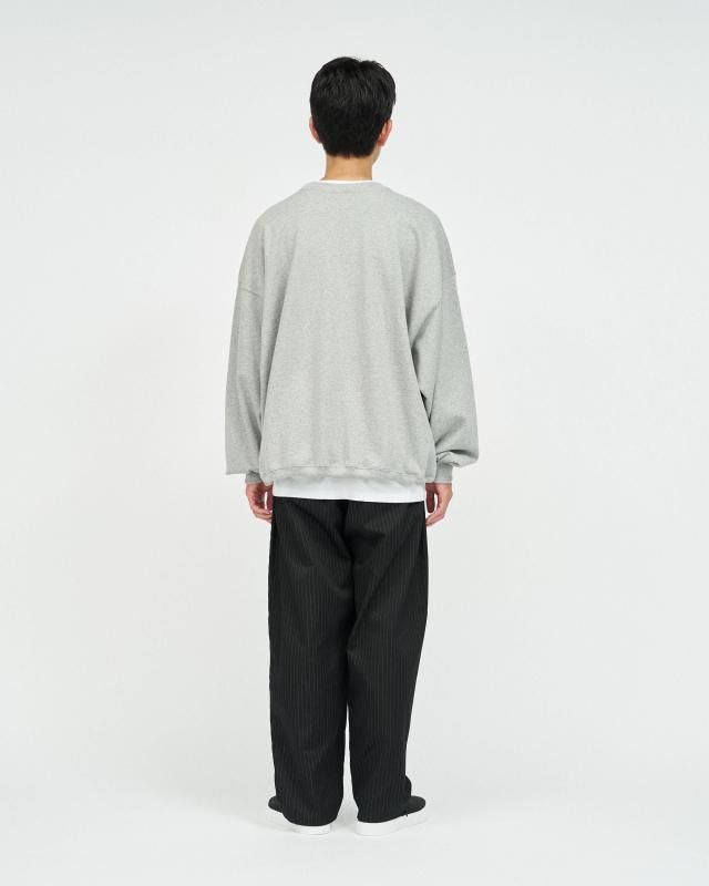 空紡糸ならではのドライなタッチが特徴の表面に対して、甘撚りのループ面が柔らかな肌触りを。身幅からアームまでゆったりとしたFreshServiceらしいルーズフィット。