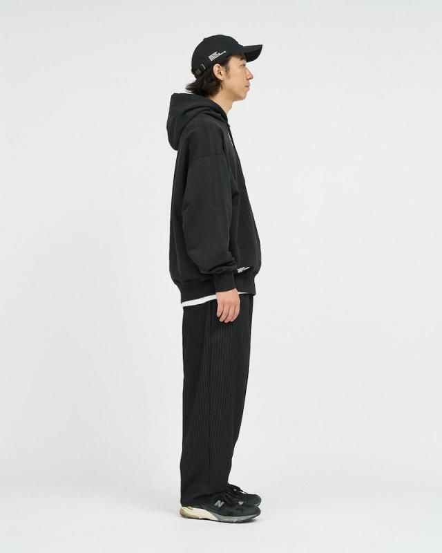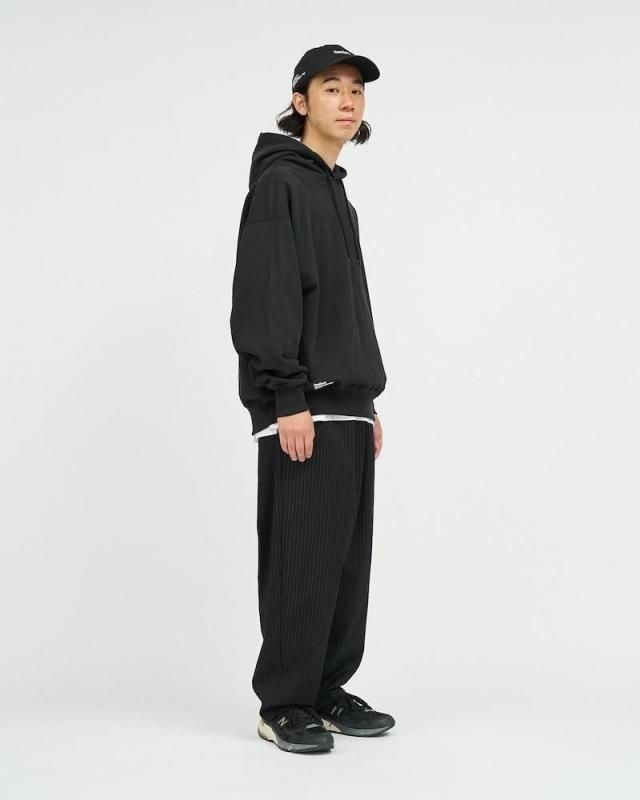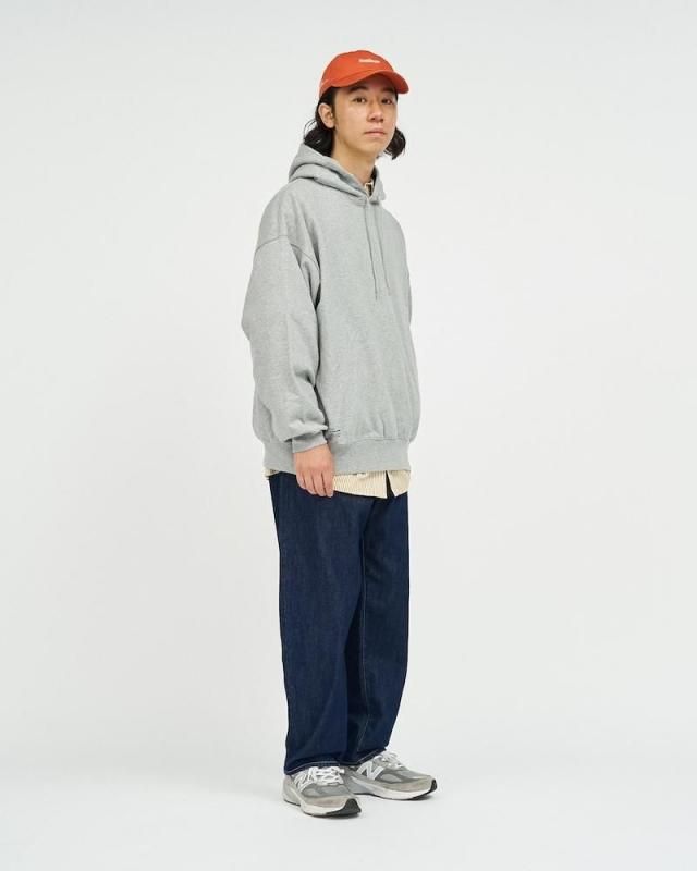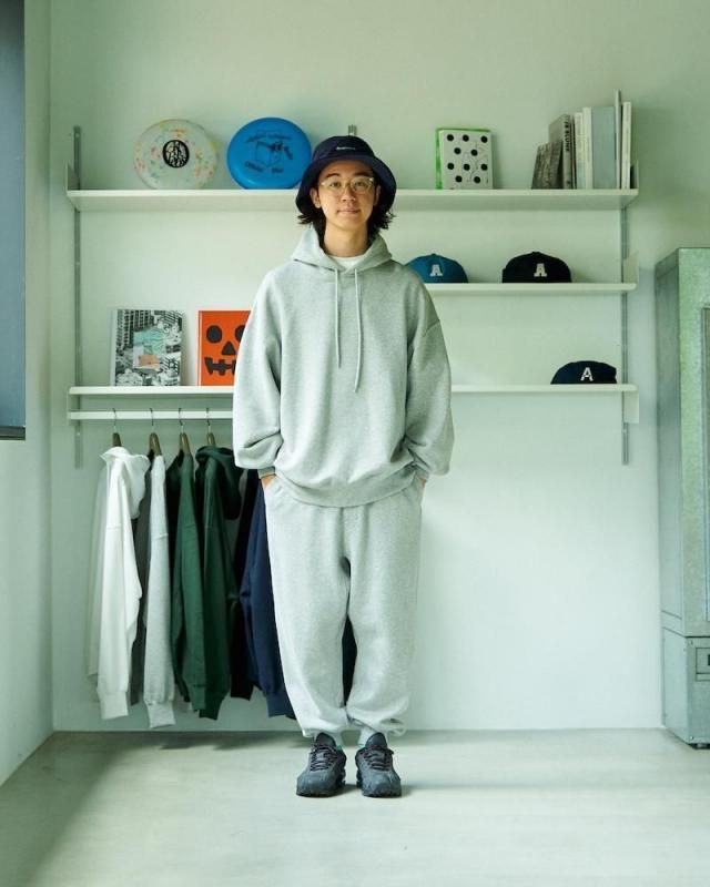 空紡糸ならではのドライなタッチが特徴の表面に対して、甘撚りのループ面が柔らかな肌触りを。身幅からアームまでゆったりとしたFreshServiceらしいルーズフィットでフードは立体感のある2重仕立て。