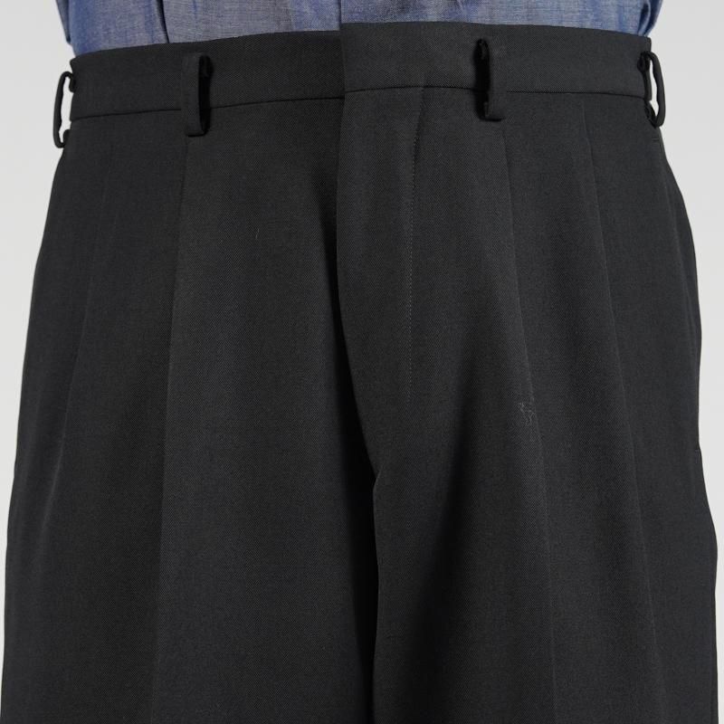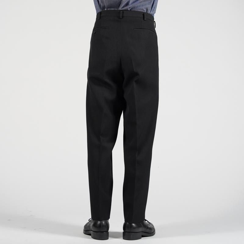 2プリーツでゆったり取った腰回りから裾にかけてテーパードしたワイドテーパードシルエット。 創業150年の尾州の老舗機屋のウール生地を使用。番手の太い糸で上品な艶と力強いハリをもたせたドライな生地感とキュプラ裏でストレスのない肌当たり。上質な素材感が美しい一本です。