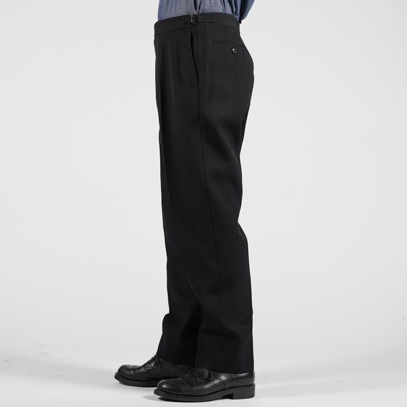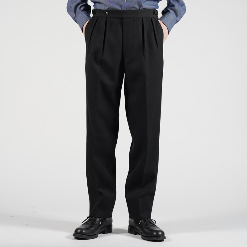 太すぎず細すぎない絶妙な太さのワタリ幅と膝下から緩やかにかけられたテーパードシルエット。腰回りはベルトループを付けずにサイドアジャスターで調整する仕様。金具も品の良いメッキ仕上げが施され、フィット感の高いものを採用しています。中は半裏の仕様で、前立てはジップフライ仕様。