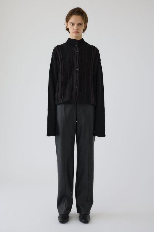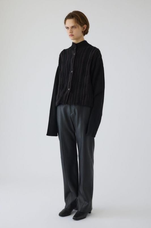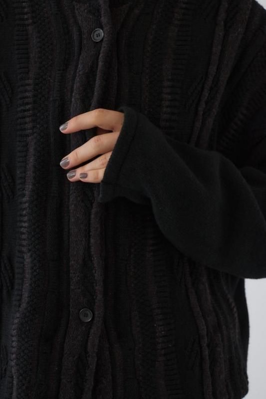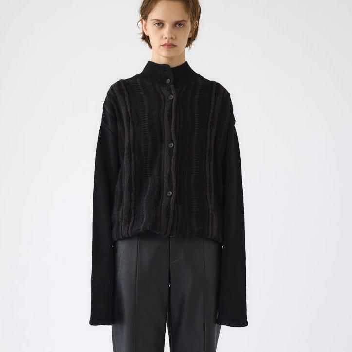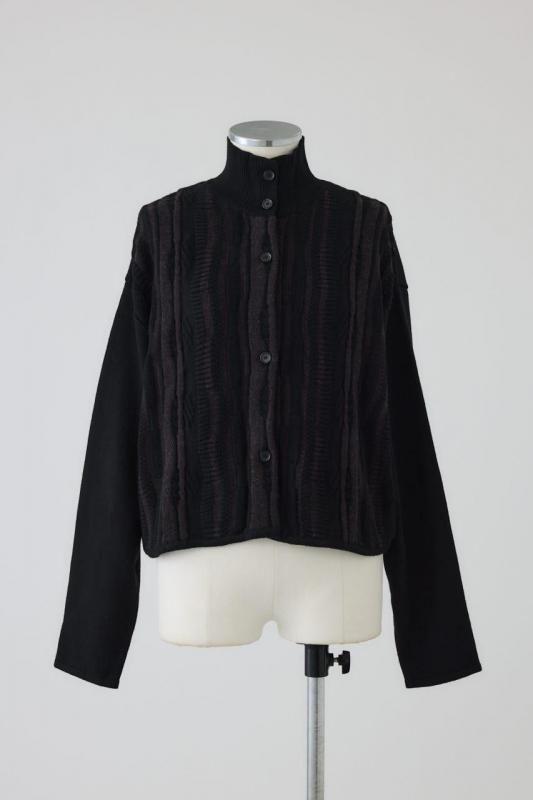 ■POINT:立体的なケーブル編み柄が目を引くスタンドカラーのニットカーディガン。