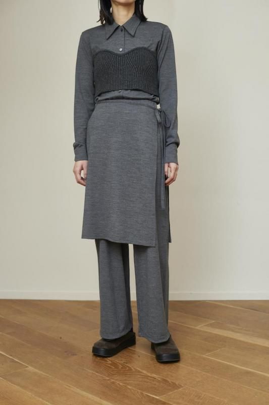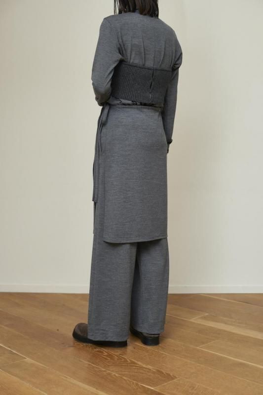 エプロンとパンツがセットになったアイテム。 シンプルながら、これ一枚でコーディネートが 決まるアイテム。 同素材のシャツとセットアップで着用可能。