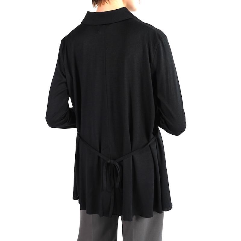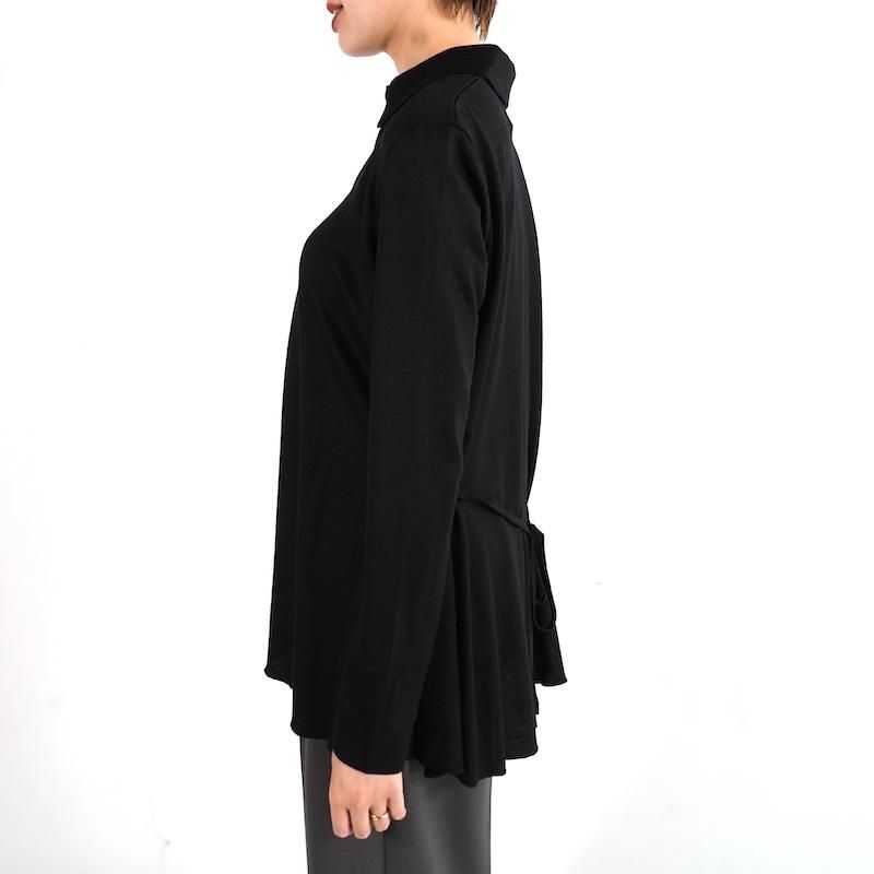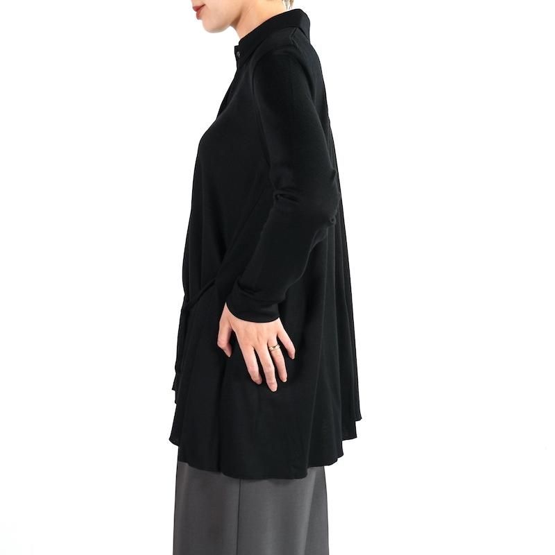 Aラインのシルエットは、脇の紐を前で結んだり 後ろで結んだり、結び方次第で様々な着こなしが 楽しめる一着。同素材のエプロン付きパンツとセットアップで着用可能。