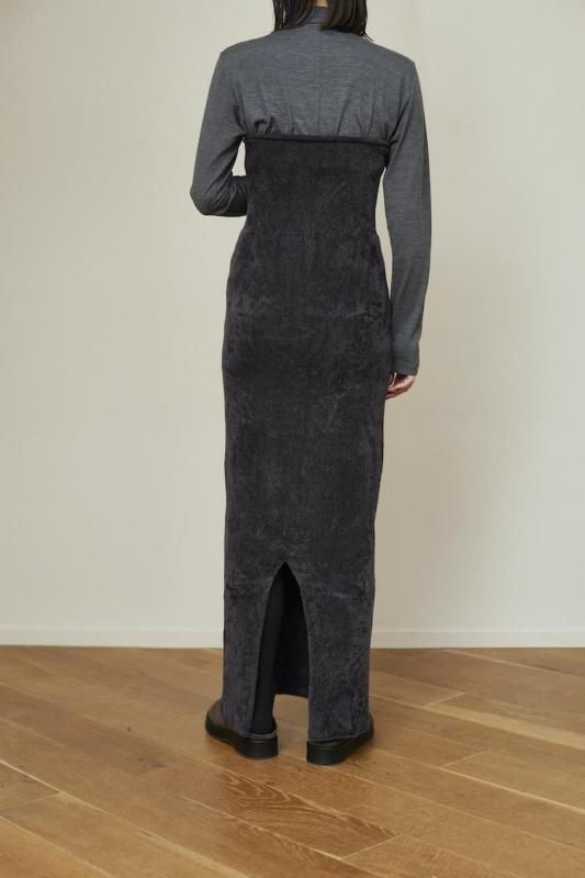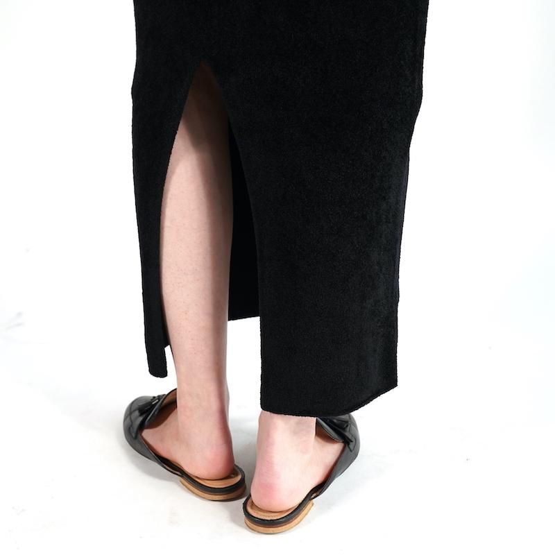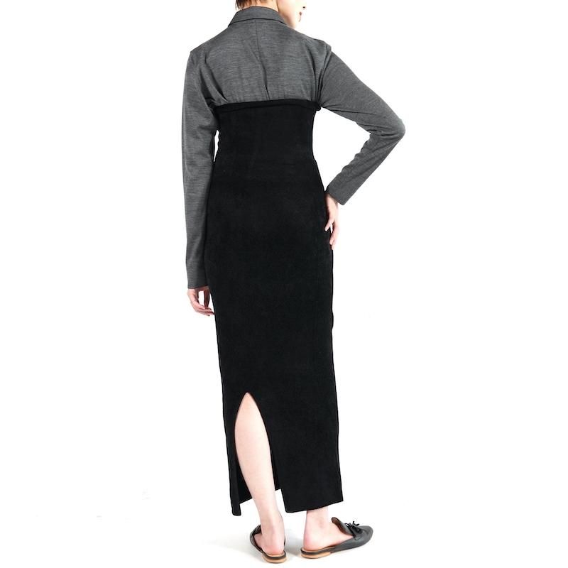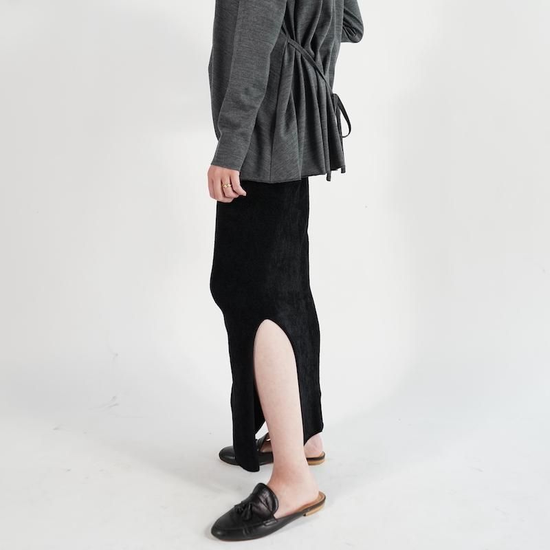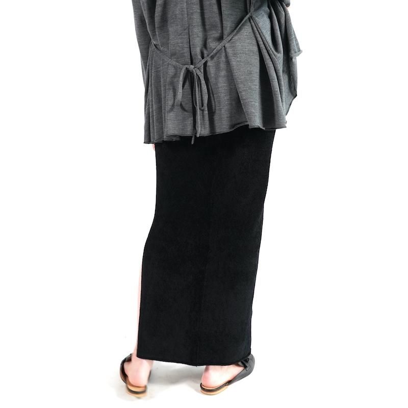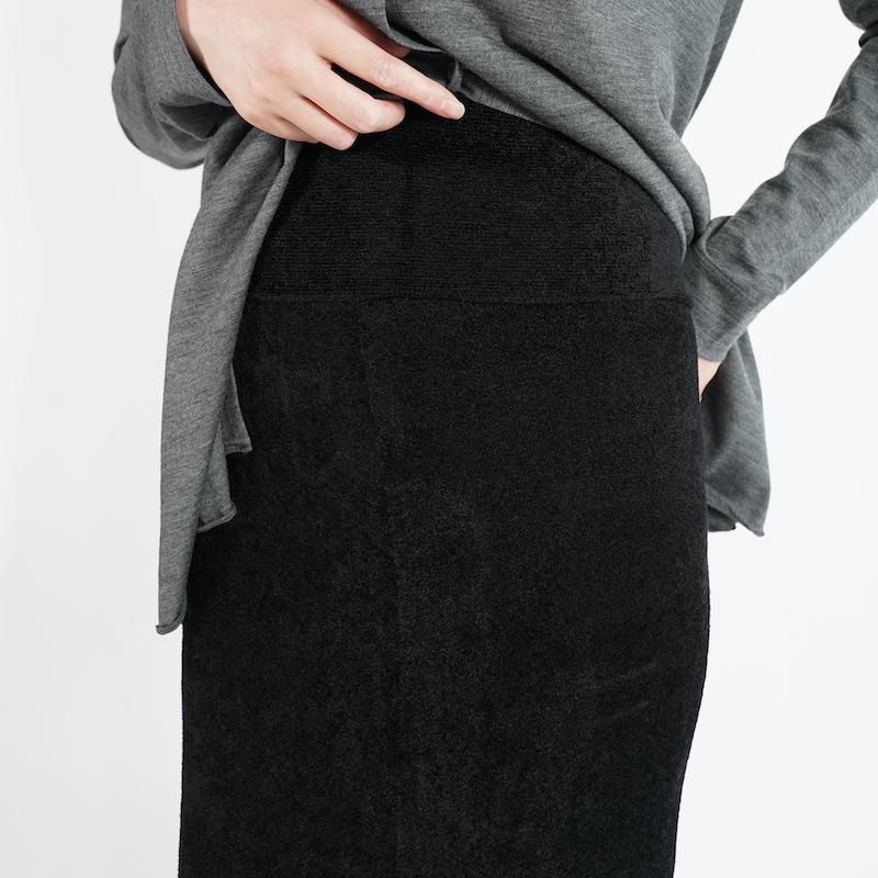 縫い目がないホールガーメントのロングスカート。 ウエストリブを伸ばしてビスチェ風に着たり、 折り返してウエスト位置を自由に調整したり、 2way で楽しめる一着。後裾にスリットあり。