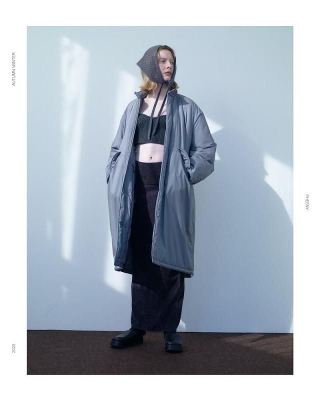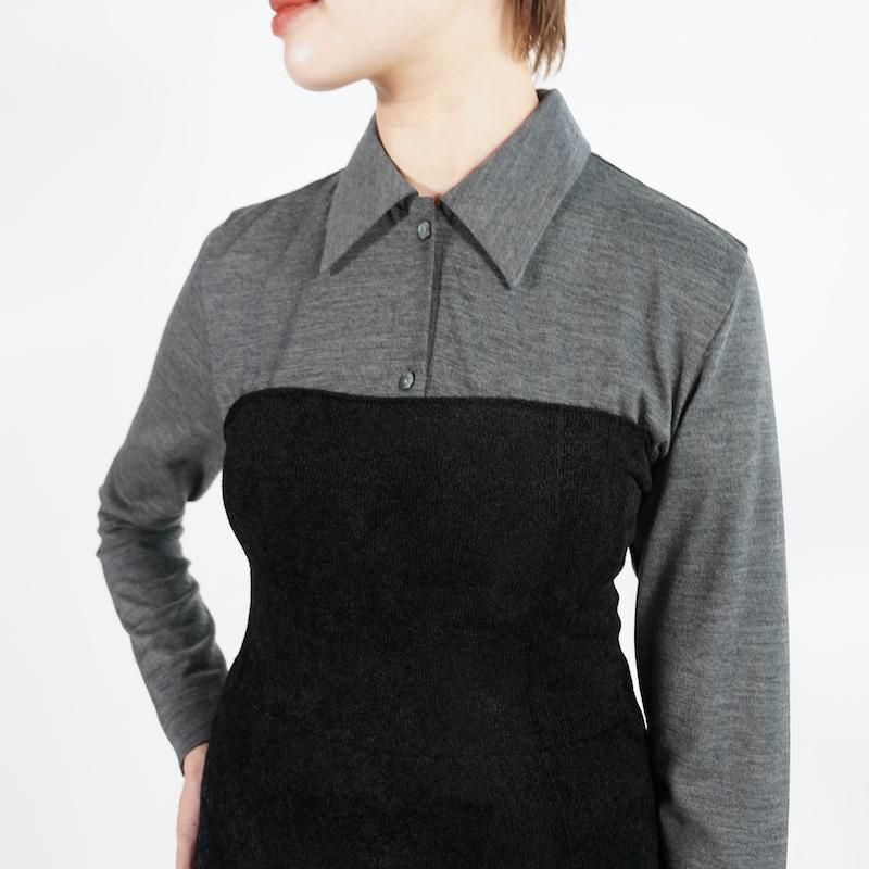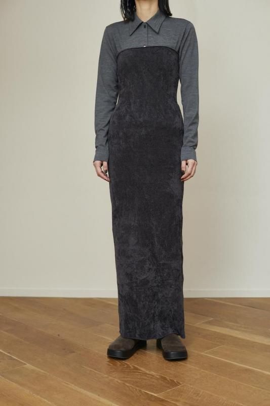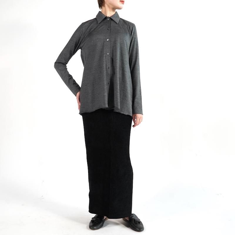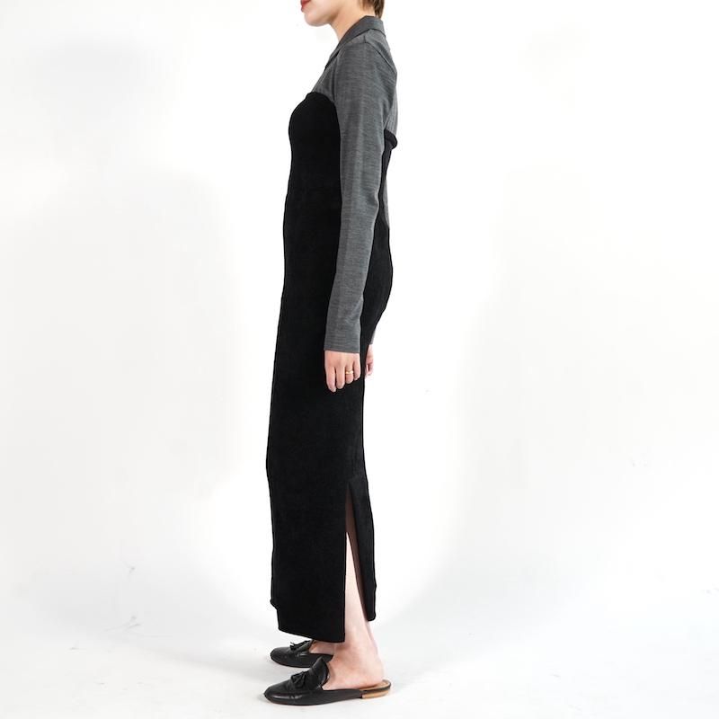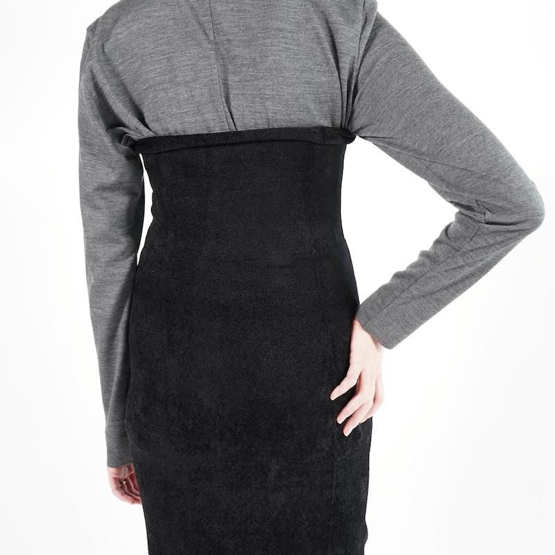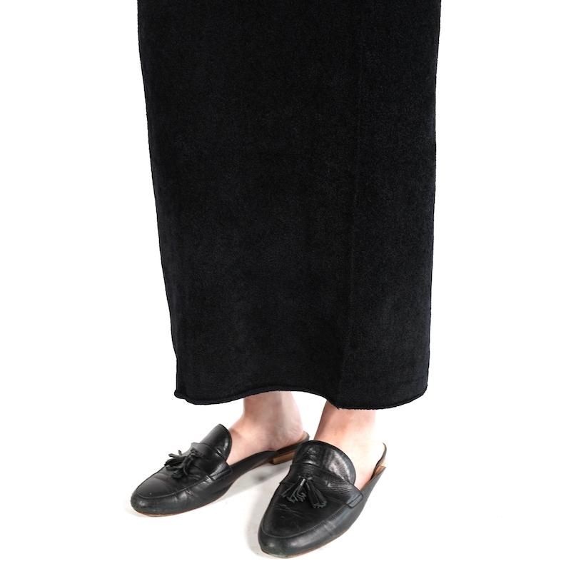 縫い目がないホールガーメントのロングスカート。 ウエストリブを伸ばしてビスチェ風に着たり、 折り返してウエスト位置を自由に調整したり、 2way で楽しめる一着。後裾にスリットあり。