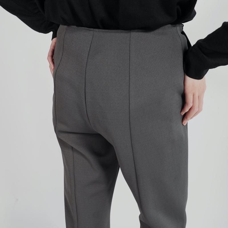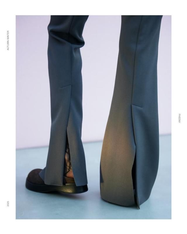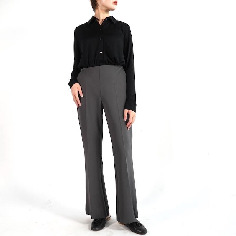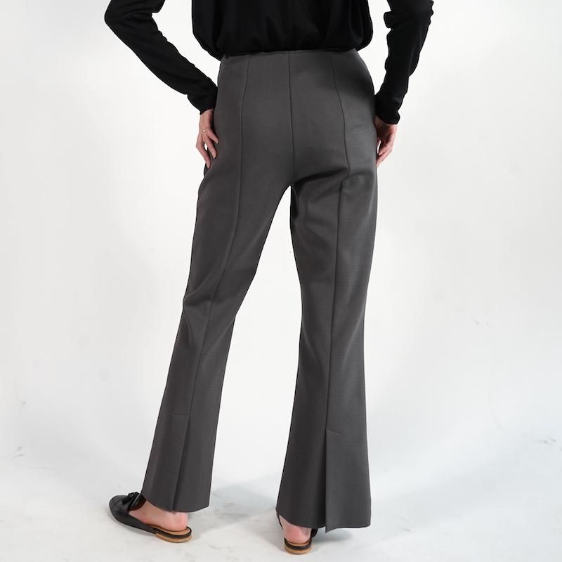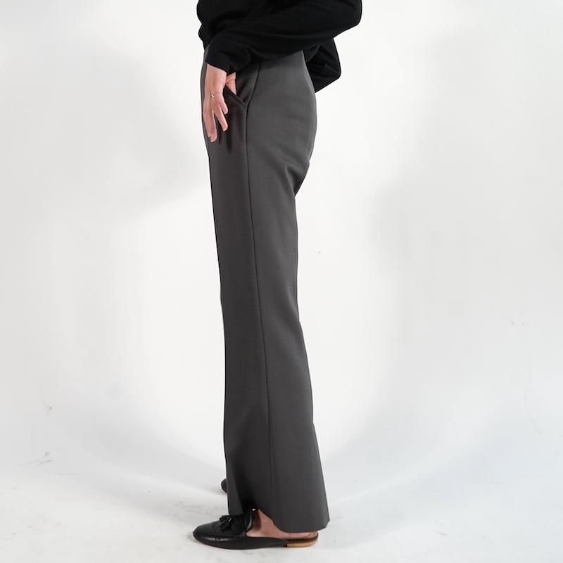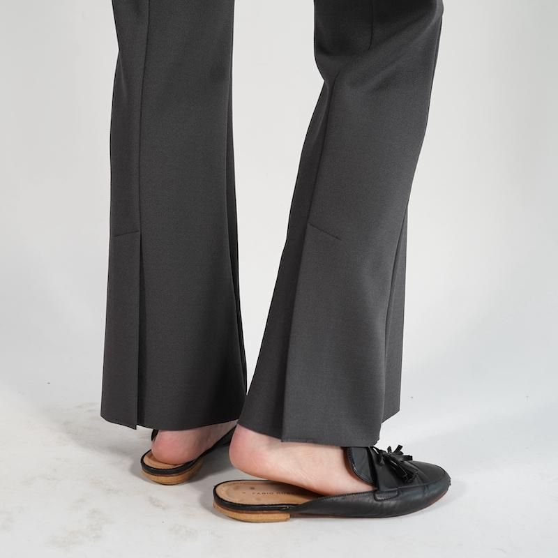 定番のアムンゼンシリーズからフレアパンツが登場。 フレアシルエットにセンタークリースを入れ、 縦ラインを強調して足を綺麗に見せてくれる。 裾は断ち切り仕様でセルフカット可能、好みの 長さに調整できるのが嬉しいポイント。 脇にコンシールファスナー、斜めポケット、 後ろ裾にはベンツ開きが施され、ディテールにも こだわりが光る一着。