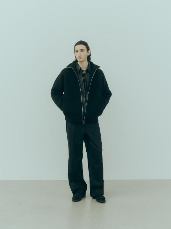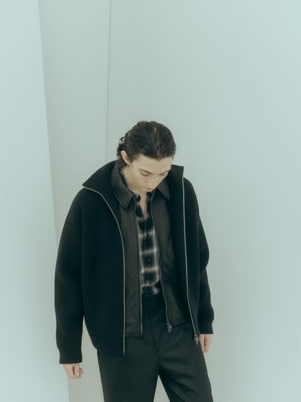 素材は、ゲージに対して限界のウール糸の本数とストレッチ糸を入れた両畦編を使用。ぎゅっと目が詰まった手触りの良い風合いで、適度な弾力と滑らかなタッチが特徴です。サイドポケットも配されており利便性も高く、ダブルジップで様々な着方にもアレンジできます。襟を立てたり寝かせたり、インナーだけでなくアウターとして使ってみたりと、汎用性の高さを活かして自由に楽しんで頂けたらと思います。