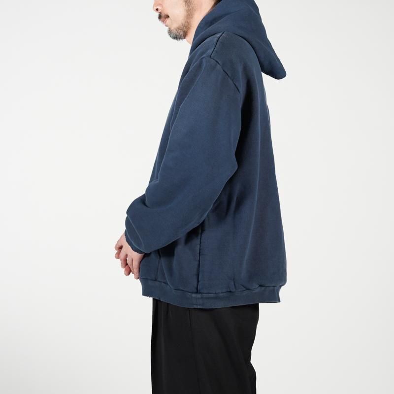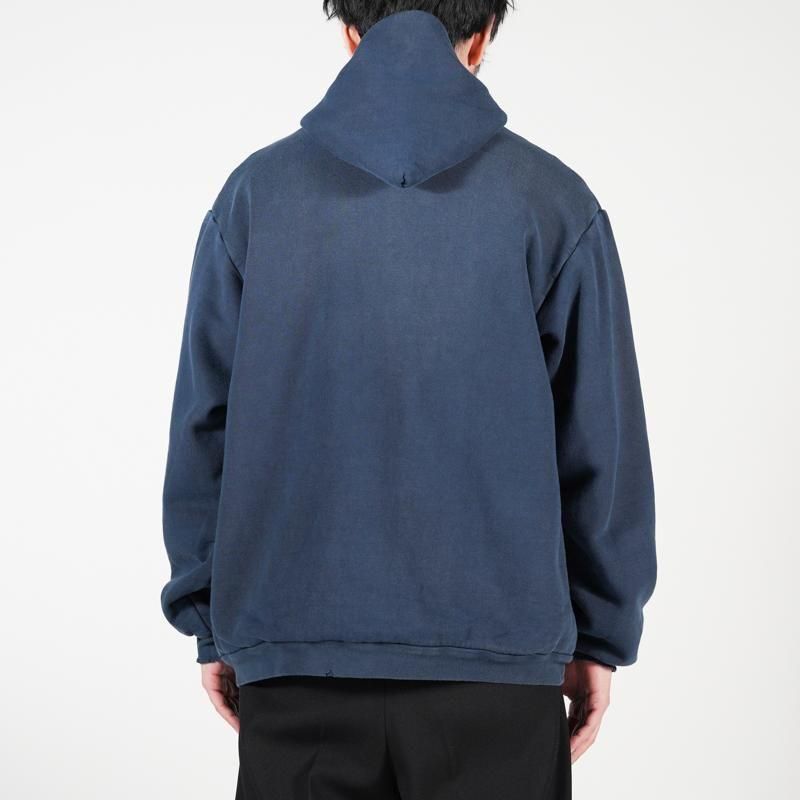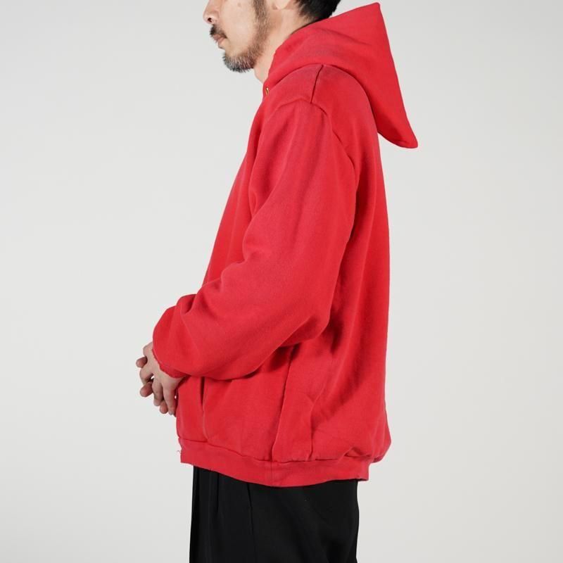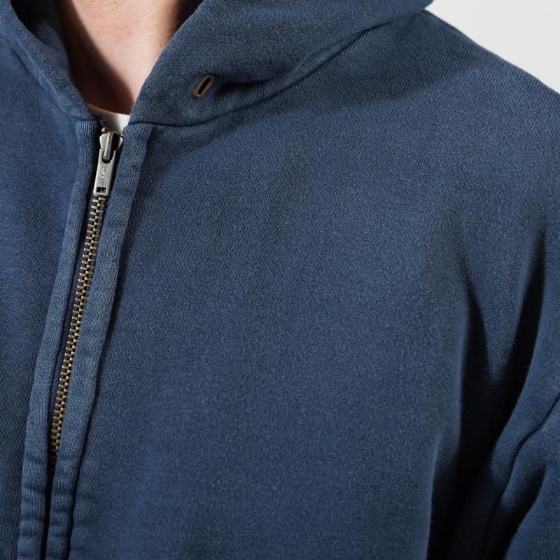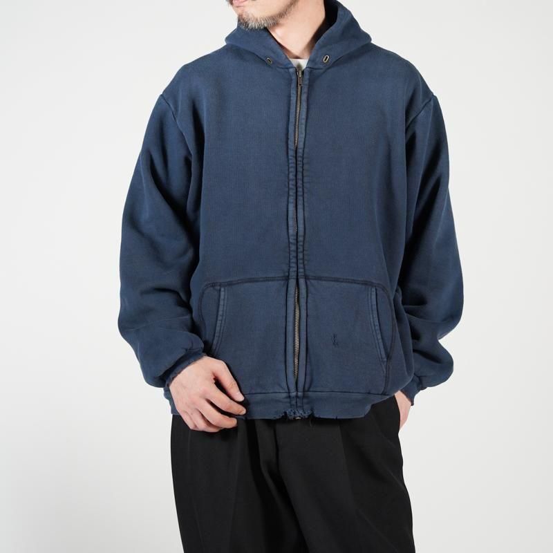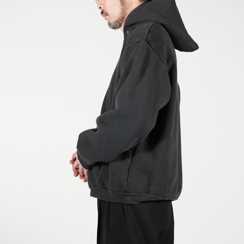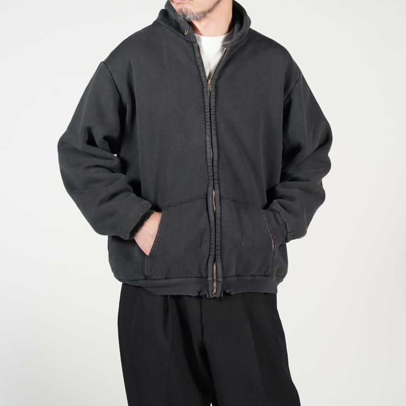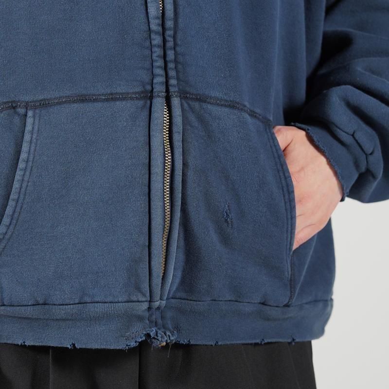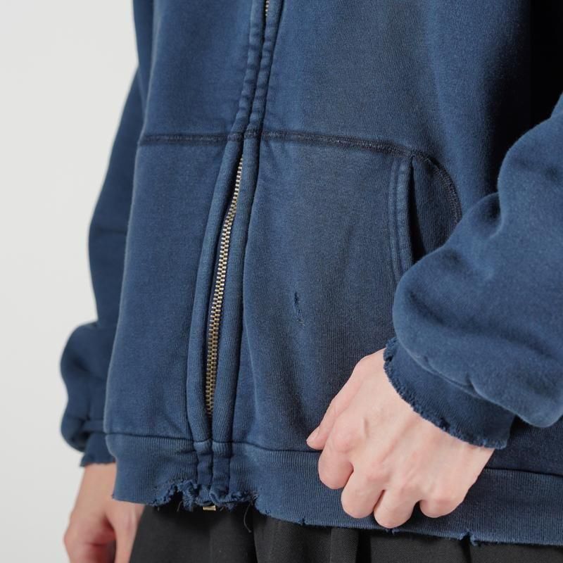 【デザイン】クロップドフードZIPパーカー国内入手が難しい当時と同じサイズの小判ハトメヴィンテージの薄く伸びきって緩くなったリブをあえて再現し、崩れたシルエットに設計4本針ミシンで縫い付けた腰ポケット