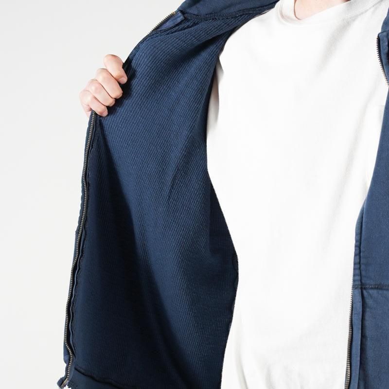 【素材】表地はヴィンテージを解析して作った吊り裏毛、1時間に1メートルというゆっくりとしたスピードでしか編み立てられないが、糸に余計な負荷を掛けないで編み上げることで、肉厚ながら固くならず、ふっくらとした風合いで仕上げた裏サーマルもヴィンテージを解析し作成。
