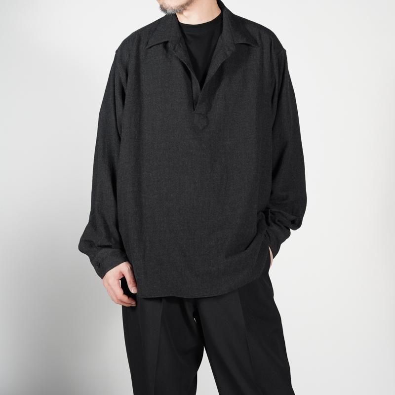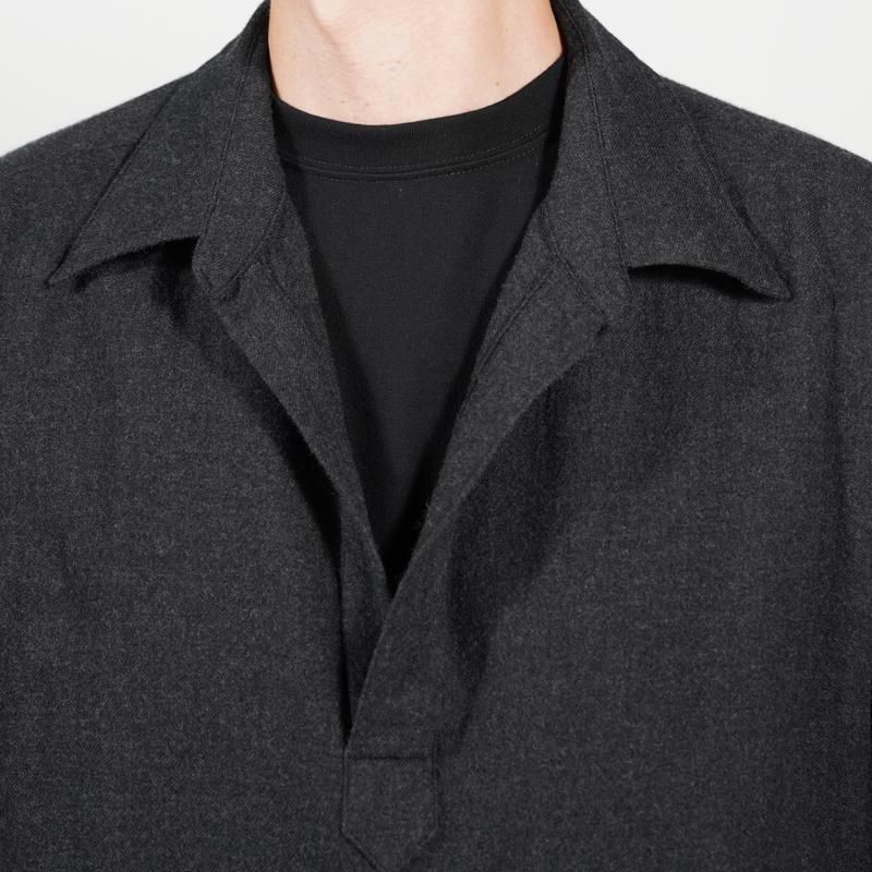 【デザイン】アメリカンなプラケット付きのプルオーバーシャツそれをベースにボタンレスのスキッパーデザインにアレンジしたゆったりとしたオーバーサイズシルエット