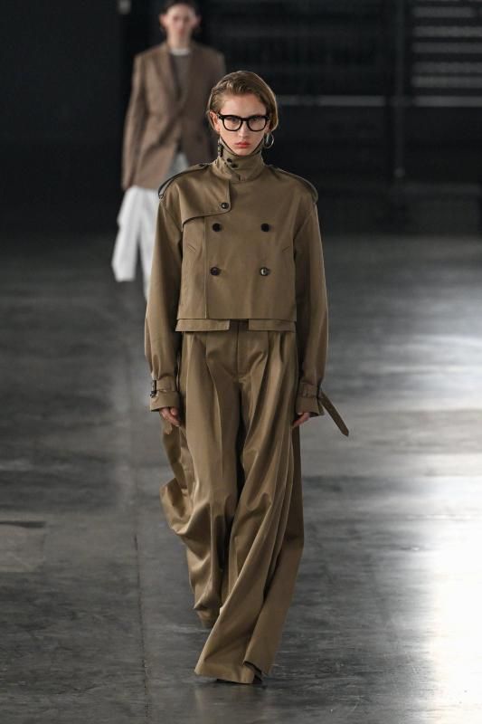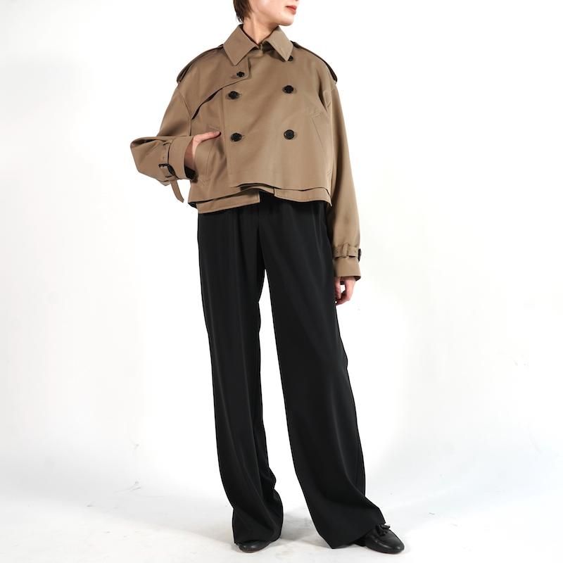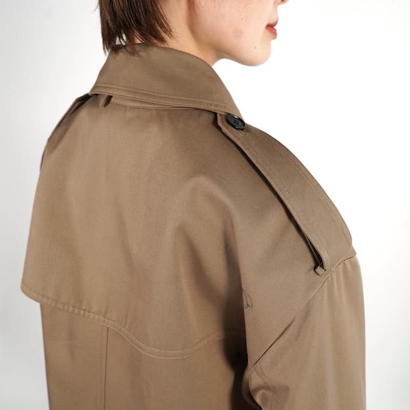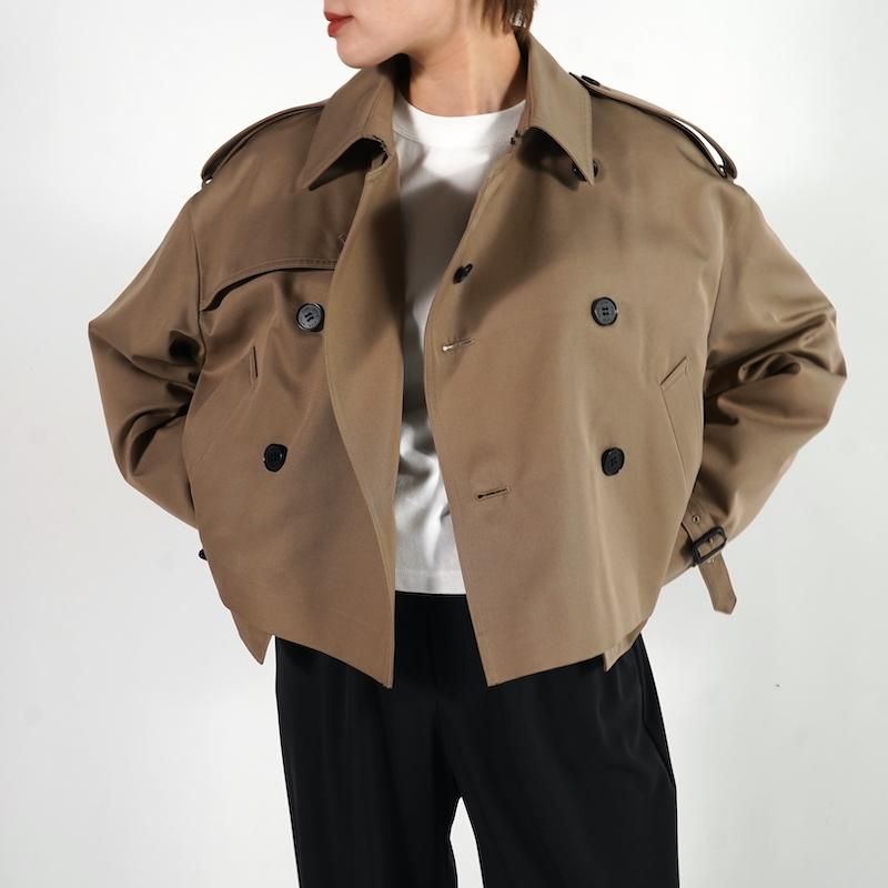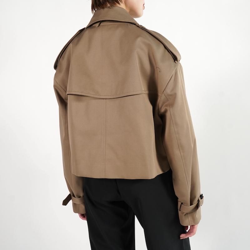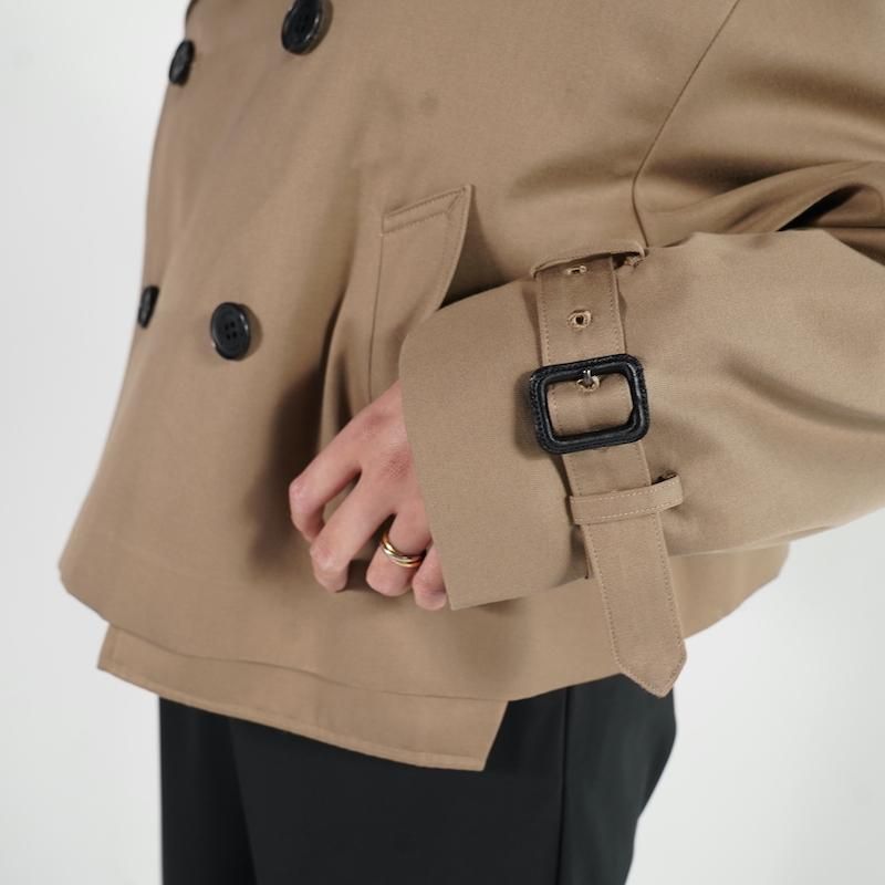 撥水加工が施された素材を使用したクロップドトレンチコート。