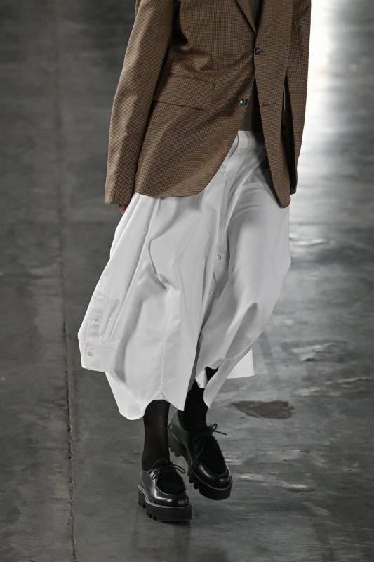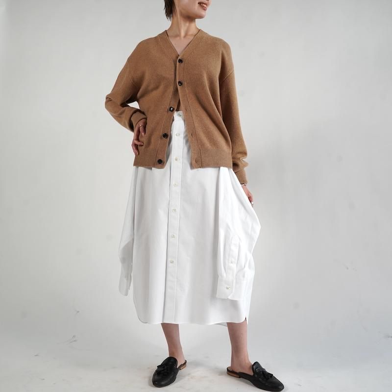 襟のように見える部分がウエストのなるシャツデザインのスカート。