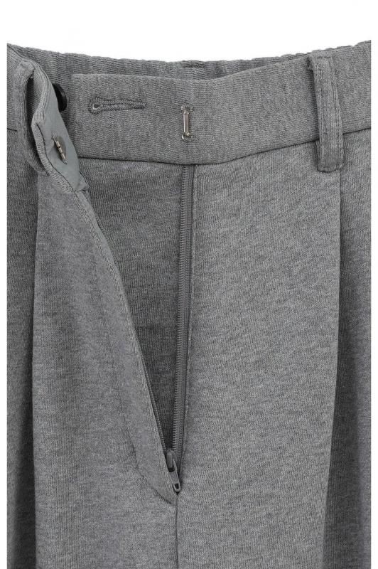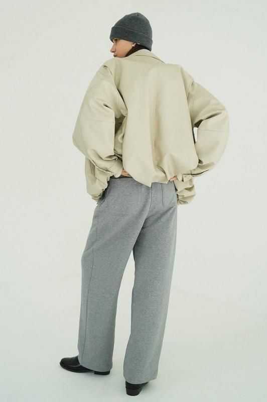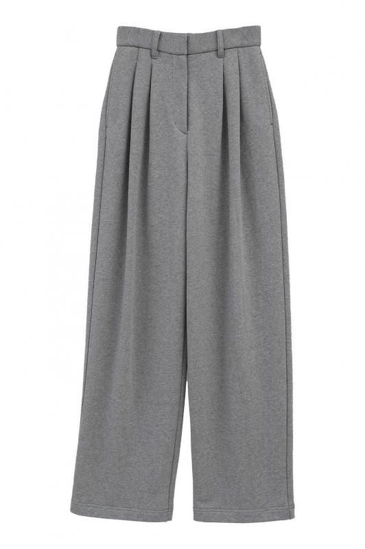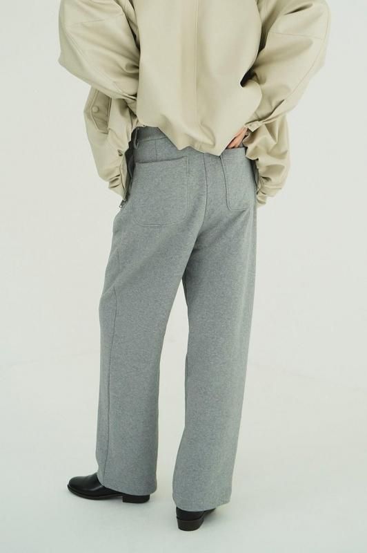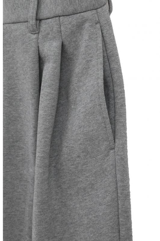 タックによって腰まわりにゆとりを持たせ、リラックス感のある快適な穿き心地に仕上げました。スウェット特有のカジュアルさは残しつつ、前開きのスラックス仕様でモードな雰囲気をプラス。ウエストは後ろがゴム仕様で、ベルトループ付きのデザイン。