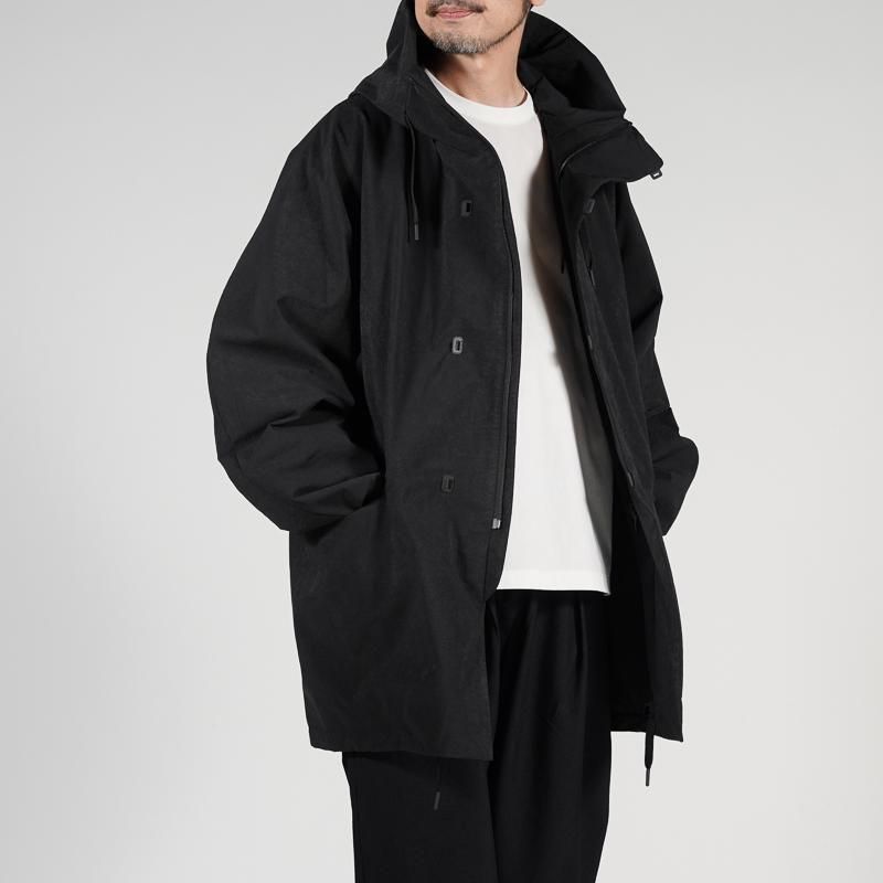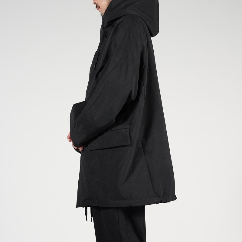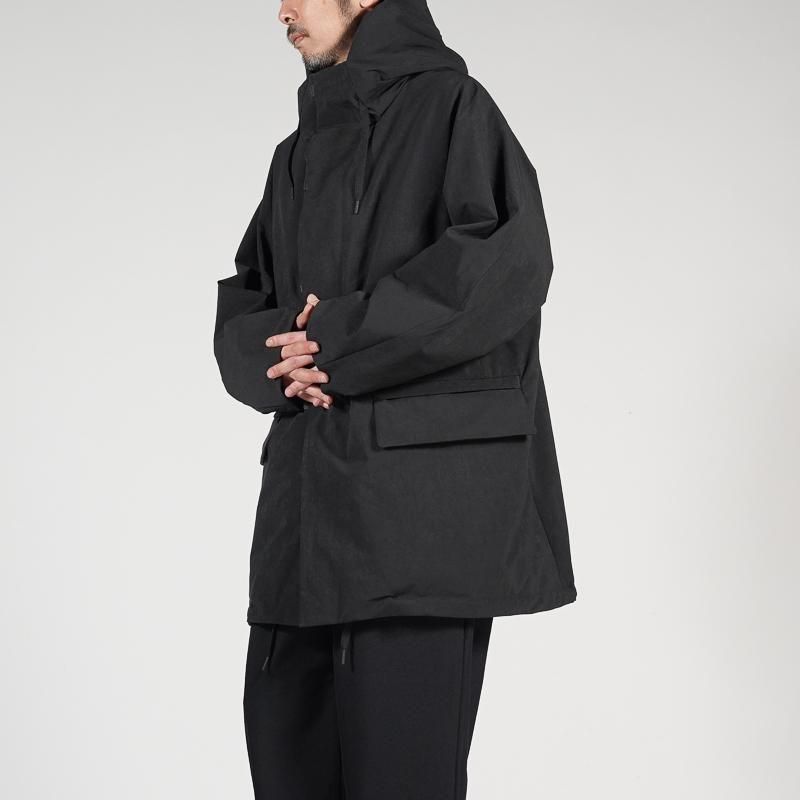 レインウエアの定番である3レイヤー素材をあえて使用せずハリやゴワつきを軽減。素材の表面自体もマットでソフトな印象に仕上げているため、シーンを問はずにガバッと羽織れる都会派な1枚に仕上がっていますのでシーンを選ばず雨によるストレスからユーザーを解放してくれます。