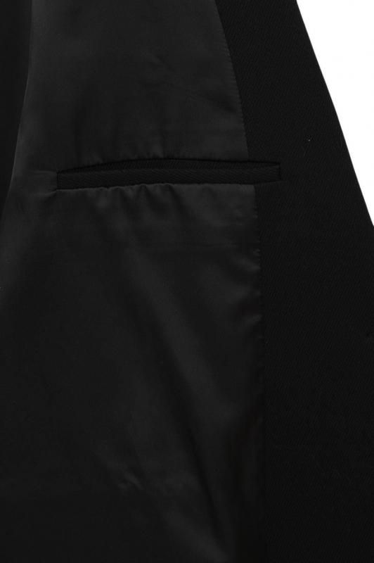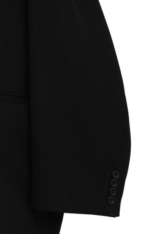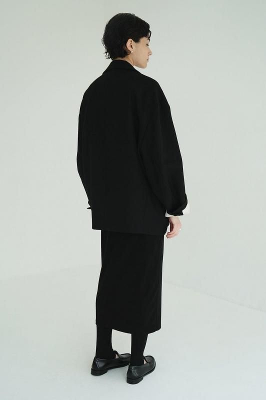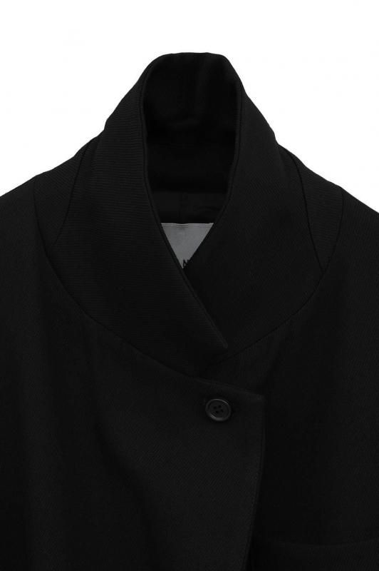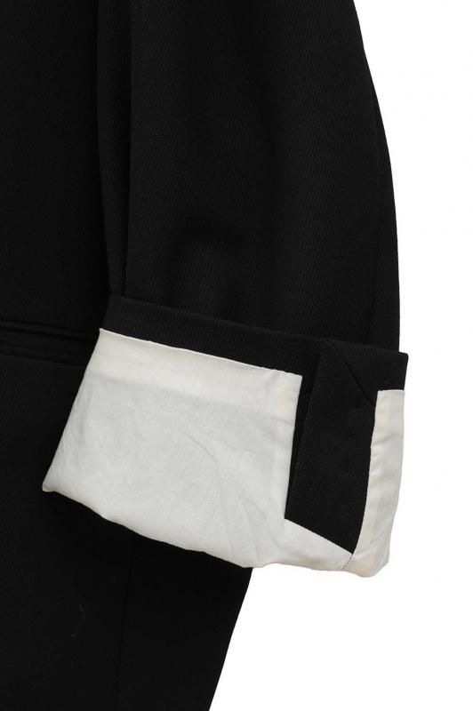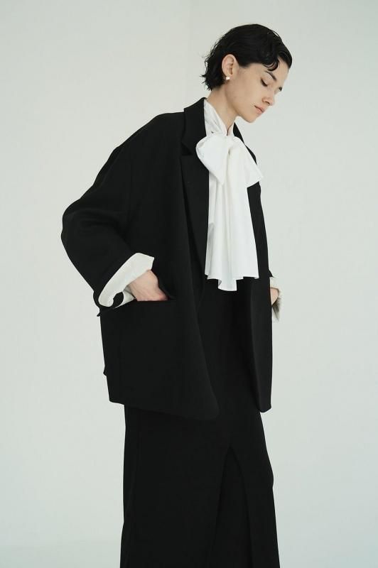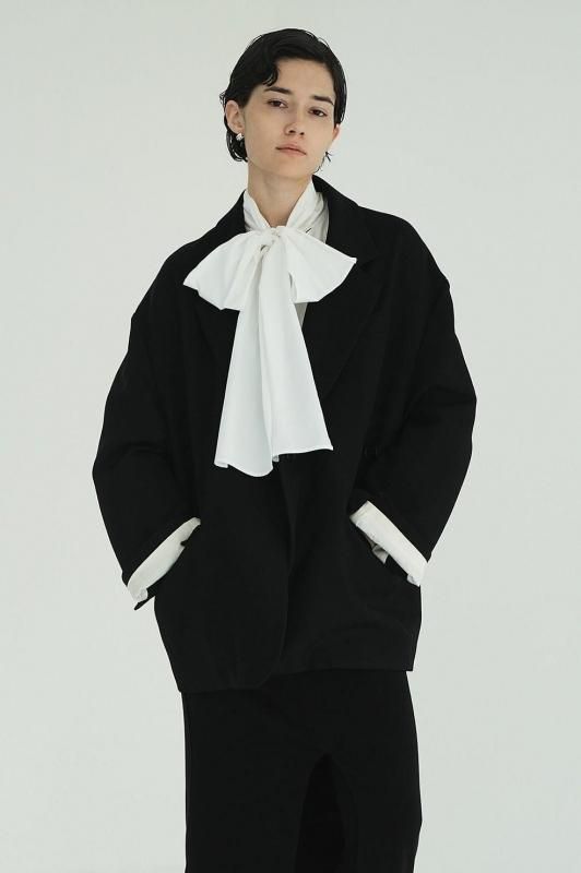 通常のジャケットシルエットに加え、左外脇に釦、右脇の内側に施したタブと釦ホールを留めることでウエストをシェイプした女性らしいシルエットでの着こなしが可能です。ラペルにも釦とホールを施しているので、襟を立てて違った印象の着こなしも楽しめます。