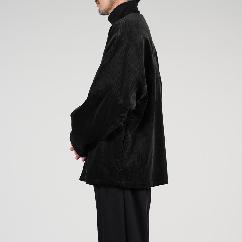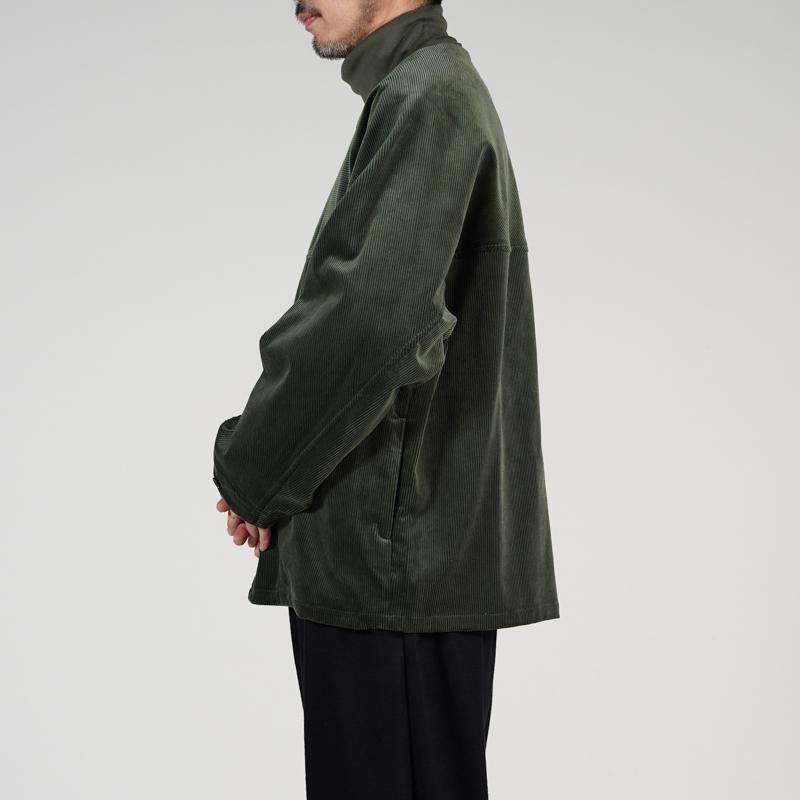 希少なスビンゴールドコットンを用いて織り上げたコーデュロイ生地。柔らかくしなやかな手触りと、太い畝一本一本の深味ある光沢、さらに美しい発色が特徴的な上品な素材。前後に配したヨークスリーブとカラーレスのネックラインが特徴的なジャケット。