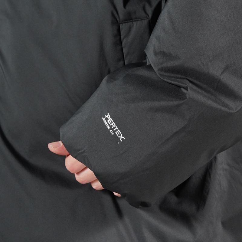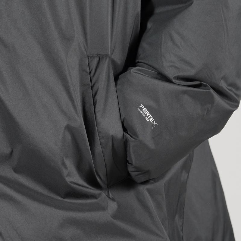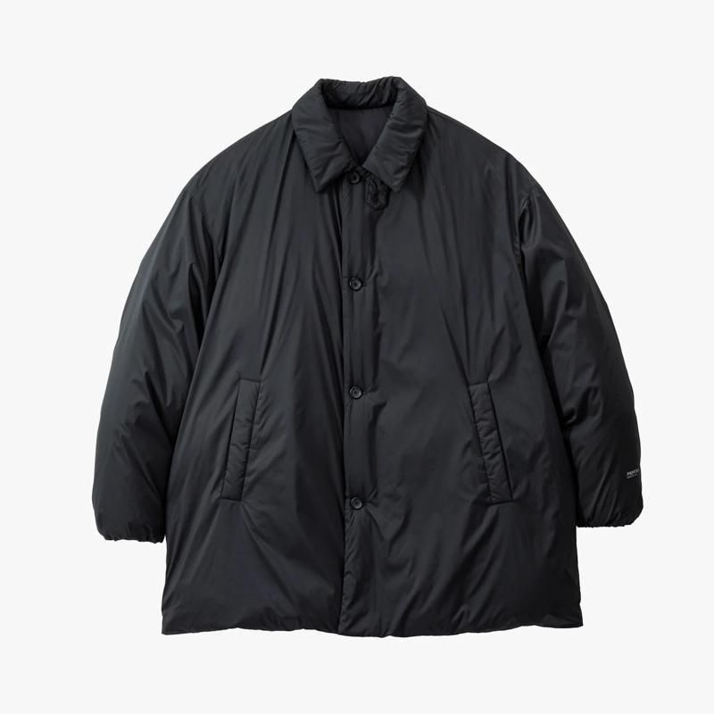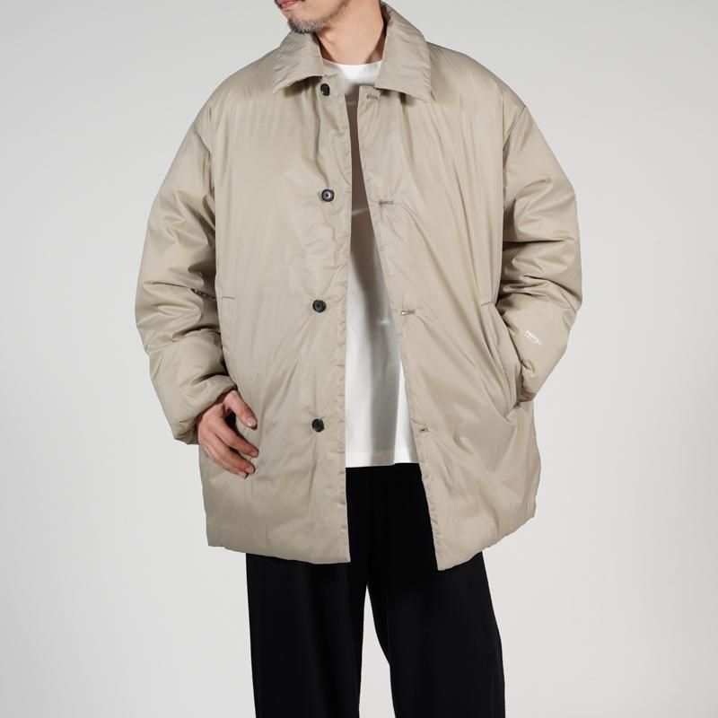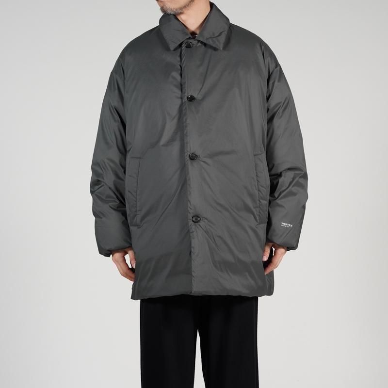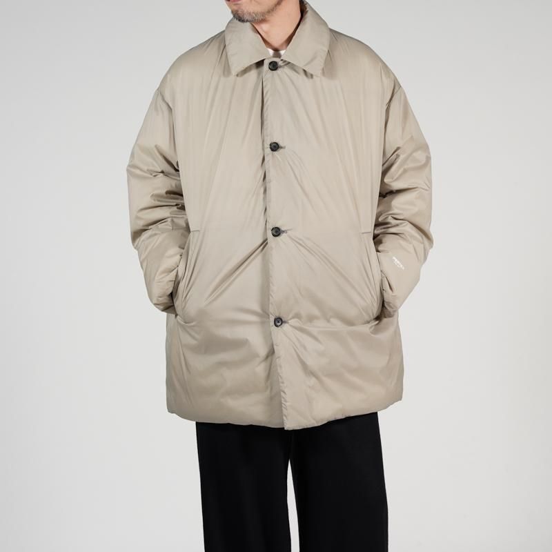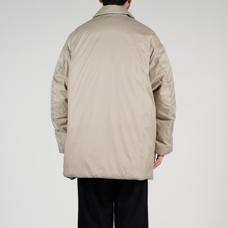 非常に細いナイロンを高密度に織り上げた、優れた耐久性と防風性を誇るPERTEX QUANTUM AIR_を使用したバルカラーコート。贅沢にダウンを詰め込み、高い保温性を持つ。表面はキルトやギャザーといった装飾を省きフラットに仕上げたクリーンな一着。