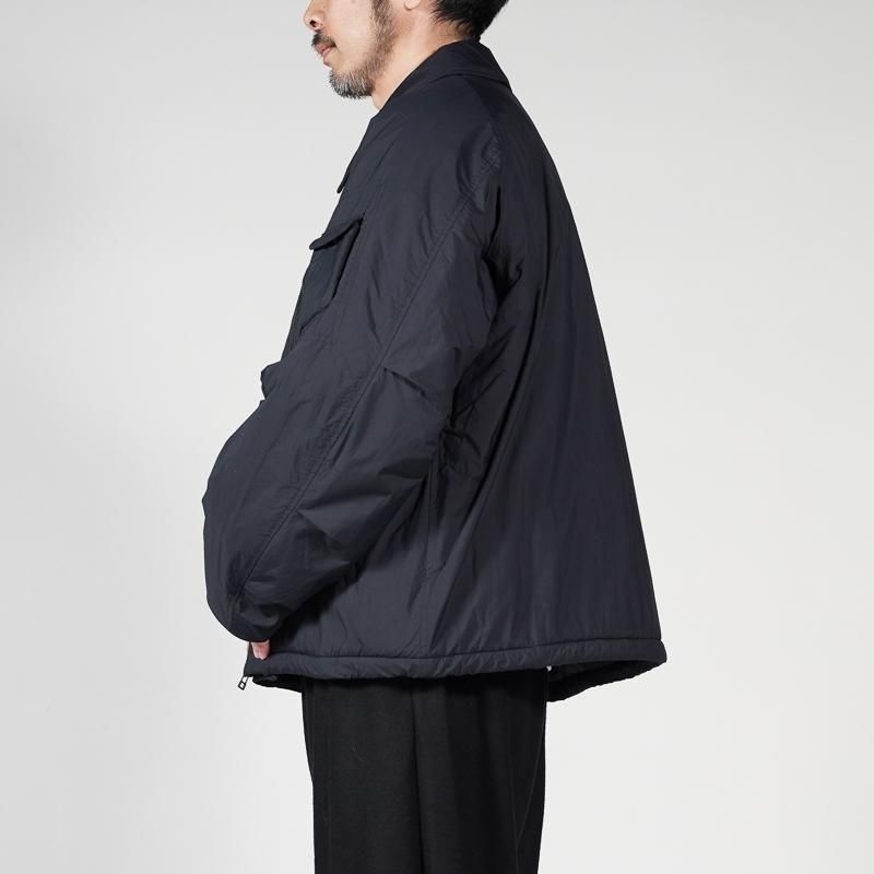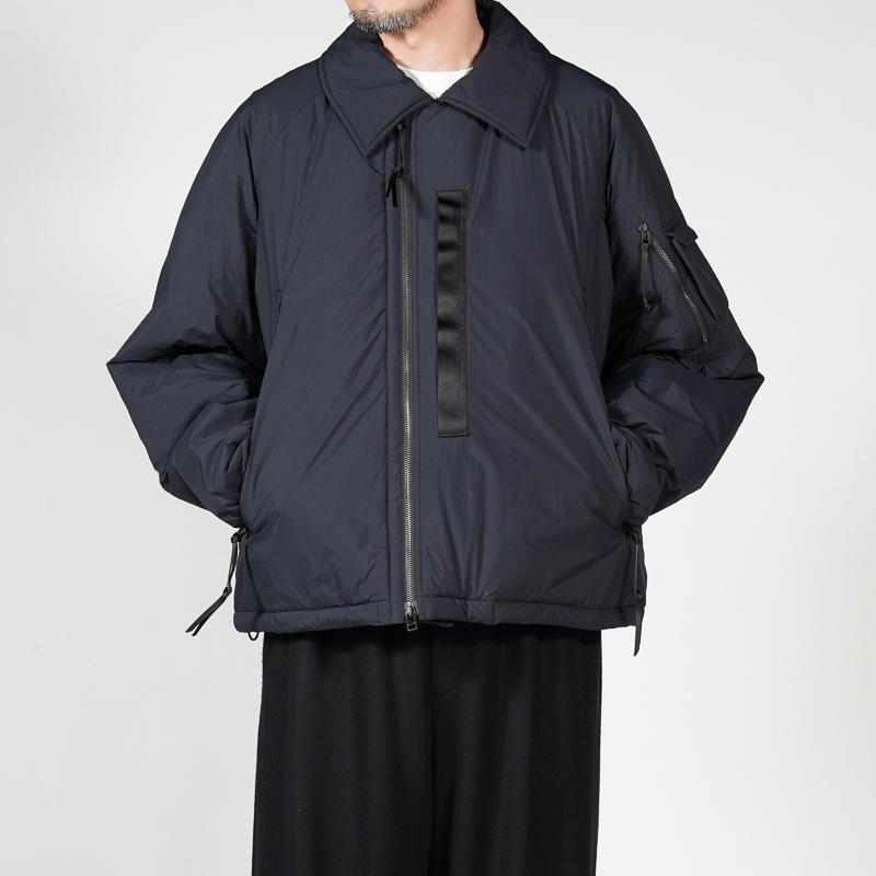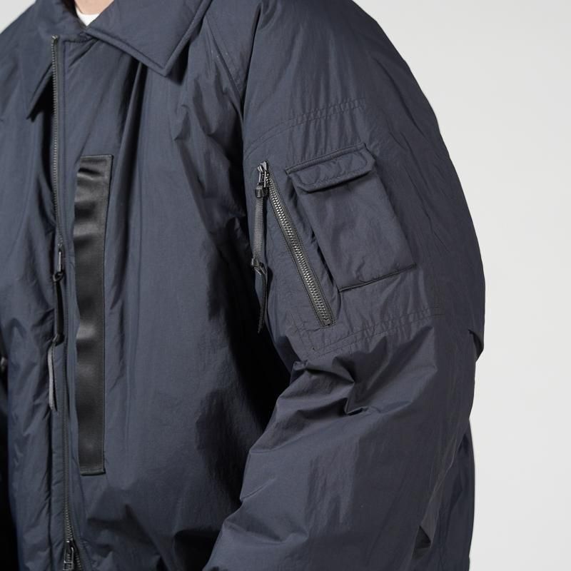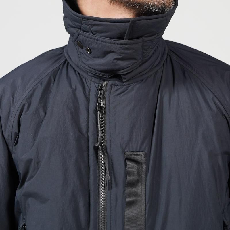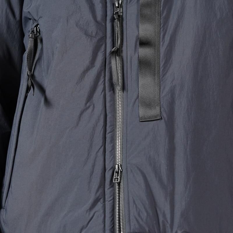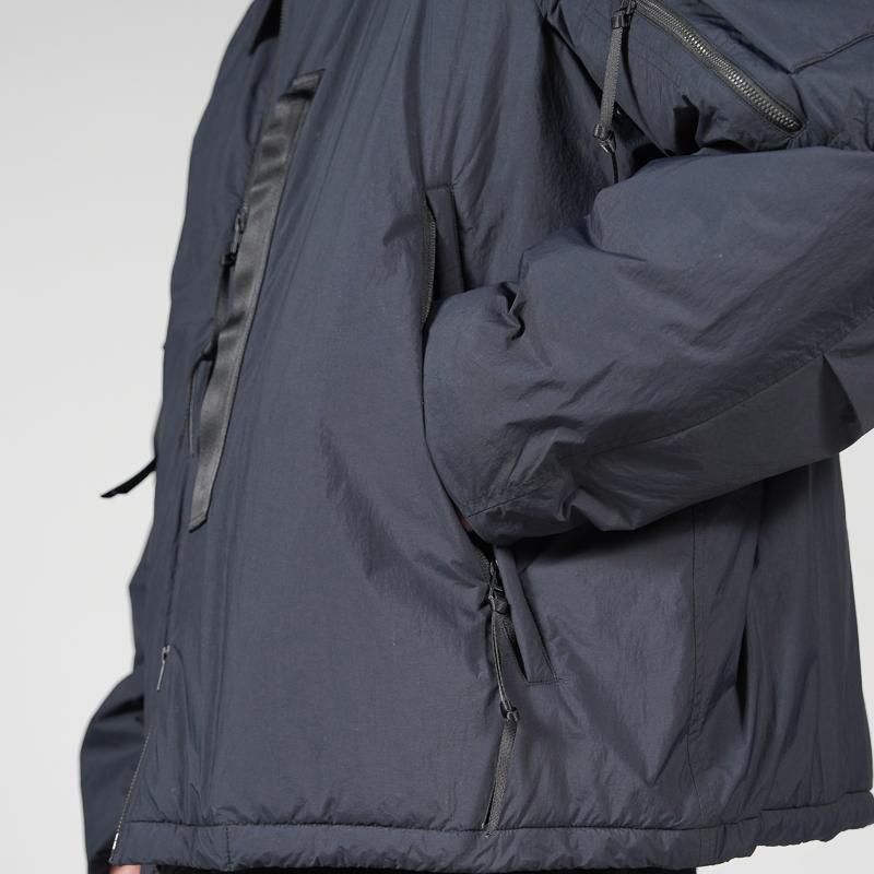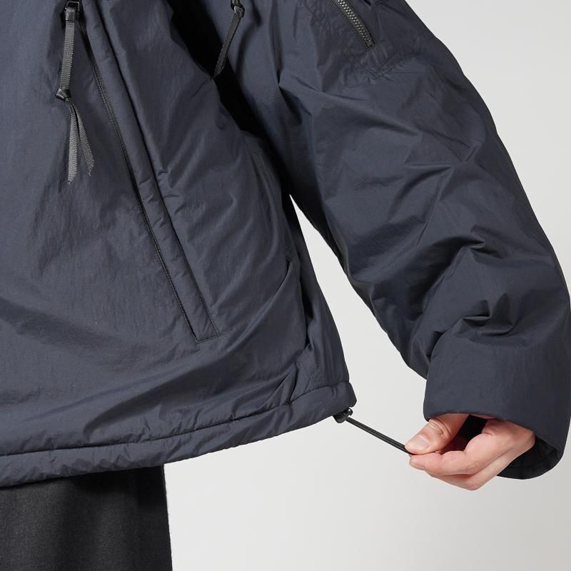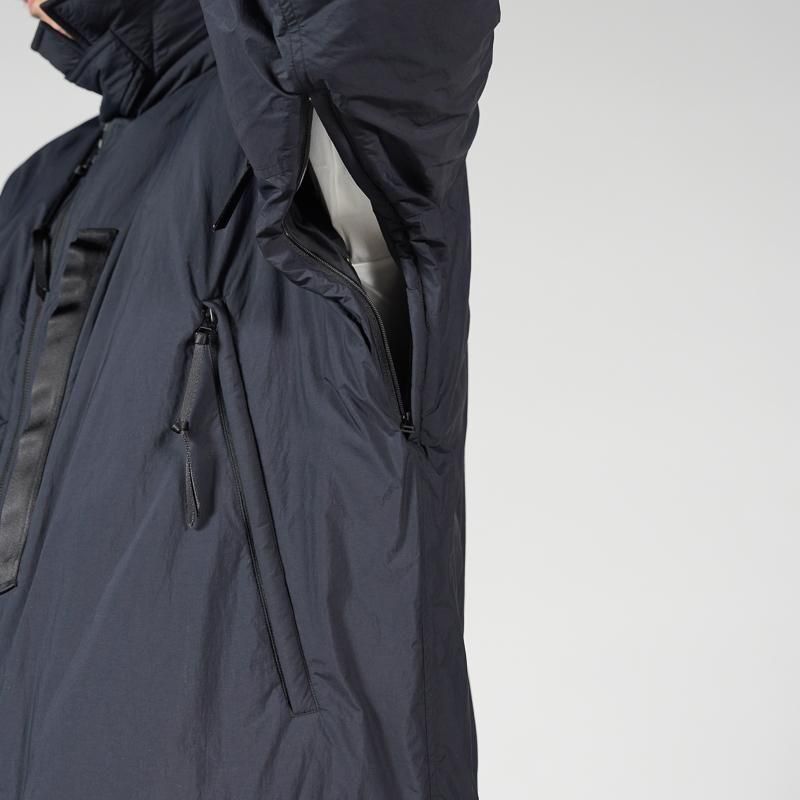 脇下のマチ、肘部分のタックにより、快適な動きをサポート。チンストラップを留めた際、顔に生地が当たるストレスを解消するため、首周りに空間が生まれるパターンを採用。脇下、肘内側の中綿を抜き、脇下にはファスナーで開閉できるベンチレーションを配置することで、暖かさを保ちながら湿気だけを逃し、着心地の良さを実現。大容量の内ポケットや、服を脱いだ際に2wayで背負える(両肩掛け、斜め掛け)ディテールを採用。裾口のスピンドルは、シルエット調節だけでなくウィンドストッパーとしても機能。左袖部分には、iPhoneとカードが収納できるポケットを配置。
