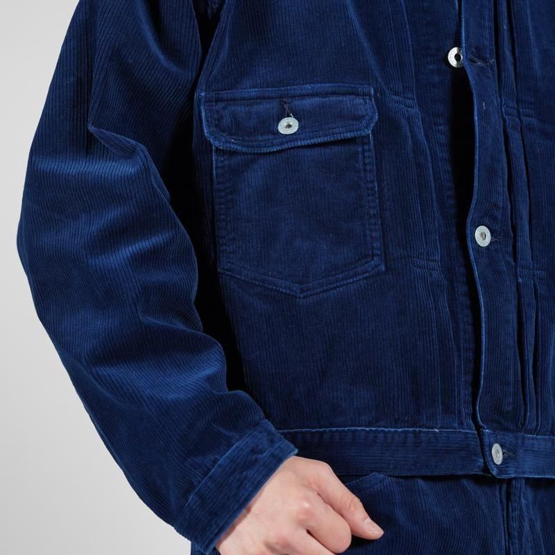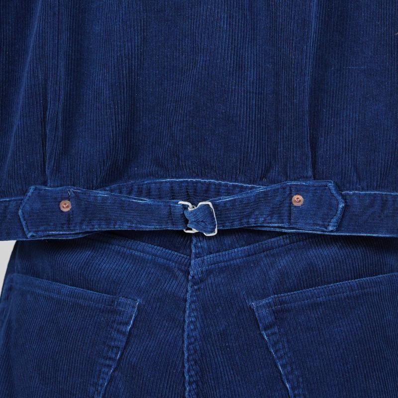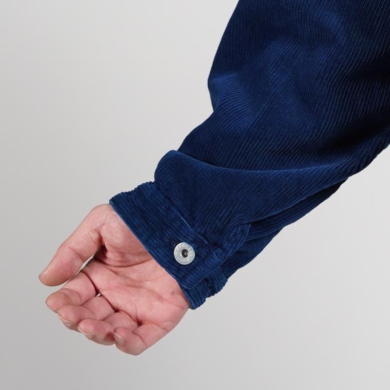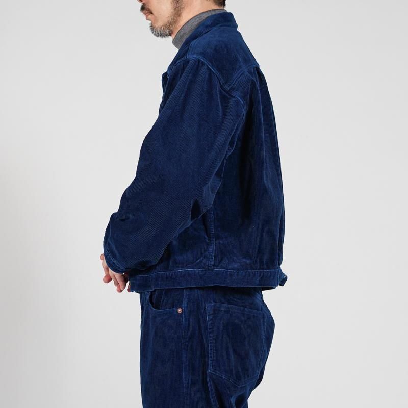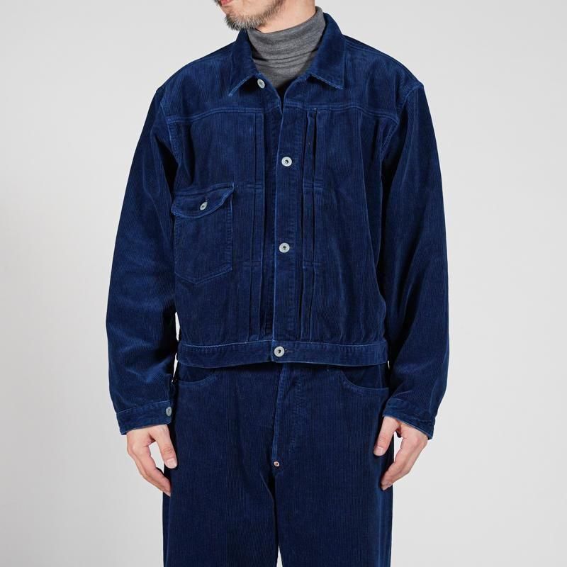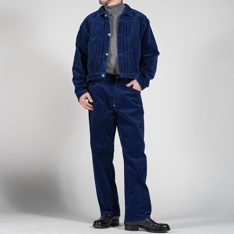 前回は大量生産された12ozの普遍的なデニム生地でつくりましたが、今回は太畝のコーデュロイ生地を採用しているので、高級感があって、しっかりと迫力のある仕上がり。やや重たい生地を使っているのもあり、ドレープの出方も抜群です。