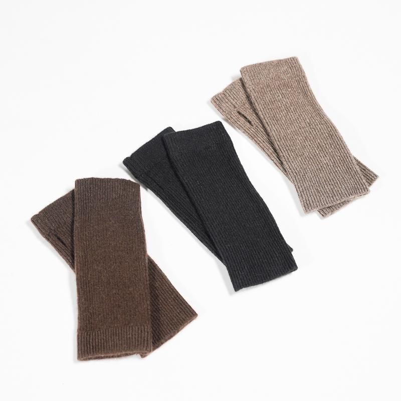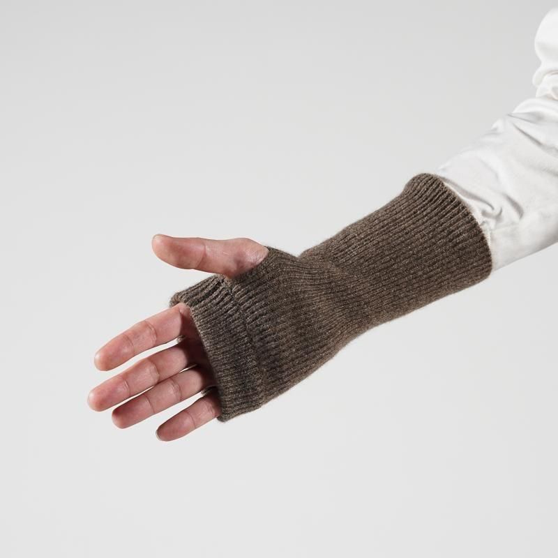アームカバーとサムホールタイプのグローブを掛け合わせた、ありそうでないデザイン。トップスの袖に被せるようにしたり、中に潜り込ませたりと様々な付け方に対応。シャツやニットなど、合わせるトップスを選ばないことも魅力です。編地は9ゲージの天竺編みで、ヤクの質感をフルに活かすように、ふんわりと柔らかな質感となっています。常に飽きずに愛用できるベーシックアイテム。指が出ていると寒そうなイメージですが、実際はそこまでの寒さはなく、事あるごとに着脱するストレスから解放されます。使い込むごとに風合いも良くなり、愛着が増す手袋。自分好みに育てて楽しんで下さい。