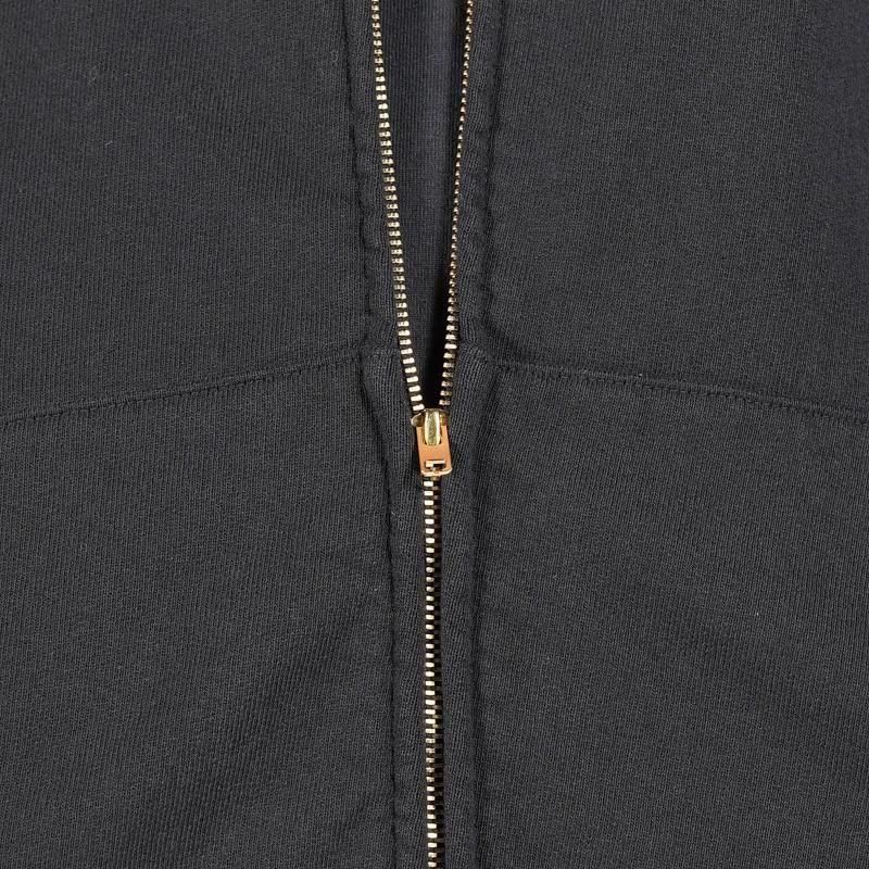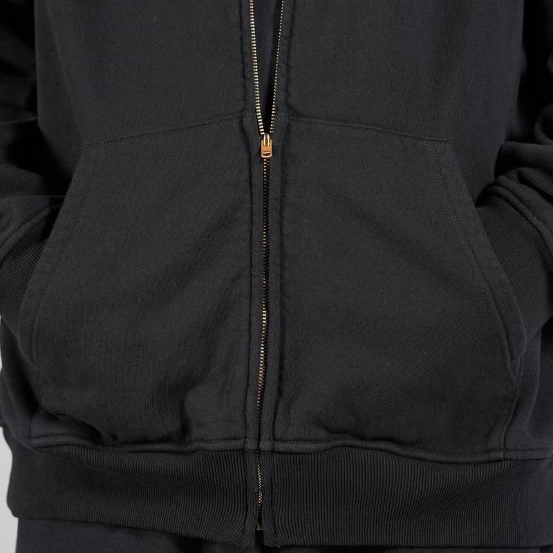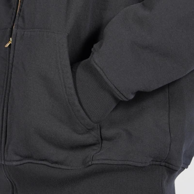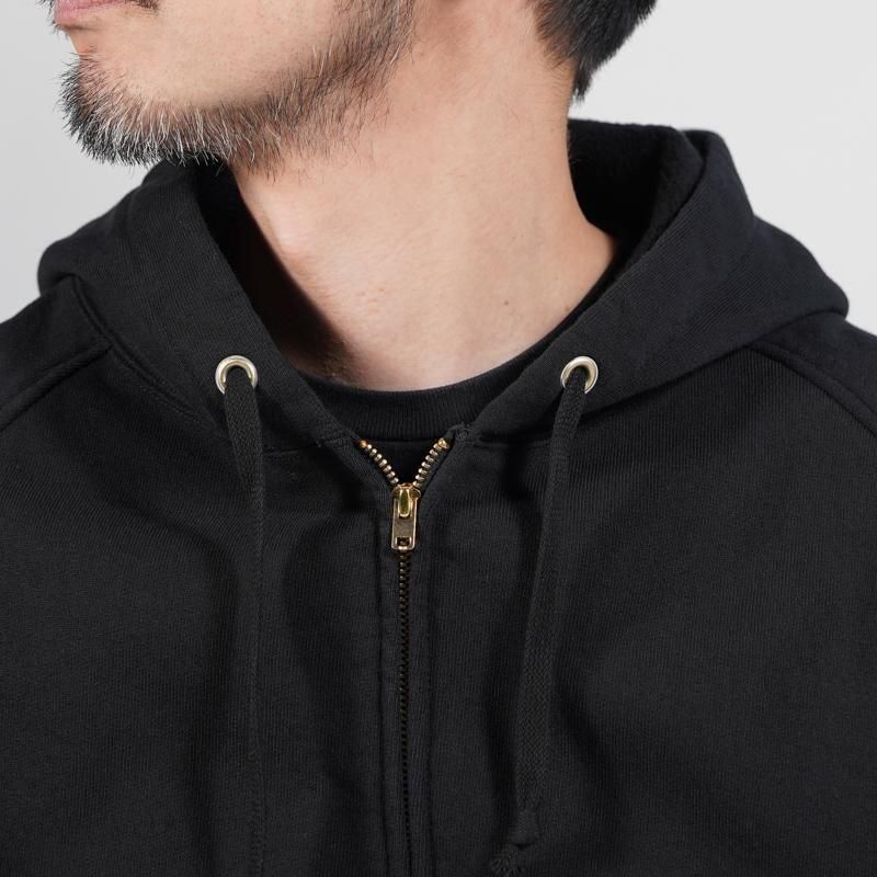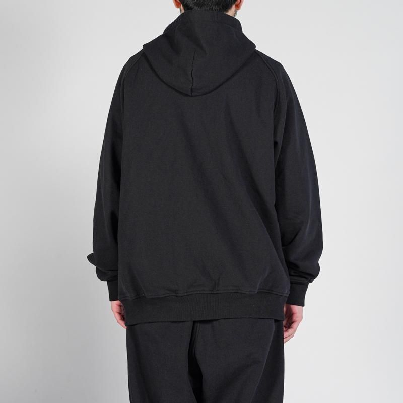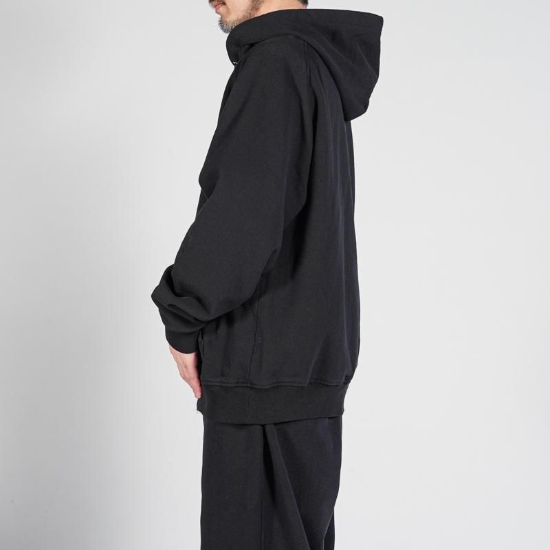ブランド定番の裏毛ジップパーカ。全体的にややゆとりのあるシルエット。ラグランスリーブ。裾、袖口はリブ仕様。黒のスウェット上下を着用しアウターを羽織ると、コーディネートを悩まずシンプルに楽でかっこよく見えるスタイルだと思います。